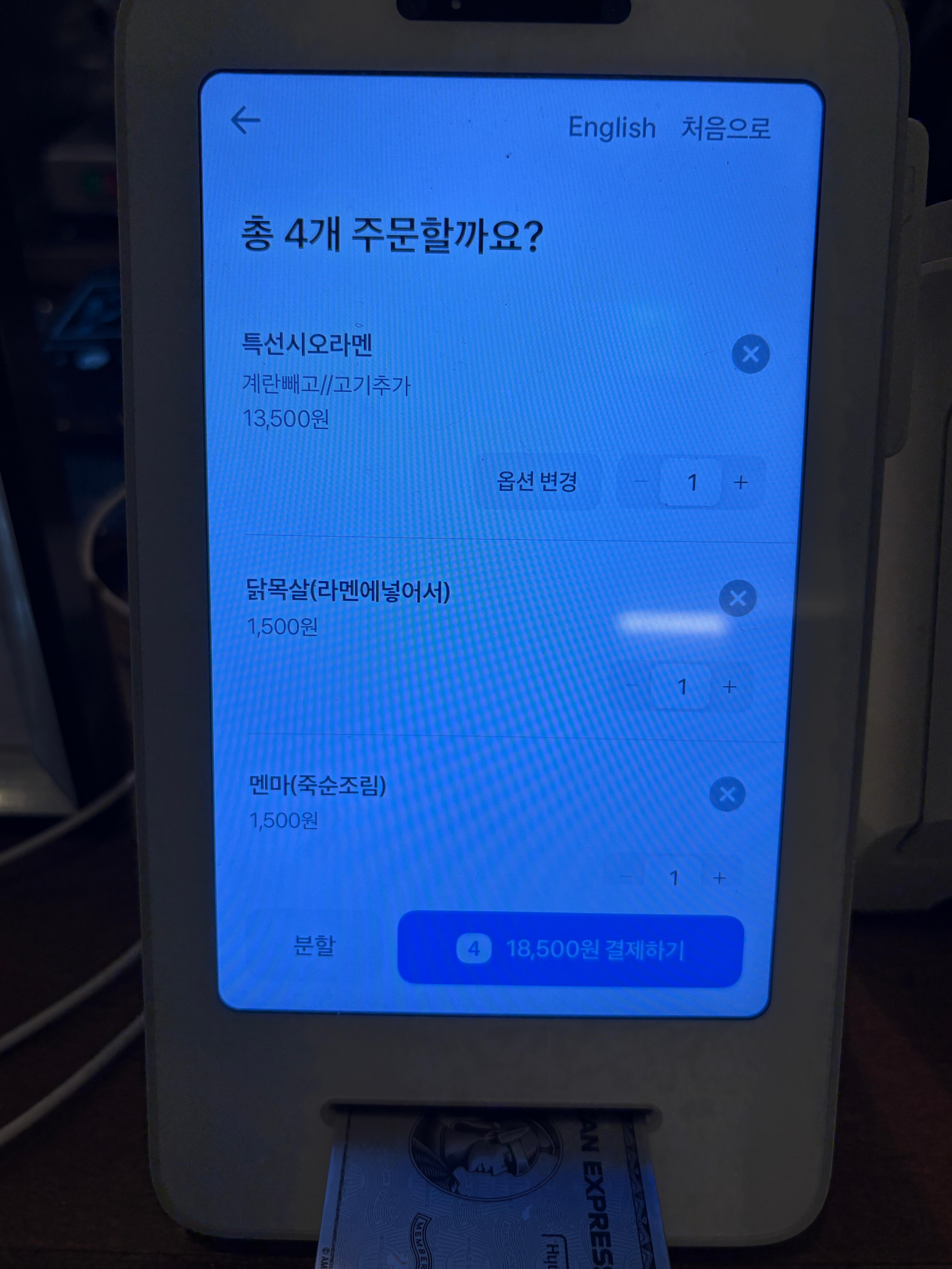 따로 사이드메뉴가 고기밥 밖에 없기때문이기도 하고, 키오스크가 매우 작고 귀엽습니다 ㅎㅎ 시오라멘과 쇼유라멘 두종류를 판매하고 계시구요, 토핑 추가에 따라서 특선메뉴가 따로 있습니다.