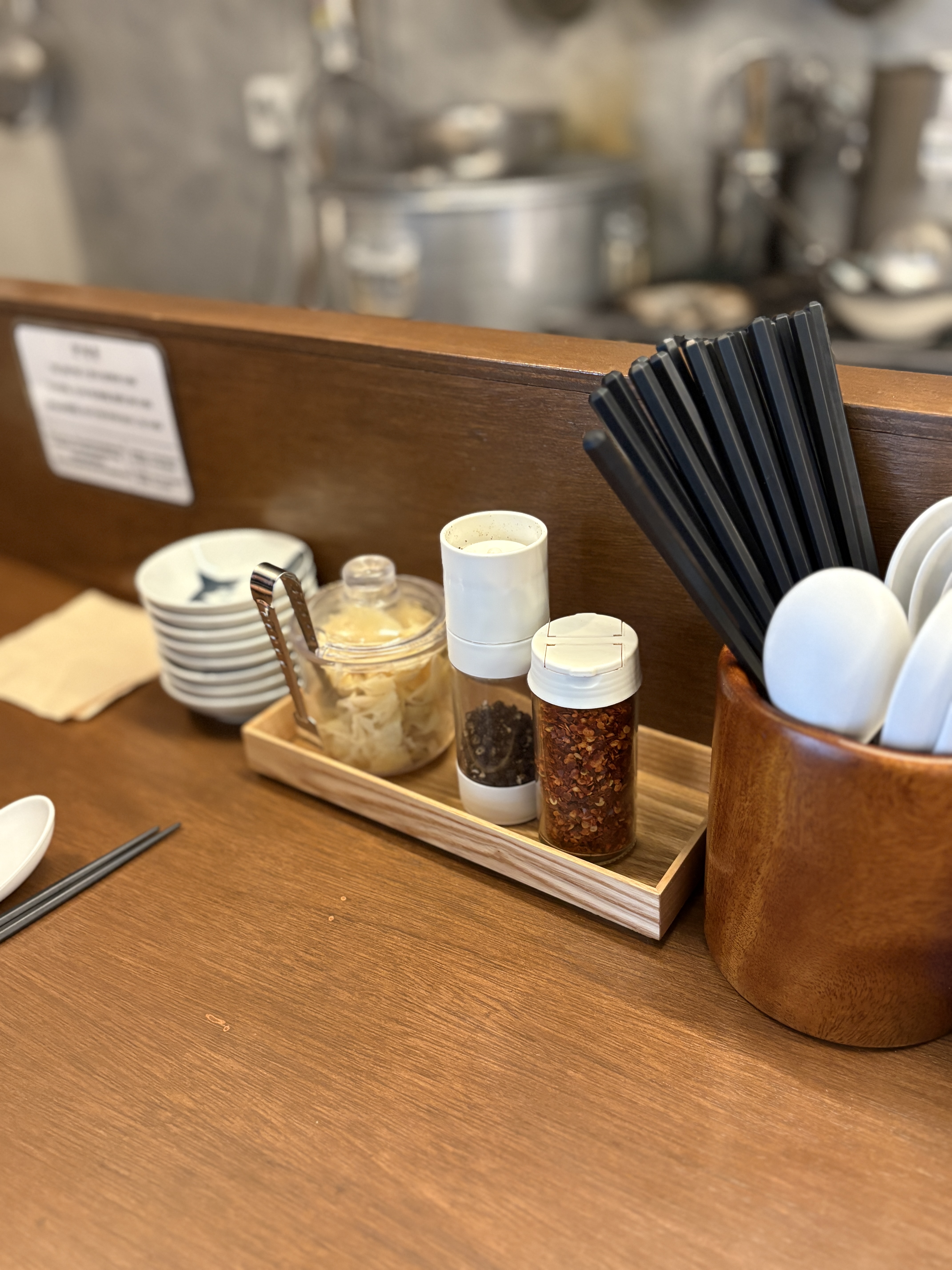 바 테이블 석 앞에 놓여진 꾸미들. 통후추를 갈아서 뿌릴 수 있게 되어있구요, 레드홀페퍼가 있는게 특징입니다. 반찬 메뉴는 초생강 하나로 단촐하네요 ㅎㅎ