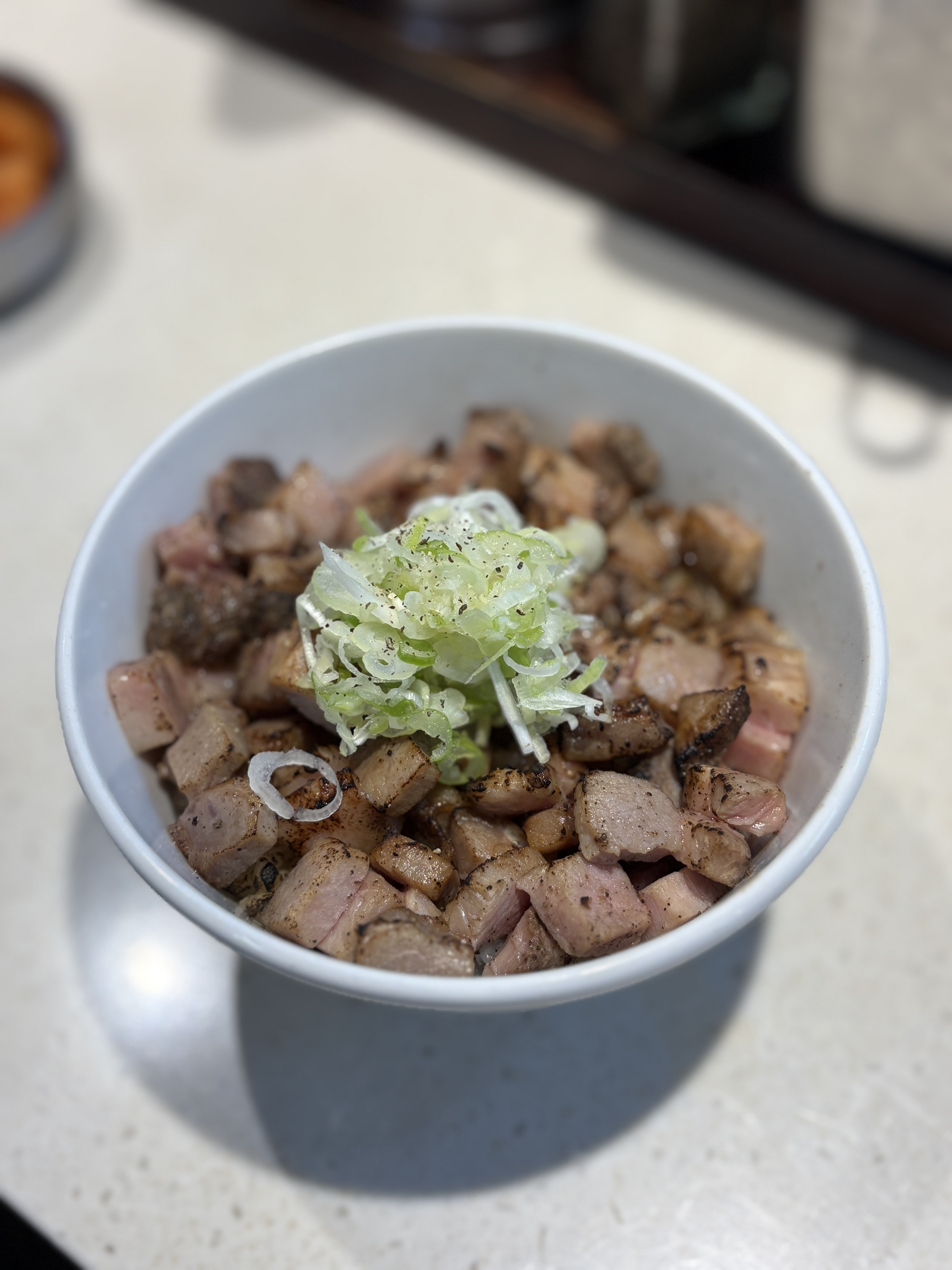주문후 먼저 나온 것은 차슈밥입니다. 깍둑차슈까진 아니지만 네모난 모양으로 잘려진 차슈가 듬뿍 올려져있습니다. 차슈동과는 또 다른 매력인데요, 어찌보면 가격이 좀 있다고 느껴질 순 있습니다만 전 만족하면서 먹었습니다. 타래도 뿌려져있어 감칠맛도 굿!