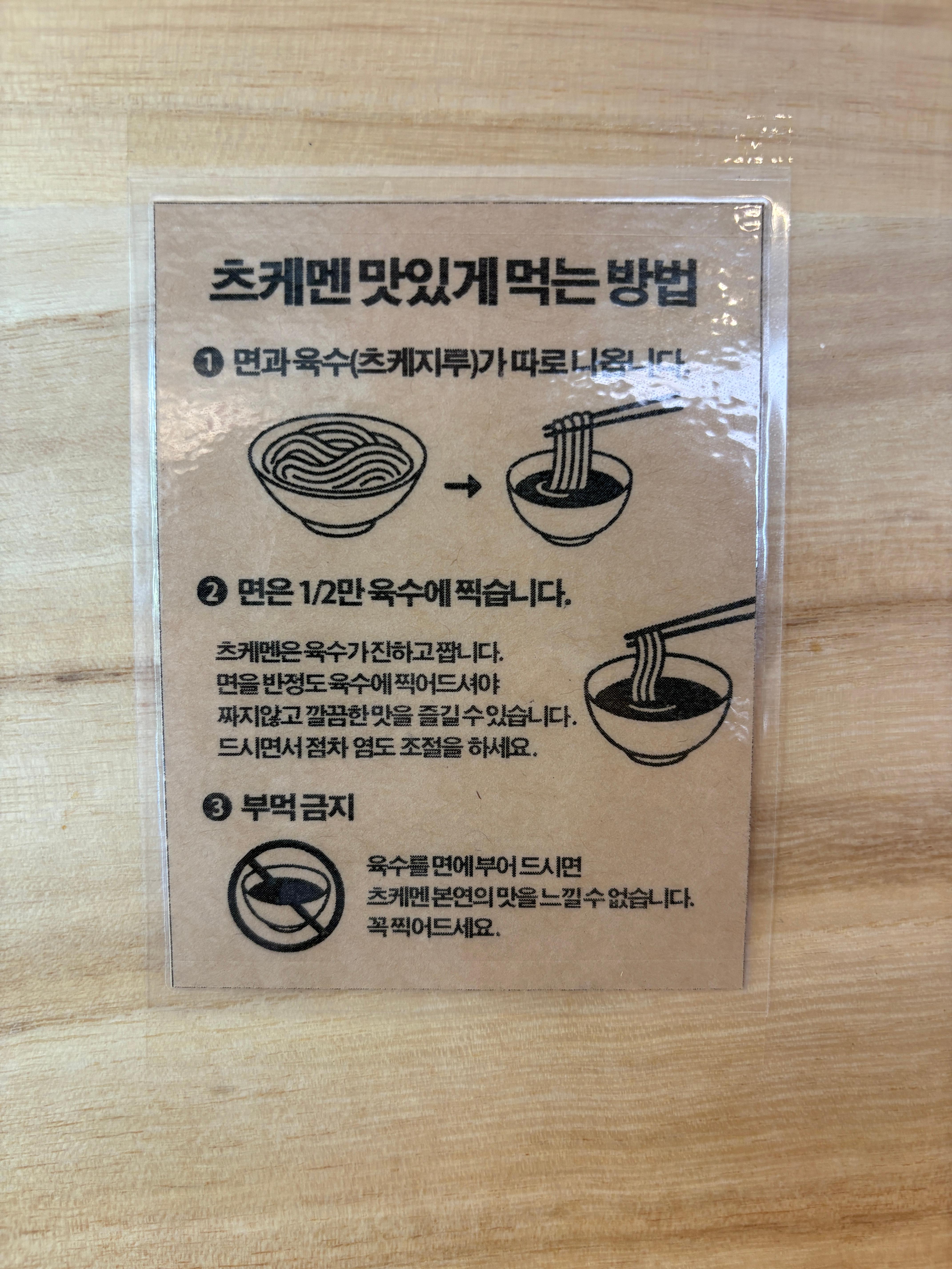 츠케멘 먹는 방법에 대해서도 그림과 함께 설명이 적혀있습니다. 츠케멘의 최대 장점이라 할 수 있는 원하는 만큼 찍어먹는 방법이죠 ㅎㅎ 가끔 츠케멘 잘 모르는 분이 시킨 후에 면을 전부 츠케지루에 투하하거나, 면기에다가 츠케지루를 그대로 부어버리는 경우를 본 적이 있어서 이런건 필수로 붙여두는게 맞다고 생각합니다 ㅎㅎ