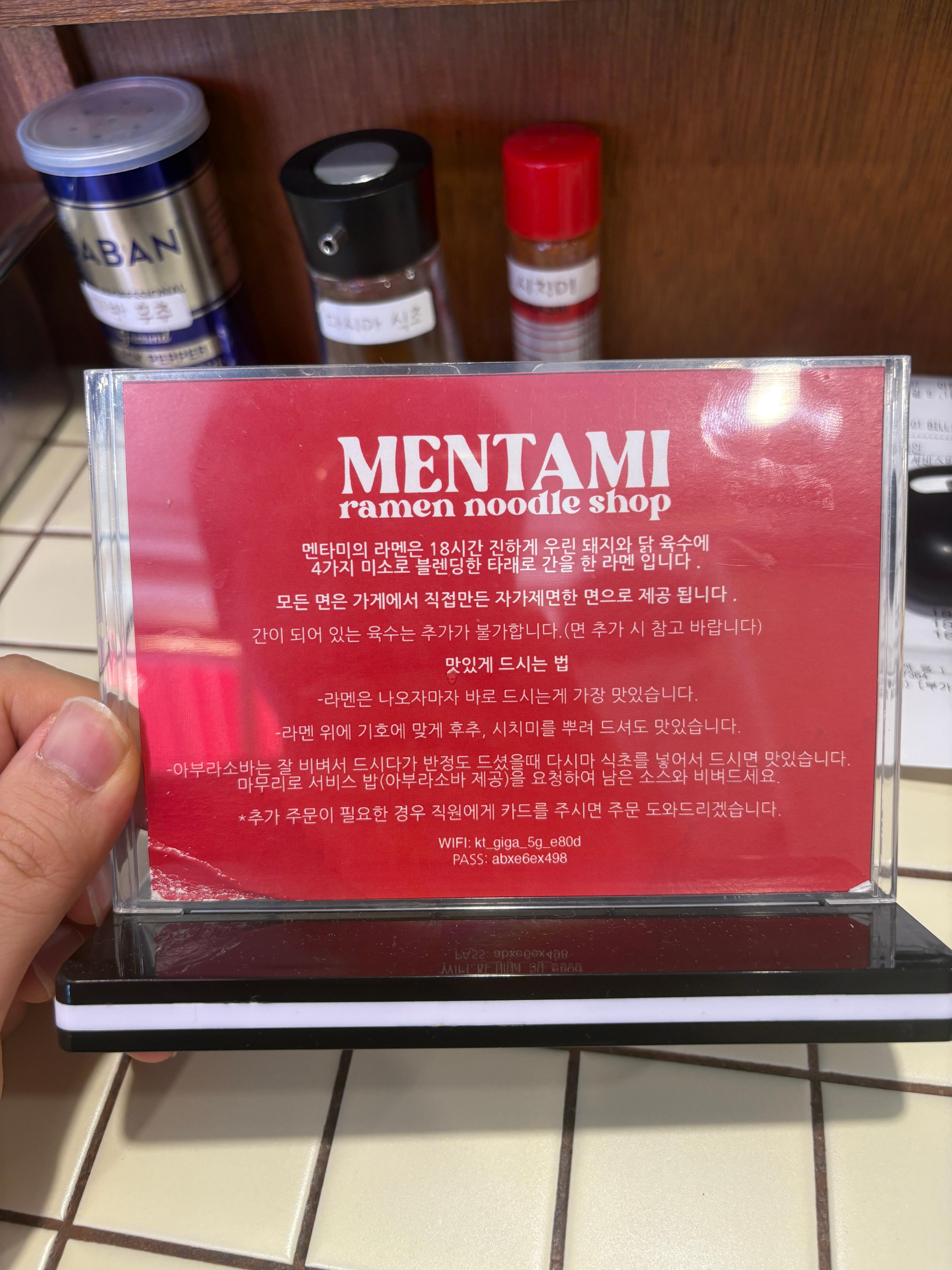 스프는 돼지와 닭을 블렌딩하였고, 4가지 미소를 이용한다고하네요. 미소라멘은 북해도 여행을 갔을 때를 제외하면 일본을 방문해도 잘 발걸음이 가지가 않고, 국내에서는 더더군다나 한국인들에게 호불호가 있어서 그런지 맛집이 많이 알려지지 않아있는데요. 이곳 멘타미의 경우 미소라멘을 대표메뉴로 표방하기도 하고 라오타들 사이에서도 이곳의 아부라소바와 한정메뉴인 새우츠케멘이 호평일색이어서 2회나 방문을 했습니다. 첫 방문때는 조금 늦게갓더니 츠케멘이 동나버려서.. 다음에는 오픈런을 했다는.. 2025년 9월 현재 새우츠케멘은 오전 오후 10식으로 수량이 제한되어있습니다. 주말에는 오픈 30분전에 가서 기다려야 먹을 수 있다는..
