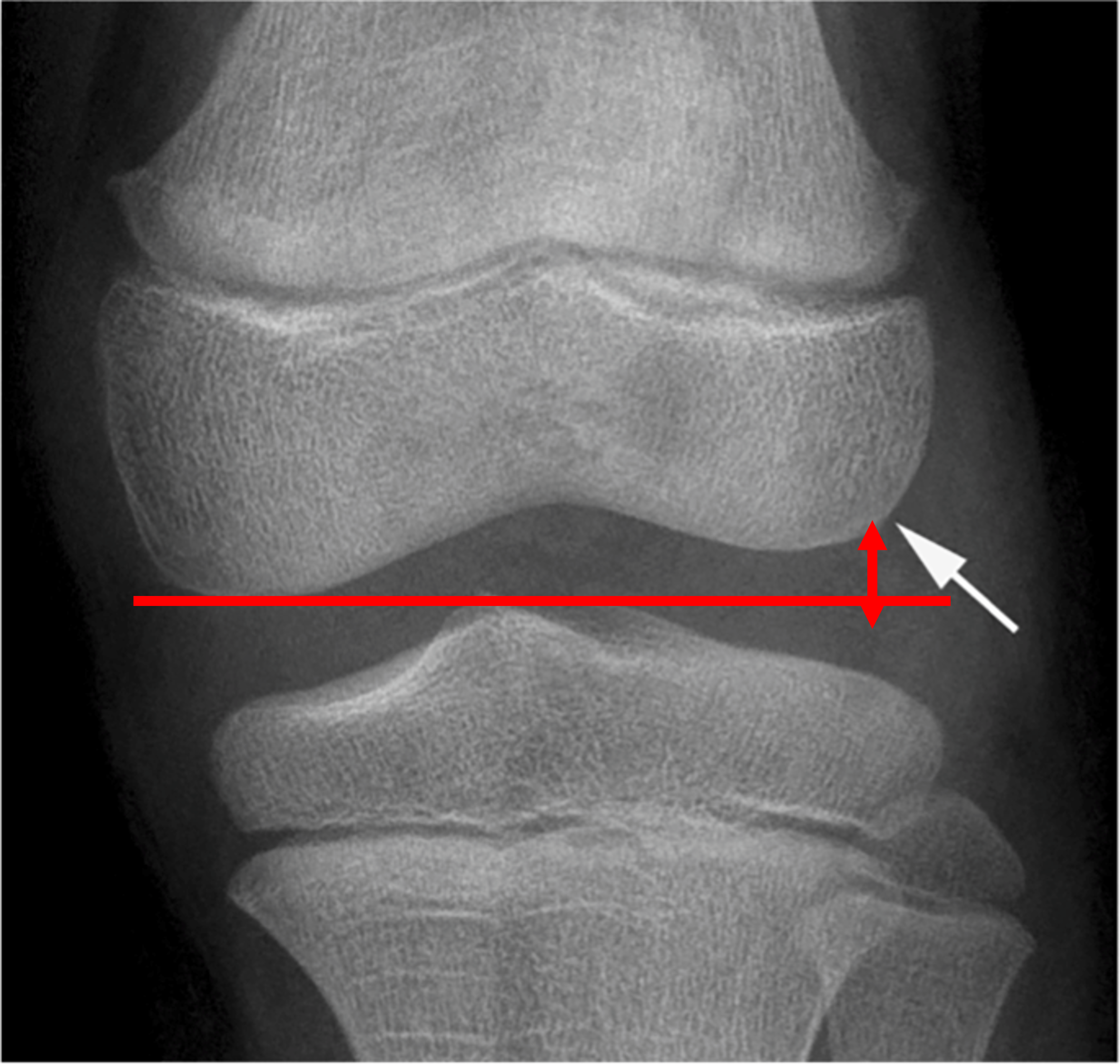반월상 연골 질환에서 X-ray는 반월상 연골이 쉽게 찢어질 수 있는 질환인 원판형 반월상 연골 (추후 링크 추가 예정.) 등을 감별하는데 도움을 줄 수 있습니다. 원판형 반월상 연골은 반월상 연골을 구성하는 콜라겐 섬유의 조성이 일반 반월상 연골과 달라 내구성이 떨어지고, 특징적으로 반월상 연골이 무릎 관절 중앙부로 갈수록 얇아져야하지만 두께가 유지되는 모양으로인해 X-ray상 대퇴골선 정상적인 환자와 비교하였을 때 올라가있고 비교적 평평한것을 볼 수 있습니다.