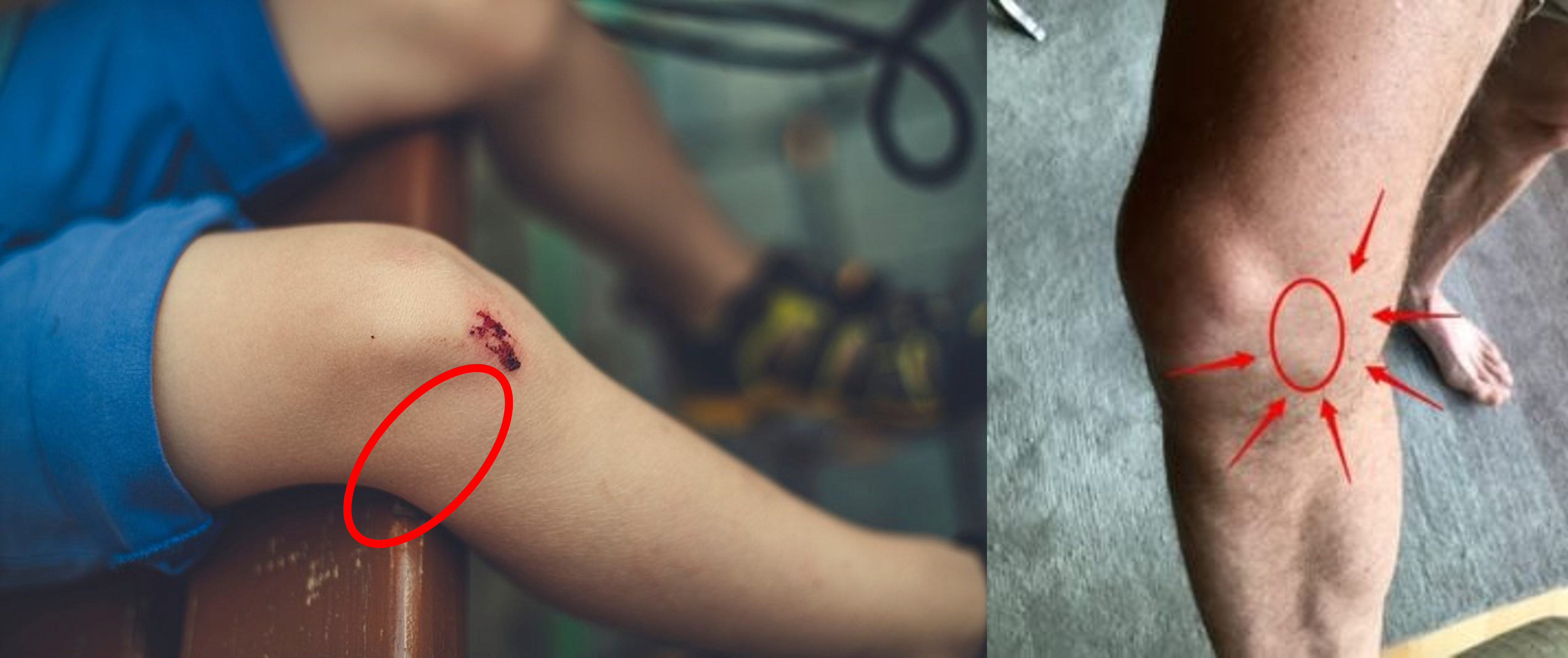 마지막으로 가장 중요한 증상은, "압통"입니다. 압통이란, 환부를 눌렀을 때 통증을 호소하는 것을 말합니다. 반월상 연골은 콜라겐 섬유로 이루어져 있기 때문에, 신경 가지가 안까지 뻗어있지 못합니다. 따라서, 설사 찢어졌다고 하더라도, 그것을 감지할 수 있는 신경 자체가 반월상 연골에는 없기 때문에, 간접적으로 반월상 연골 주변의 관절낭 등의 염증을 촉지함으로써 감지할 수 밖에 없습니다. 이때 주로 압통이 발생하는 지역은, 위 사진에 표시한 곳으로, 반월상 연골이 파열될 경우 염증 물질이 해부학적으로 모일 수 밖에 없는 위치에 해당합니다.