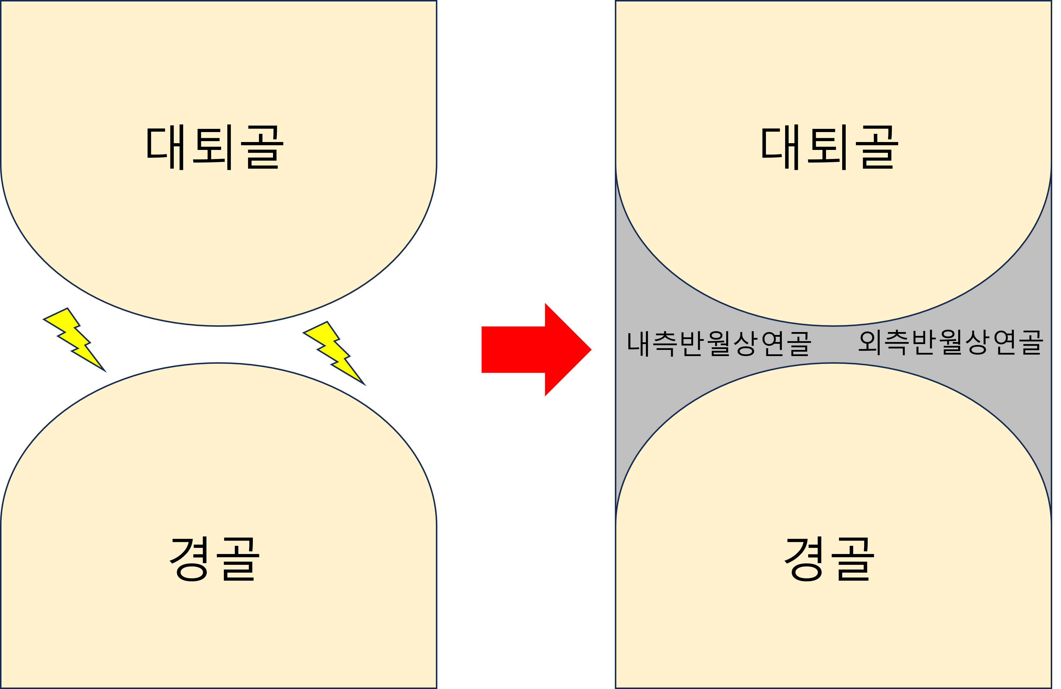 무릎 관절은 위로는 대퇴골, 아래로는 경골이 만나 이루어지는 관절입니다. 두 뼈 모두 평평하지 않고 굴곡이 있기 때문에 안정적인 구조를 이루기가 힘듭니다. 이를 아래 그림처럼 반월상 연골이 공간을 채워줌으로써, 우리 무릎이 안정적인 구조를 유지할 수 있게 만들어줍니다. 이는 또한 무릎을 구부리고 펼 때 관절을 감싸는 관절낭이 내부에서 걸리지 않게 해주며, 운동의 윤활 역할 또한 담당합니다.