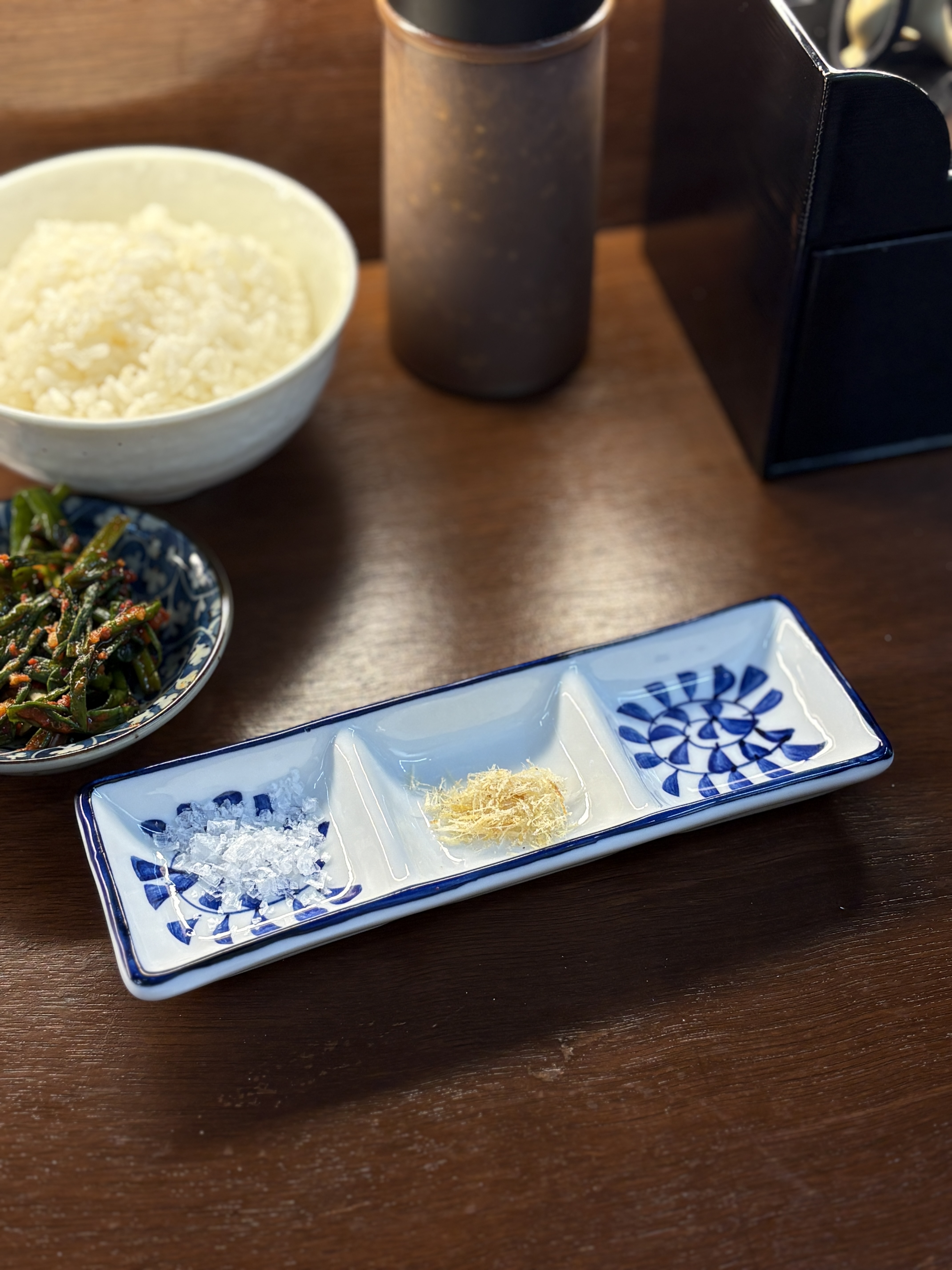 카츠 하나비의 자랑 중에 하나인 황태소금입니다. 황태를 말려서 간을베이게 하고 갈아내어서 소금처럼 찍어 먹을 수 있게 만들었네요. 말린 생선에서만 나는 특유의 감칠맛이 짠맛과 더해져서 훌륭한 소금이 되어줍니다. 황태의 향이 세면 돈카츠 맛과 싸우는 일이 생길 수 있는데 조절을 잘 하셨는지 매우 잘 어우러졌습니다.