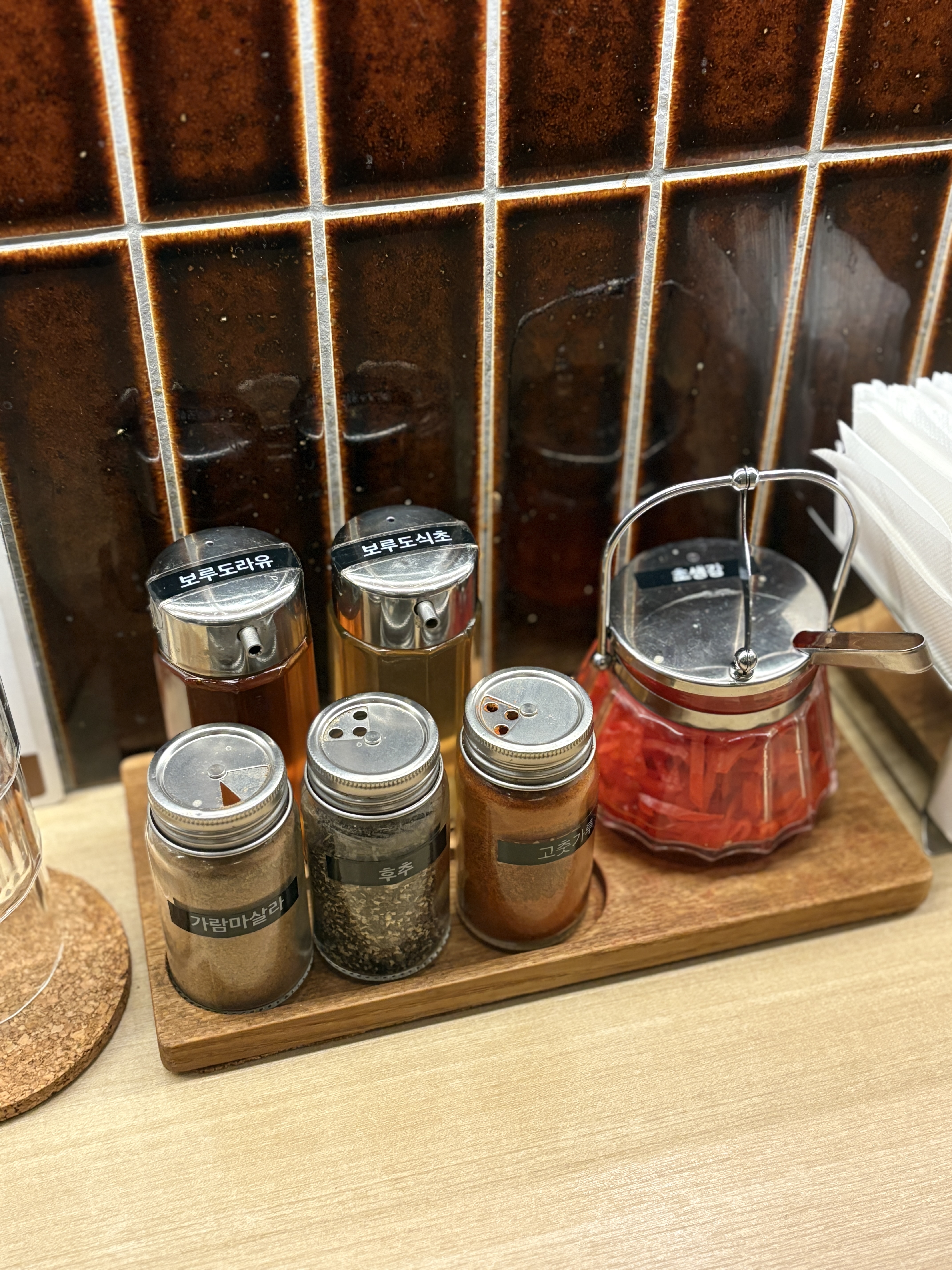 다양한 양념들이 준비되어있습니다. 마제소바에 필수인 식초부터 가람마살라와 특이하게 고춧가루까지 ㅎㅎ 반찬으로는 초생강이 준비되어있습니다.