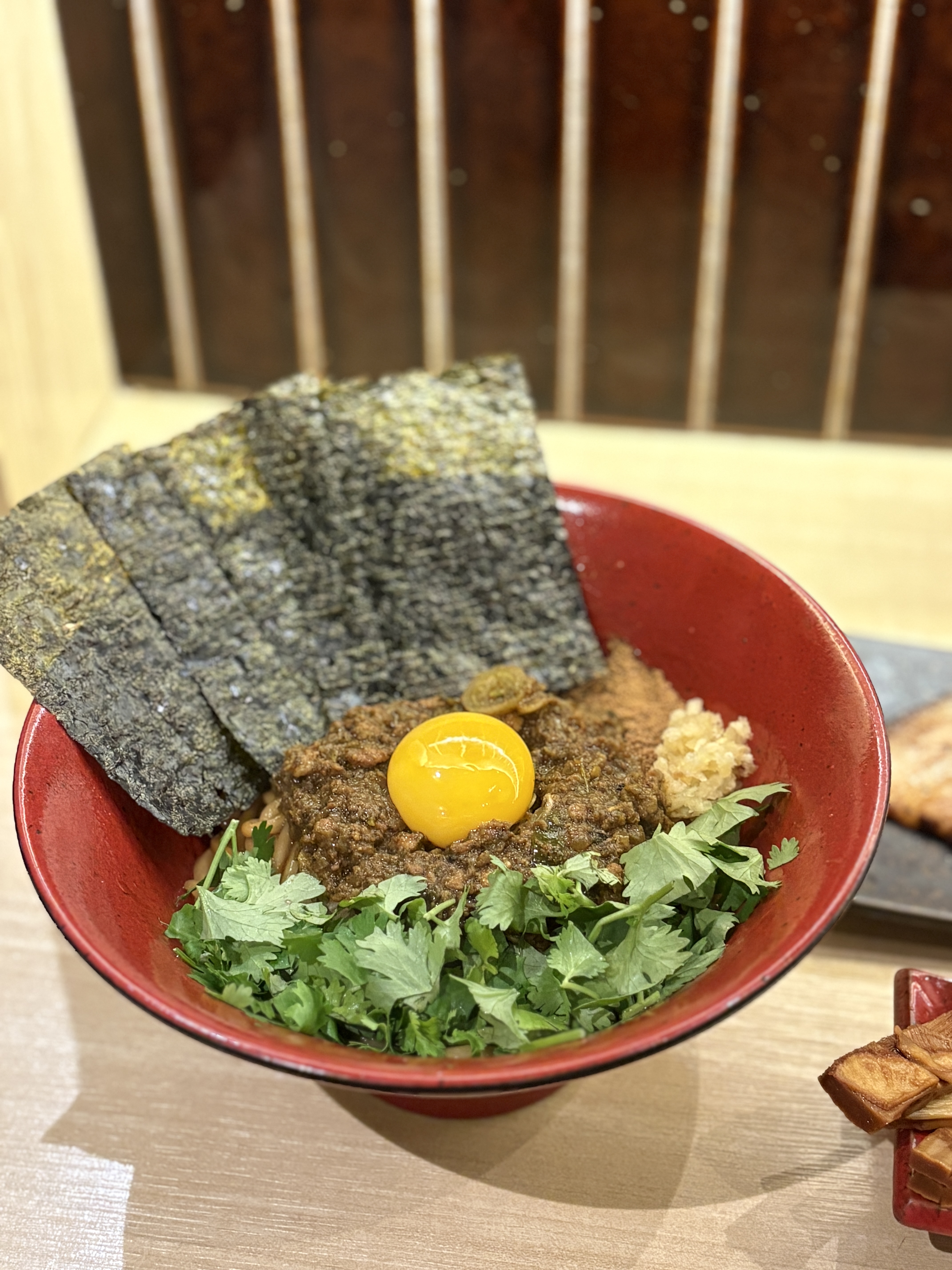 드디어 주문한 마제소바가 나왔습니다. 익숙한 마제소바 토핑 위에 키마카레와 고수가 듬뿍 올려져있습니다. 달걀 노른자도 매우 아름답네요 ㅎㅎ