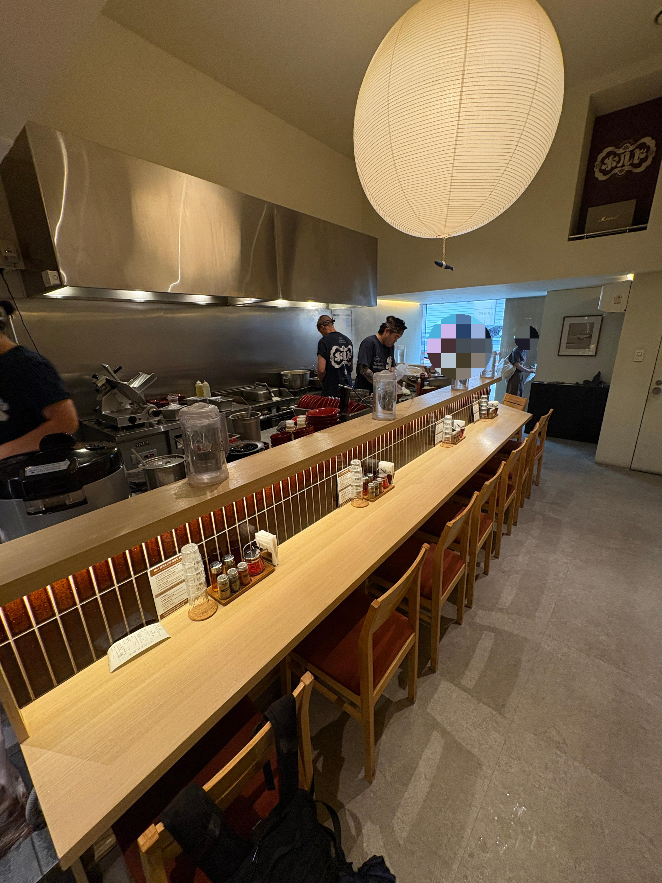가게 내부는 모두 바 좌석으로 구성되어있습니다. 좌석이 많지는 않지만 평균적인 라멘집 정도의 좌석 수는 됩니다. 의자 뒷 공간이 넓어서 좋았습니다. 짐 넣을 캐비넷같은 것도 있더라구요?