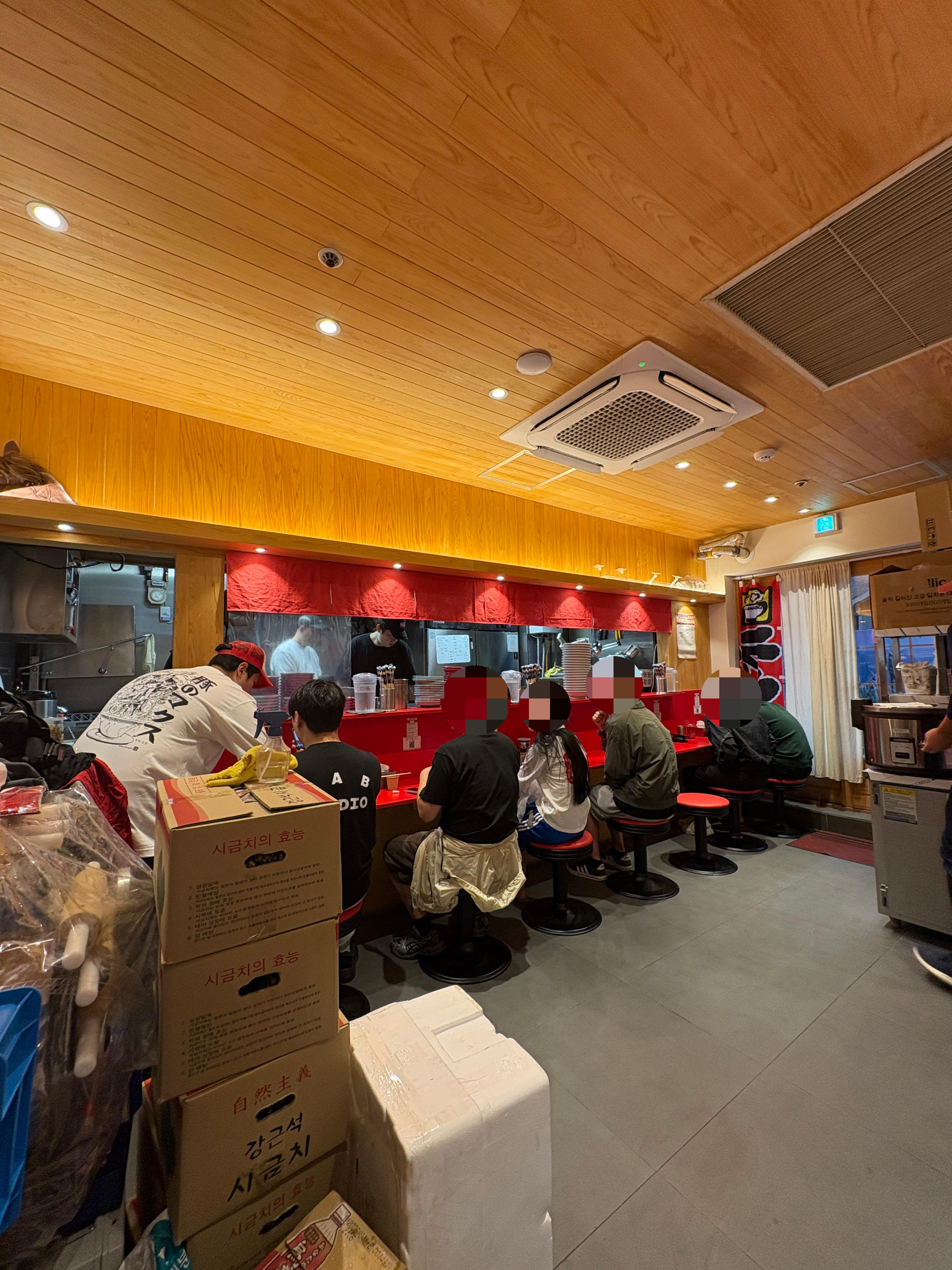 가게 내부는 이전에 소개한 부타노맥스의 내부와 크게 다르지 않습니다. 다만 가게 한켠에 셀프바에 특제 반찬과 공기밥을 퍼갈 수 있게 세팅한 점은 바뀌었네요. 가게가 좁다는 느낌은 아니지만 배달온 식재료들이 너무 잘 보이는 곳에 있어서.. 제 자리가 구석이라 그런지 앉으러 들어갈 때 좀 불편했습니다..ㅋㅋ