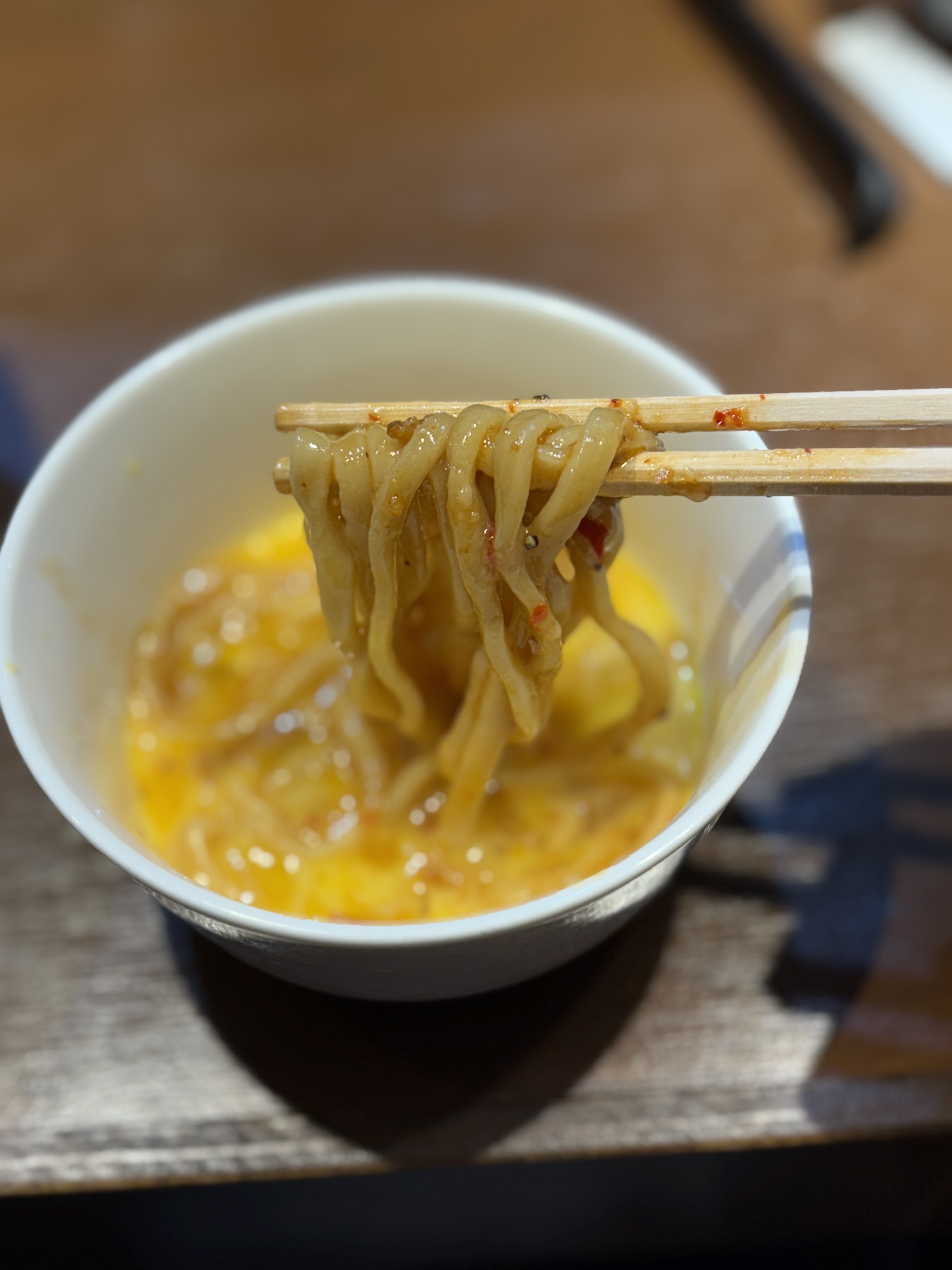 매운토핑이 소량의 육수와 만나서 고추기름처럼 변해서 면을 전체적으로 사장님이 섞어주니 자극적인 빨간색으로 변했습니다. 극태면이 소스를 많이 빨아들이지는 않아서 겉을 코팅하는 느낌이었는데 매운 맛은 생각보다 괜찮았어요. 그냥 고추가루 정도의 토핑일줄 알았는데 생각보다 맛이 많이 바뀌더라구요.