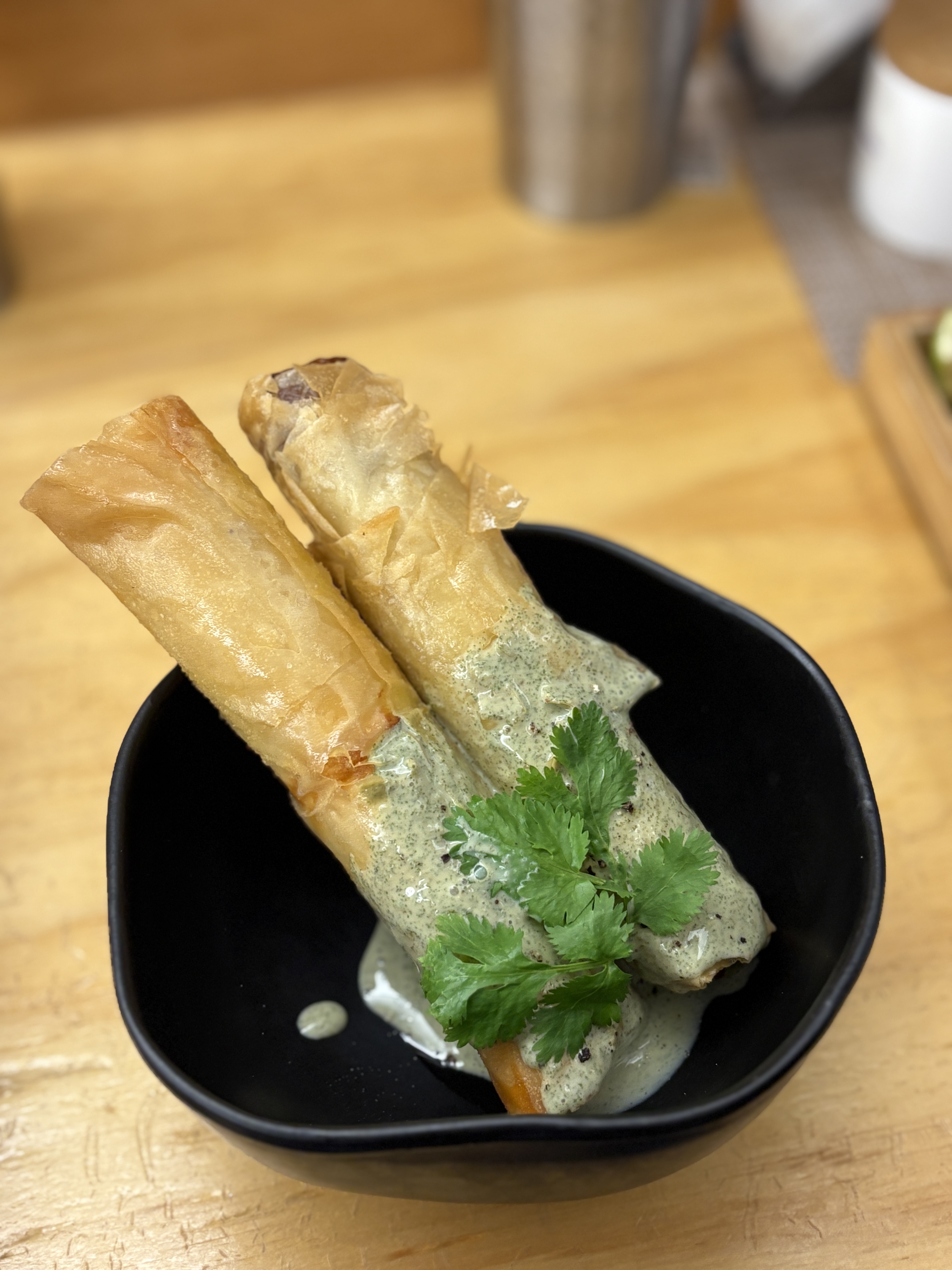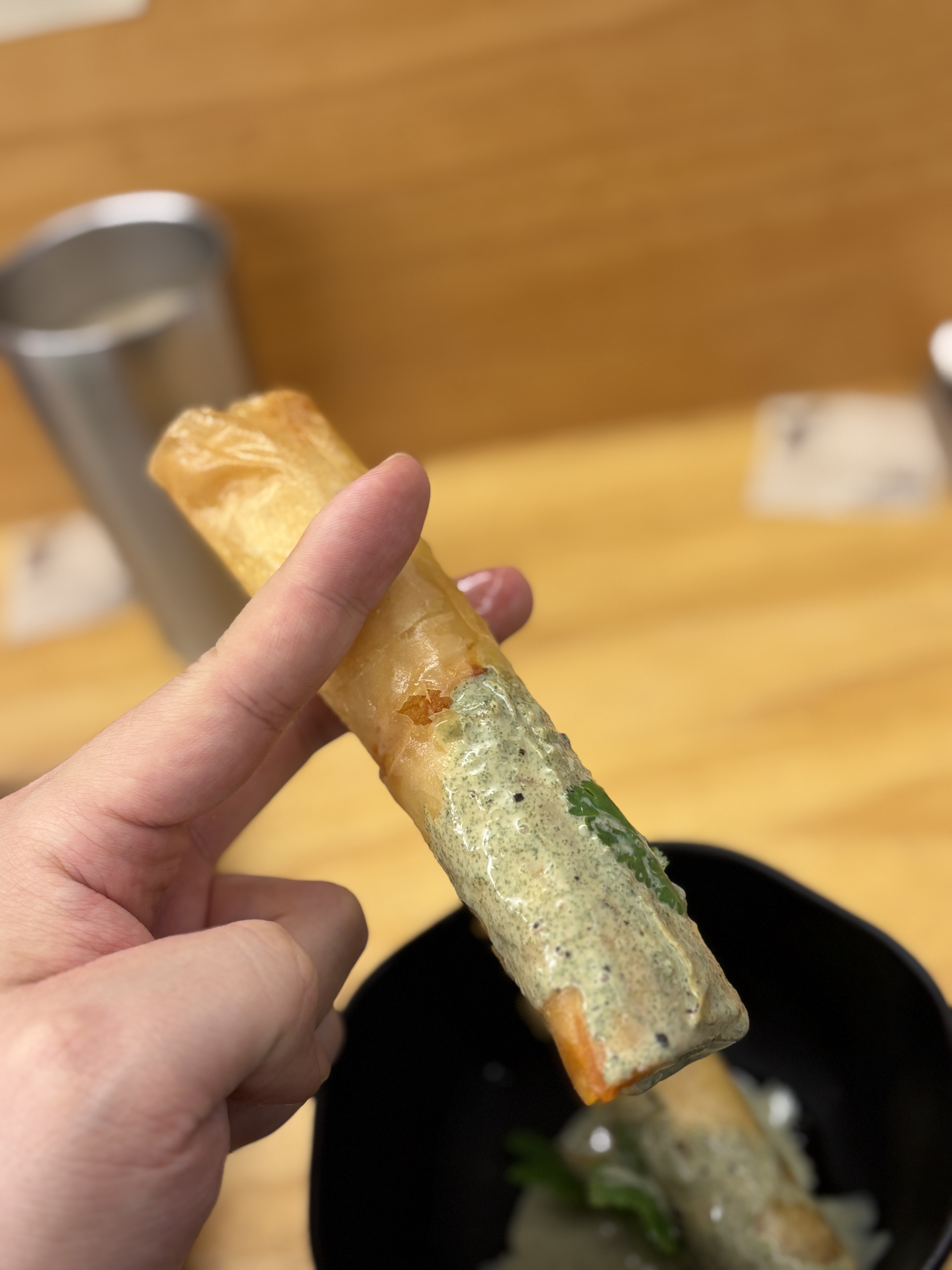 닉값을 하고싶어서  담배처럼 모양을 잡고 먹어봤습니다 ㅋㅋ 크리스피한 피 안에 숨겨진 치즈와 고기가 풍미가 매우 좋았습니다. 민트소스도 소스 자체는 괜찮았는데 온도감이 좀 소스가 차갑게 나와서 먹었을 때 민트맛이 너무 확 튀는감이 있긴 했어요. 롤은 방금 튀겨내서그런지 매우 뜨거웠거든요 ㅋㅋ 좀 두었다가 소스와 롤의 온도가 어느정도 맞춰지고 먹으니 더 괜찮았습니다. 민트소스가 좀더 꾸덕한 질감으로 온도감도 좀 더 맞춰졌으면 더 맛있게 먹었을 것 같습니다. 별미로 먹어보는 것 추천!