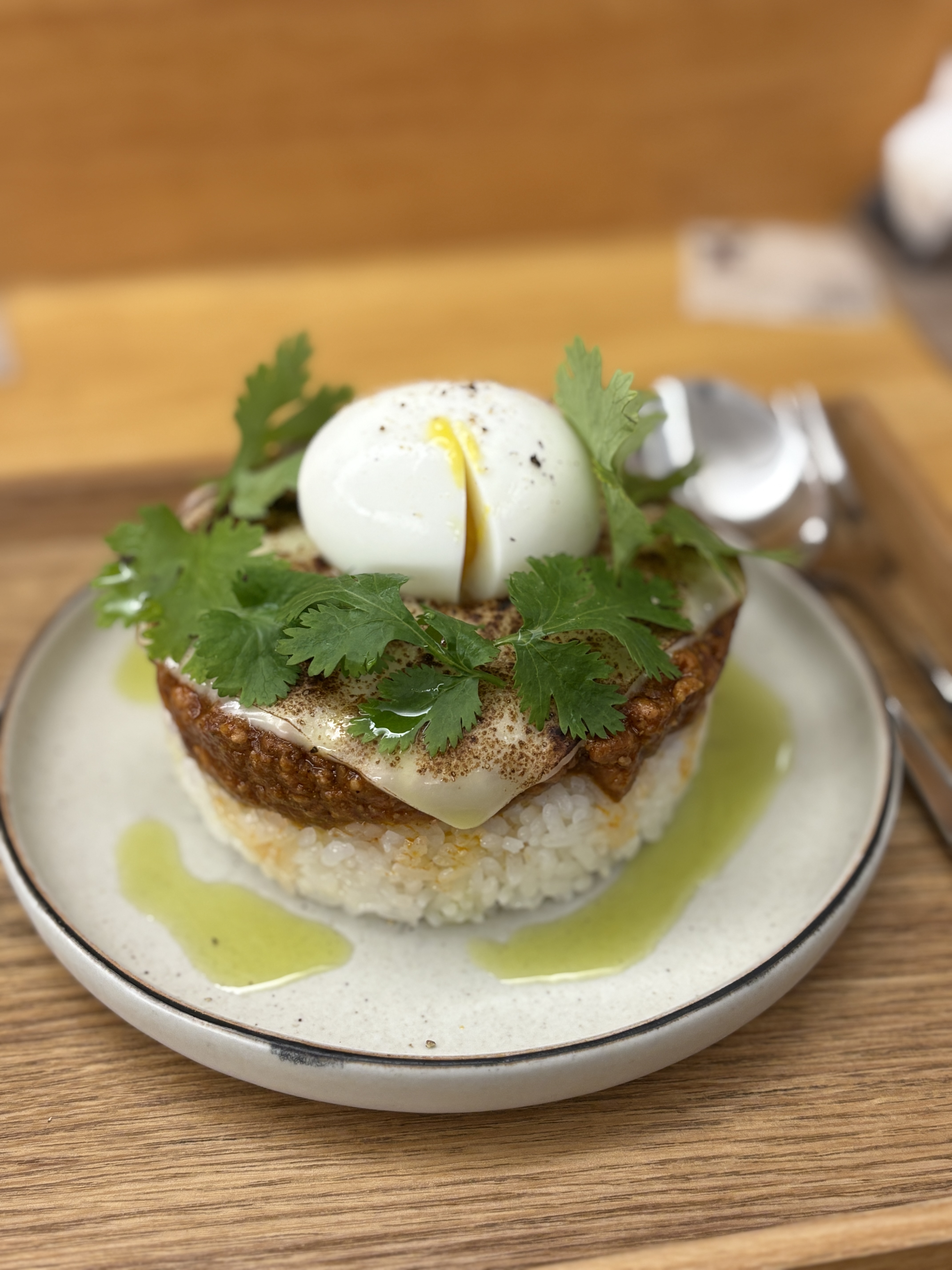 다음으로 나온건 키마카레. 치즈가 추가된 메뉴로 주문했습니다. 정석적인 방식으로 조리한 키마카레를 탑처럼 쌓아올렸고 치즈를 올려 토치질 해주었습니다. 위에는 수란이 올라가있구요. 계란 노른자와 치즈, 그리고 꾸덕한 커리가 만나서 완성되는 맛입니다.