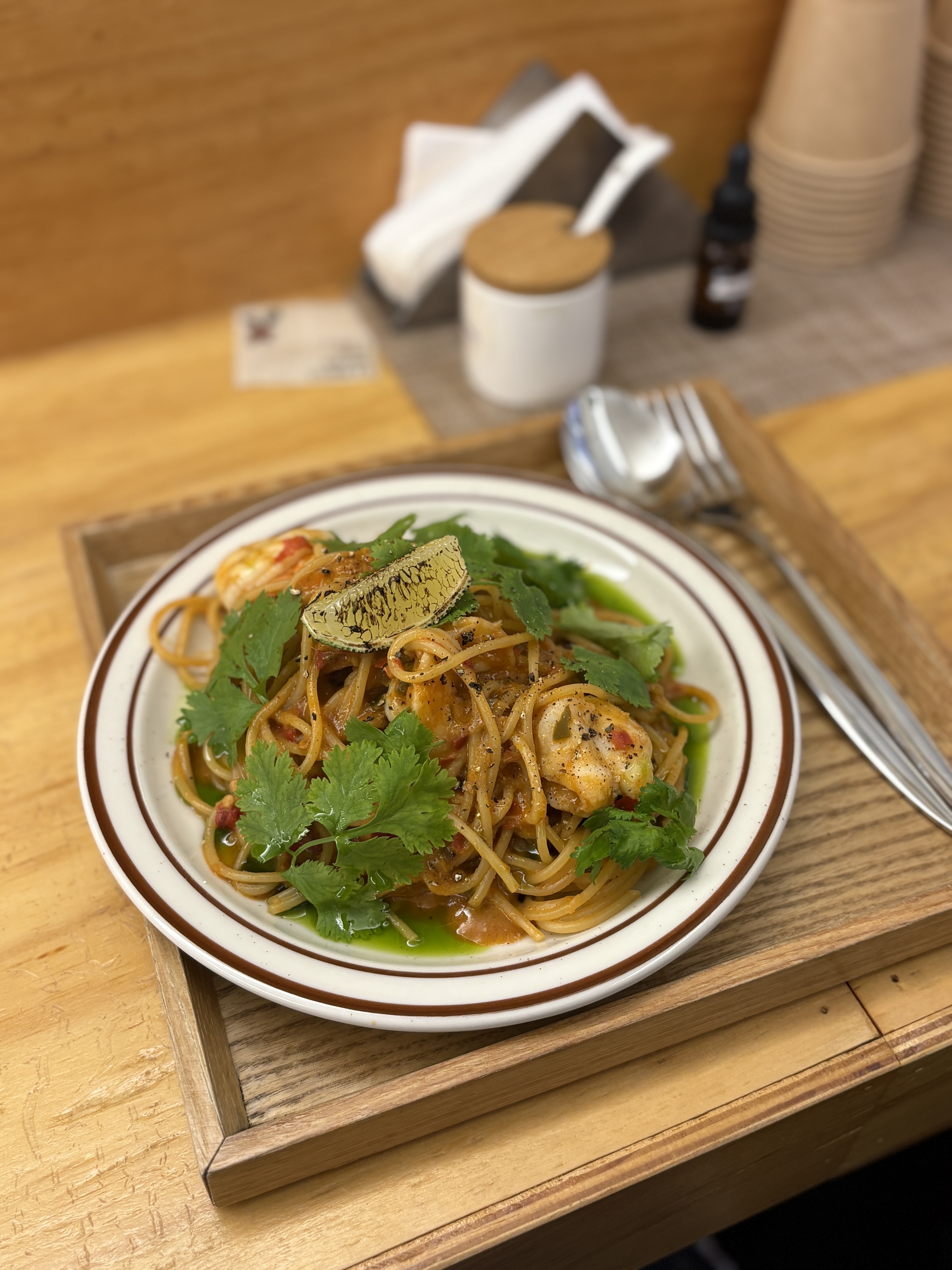 토치질한 레몬을 짜서 한입 먹어보면 똠얌 소스에서 오는 특유의 새콤하면서도 달달한 향을 면발이 흠뻑 머금어서 이거 아주 괜찮네요. 정통 파스타랑 비교하면 당연 다른 결이지만 굳이 비유하자만 아주 잘만든 나폴리탄을 먹었을 때 느껴지는 만족감처럼.. 일탈에서 오는 만족감이라고 할까요 ㅋㅋ