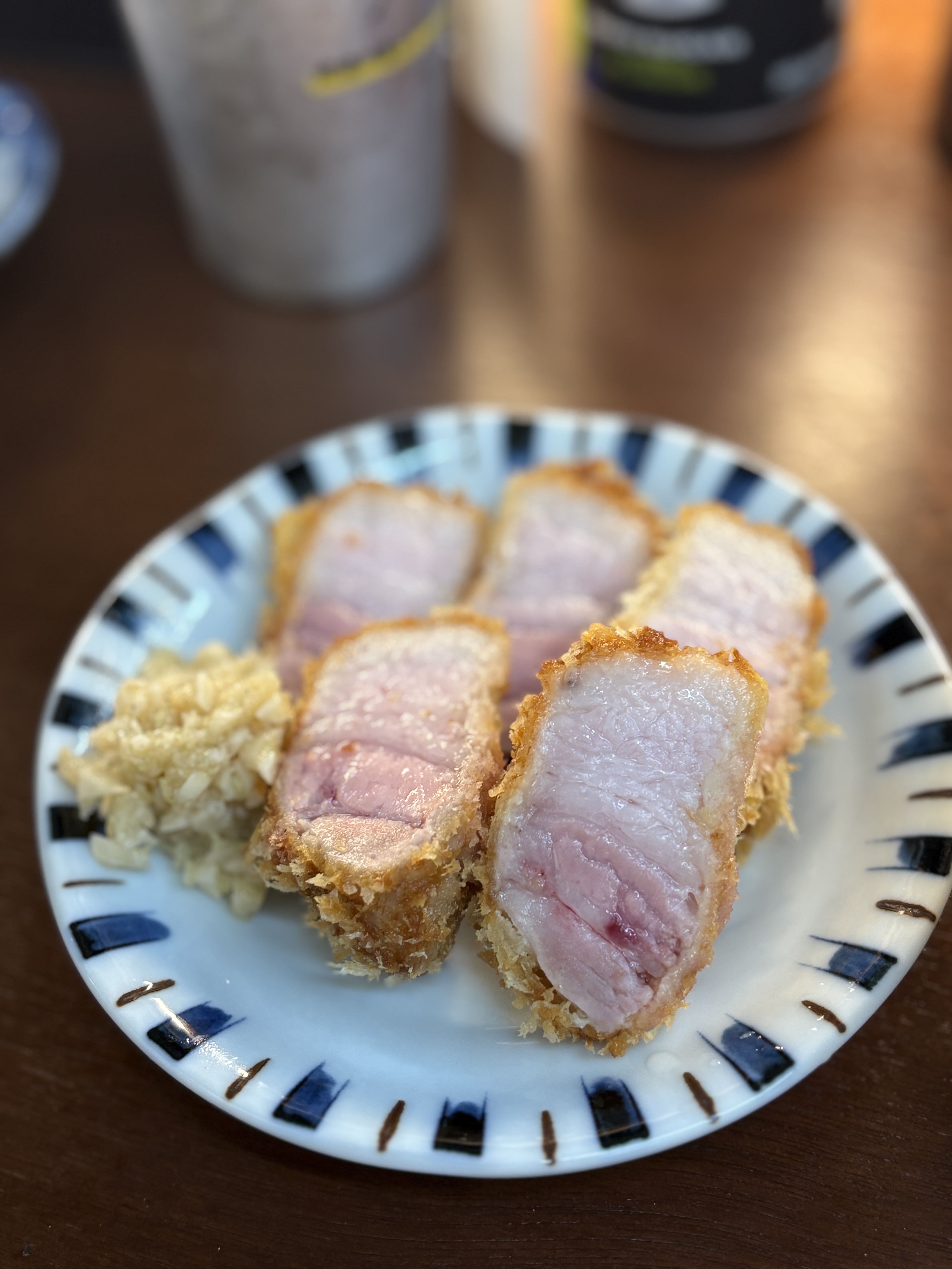 다음으로는 기대가 많았던 삼겹살 카츠인 바라카츠! 워낙 기름이 많은 부위이기도하고 삼겹살이 잘못튀기면 질겨지는 성질도 있어서요. 카츠라하면 두께도 생각해야하는데 잘못 조리된 바라카츠 경험은 매우 질기거나 익힘정도가 뭔가 마음에 안들었는데, 아주 고소한 삼겹살 지방 맛이 잘 느껴지면서도 적당한 식감도 살아있는 바라카츠였습니다. 그리고 옆에 나오는 마늘 소스가 아주 킥이었어요. 기대했던 만큼 맛있었습니다. 사실 한국사람이 삼겹살을, 그리고 튀김을 안좋아할 수가 없는데, 삼겹살을 튀겨주면 얼마나 맛있을까요 ㅎㅎ