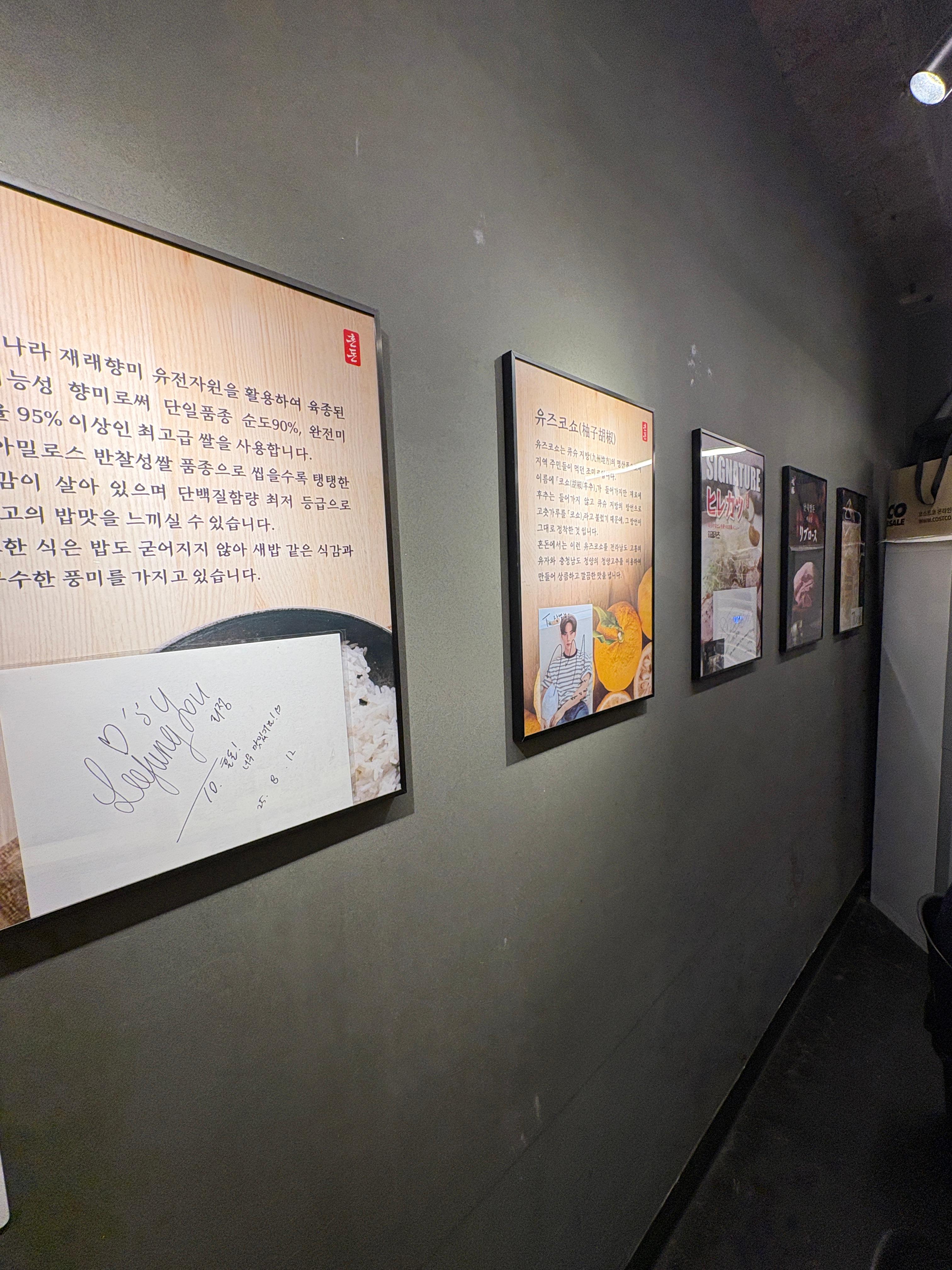 뒤 벽면에는 이렇게 소개들과 연예인 분들 사인이 걸려있네요. 익숙한 이름도 보이는데 아무래도 근처에 기획사나 엔터테이먼트 관련 유동인구도 많다보니 그런것 같기도하네요.