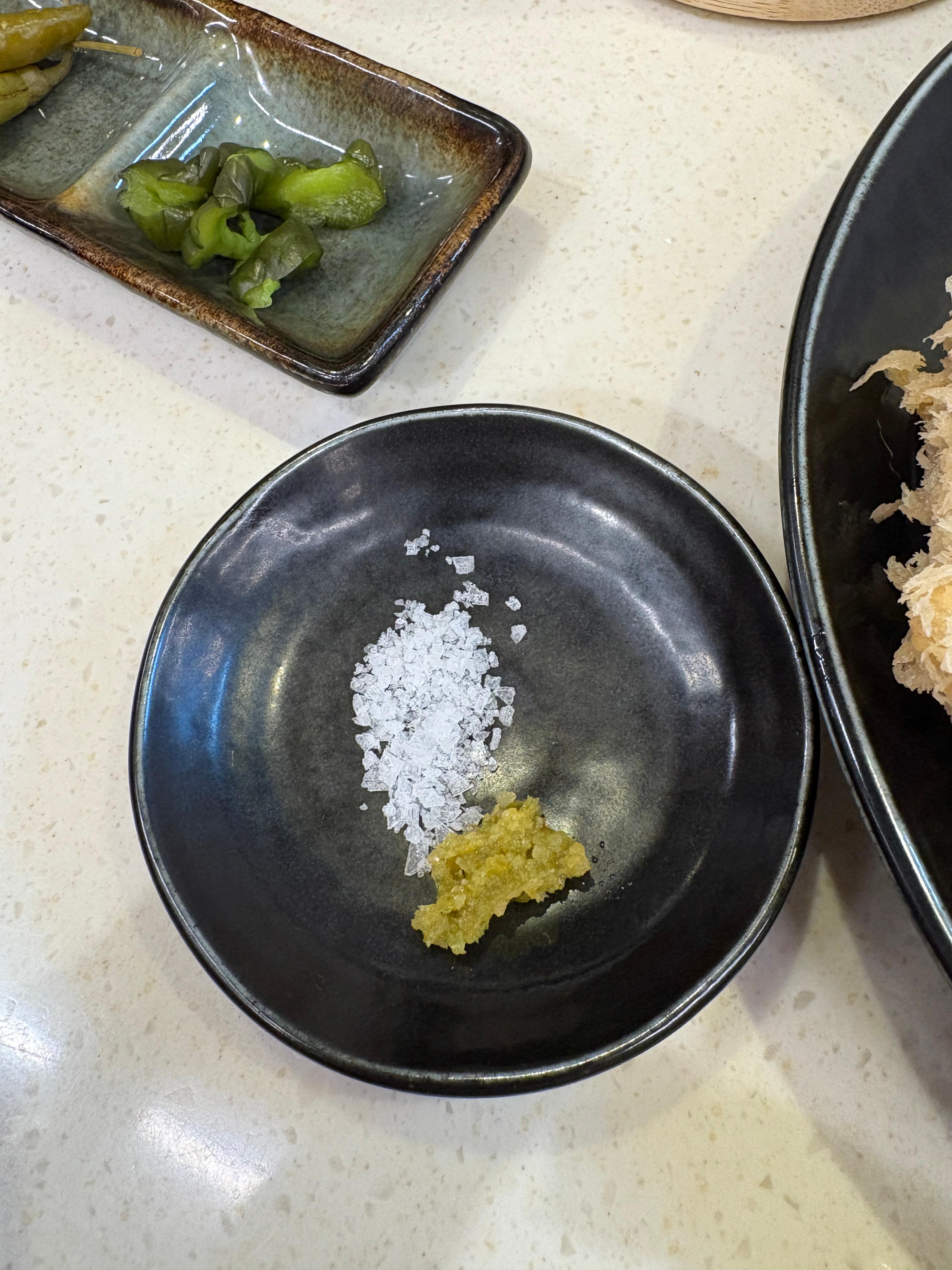 기본적으로 소금과 유즈코쇼가 제공됩니다. 입자가 굵은 소금을 살짝 곁들여서 와사비와 먹고, 약간 매콤한 유즈코쇼와 함께 곁들여서 번갈아가며 먹으면 재밌습니다.
