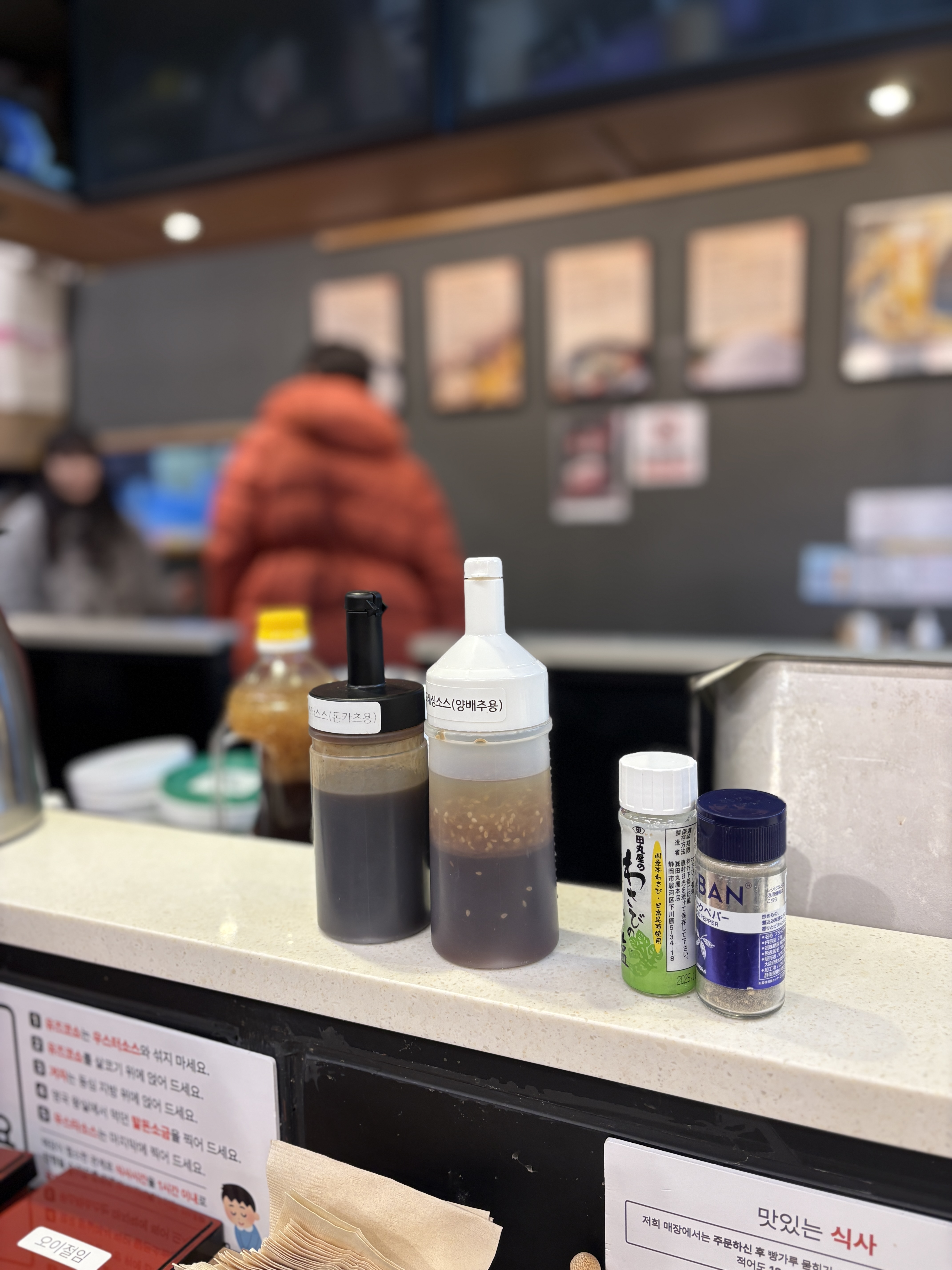 테이블마다 비치된 소스들입니다. 돈카츠용 소스와 드레싱 소스구요 옆에 가반 후추와 와사비가 있습니다. 돈카츠를 먹을때 돈카츠보다 양배추를 더 많이 먹는 저이기에 저 야채 드레싱이 매우 중요한데 적당히 새콤하면서도 달콤함이 과하지 않은 드레싱이 마음에 들었습니다.