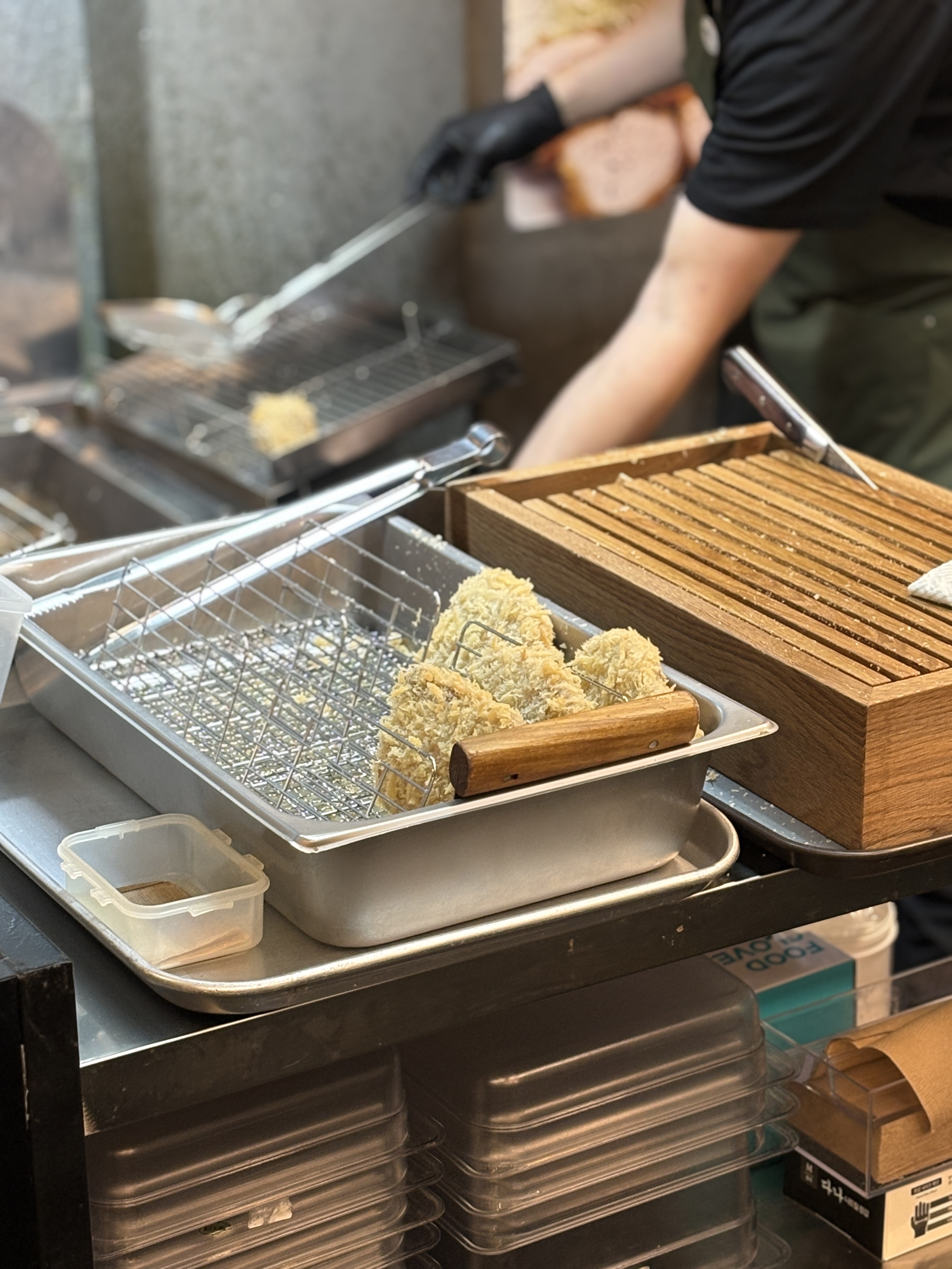돈카츠를 빵가루에 묻혀서 튀기고 레스팅하는 모습까지. 전 이렇게 돈카츠를 튀겨낸 후 레스팅하는 모습과 썰어낼 때의 그 경쾌한 바삭거림이 좋더라구요 ㅎㅎ