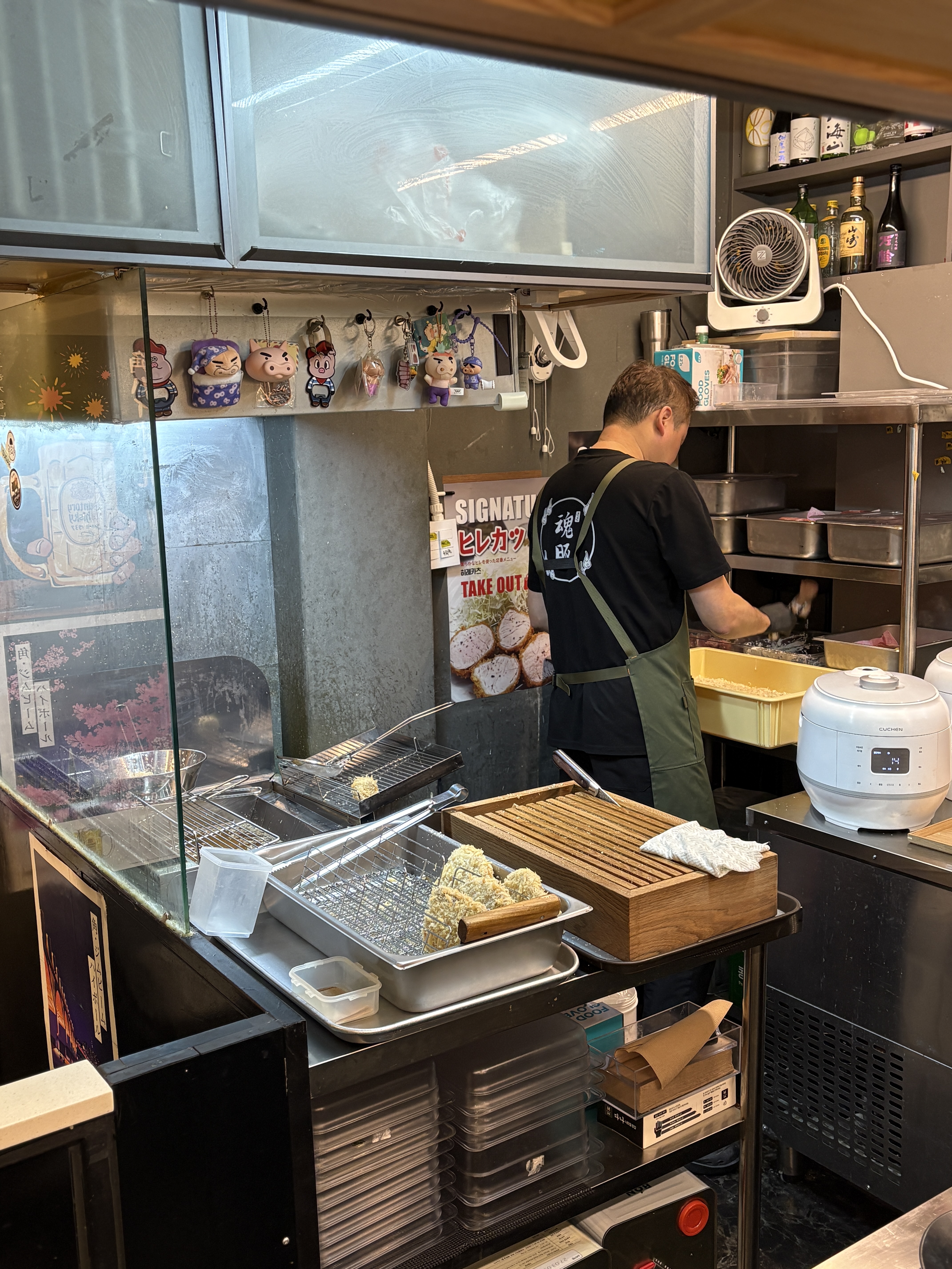 가게 내부는 넓지 않지만 2인 좌석 테이블과 바테이블 등으로 구성되어있었습니다. 의자와 뒤 벽면이 조금은 비좁아서 다른분들 부딪히지 않게 들어가는게 조금 힘들긴 했어요. 그리고 생각보다 좌석이 많지는 않아서 튀겨서 나와야하는 돈카츠다보니 웨이팅이 좀 길어지면 고생좀 하겠다는 생각이..