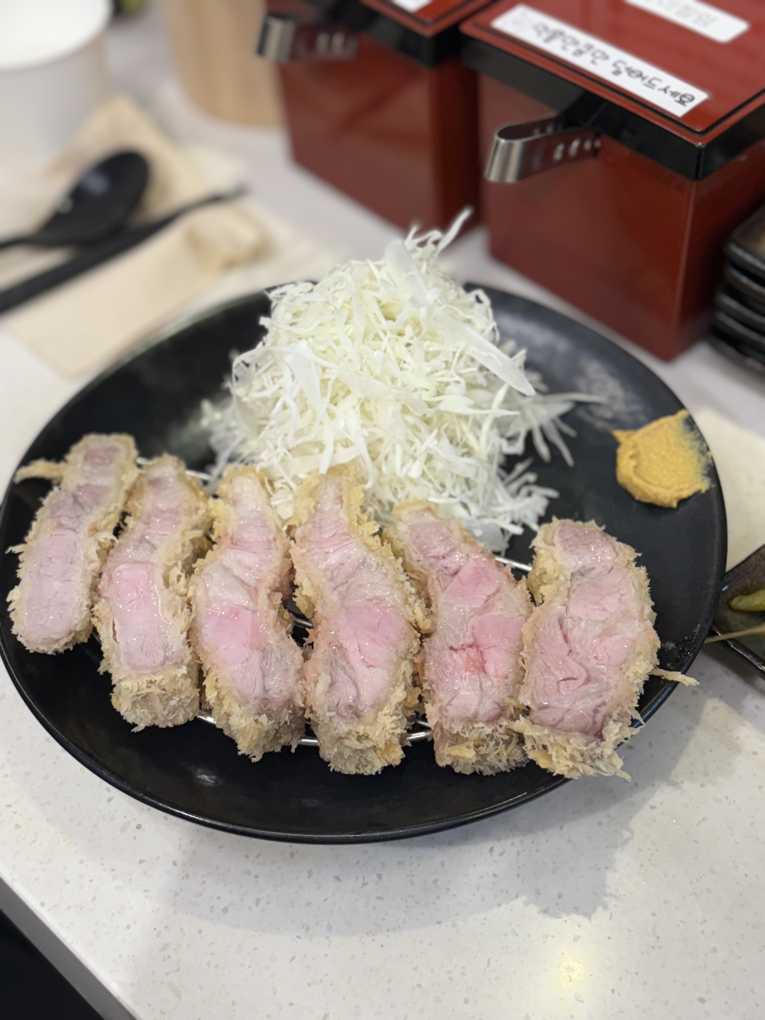 튀김옷 색을 보니 제가 좋아하는 고온에 튀긴 돈카츠는 아니지만.. 튀기는 시간과 레스팅 타이머를 보니 왠지 단면이 기대되는 돈카츠였습니다.