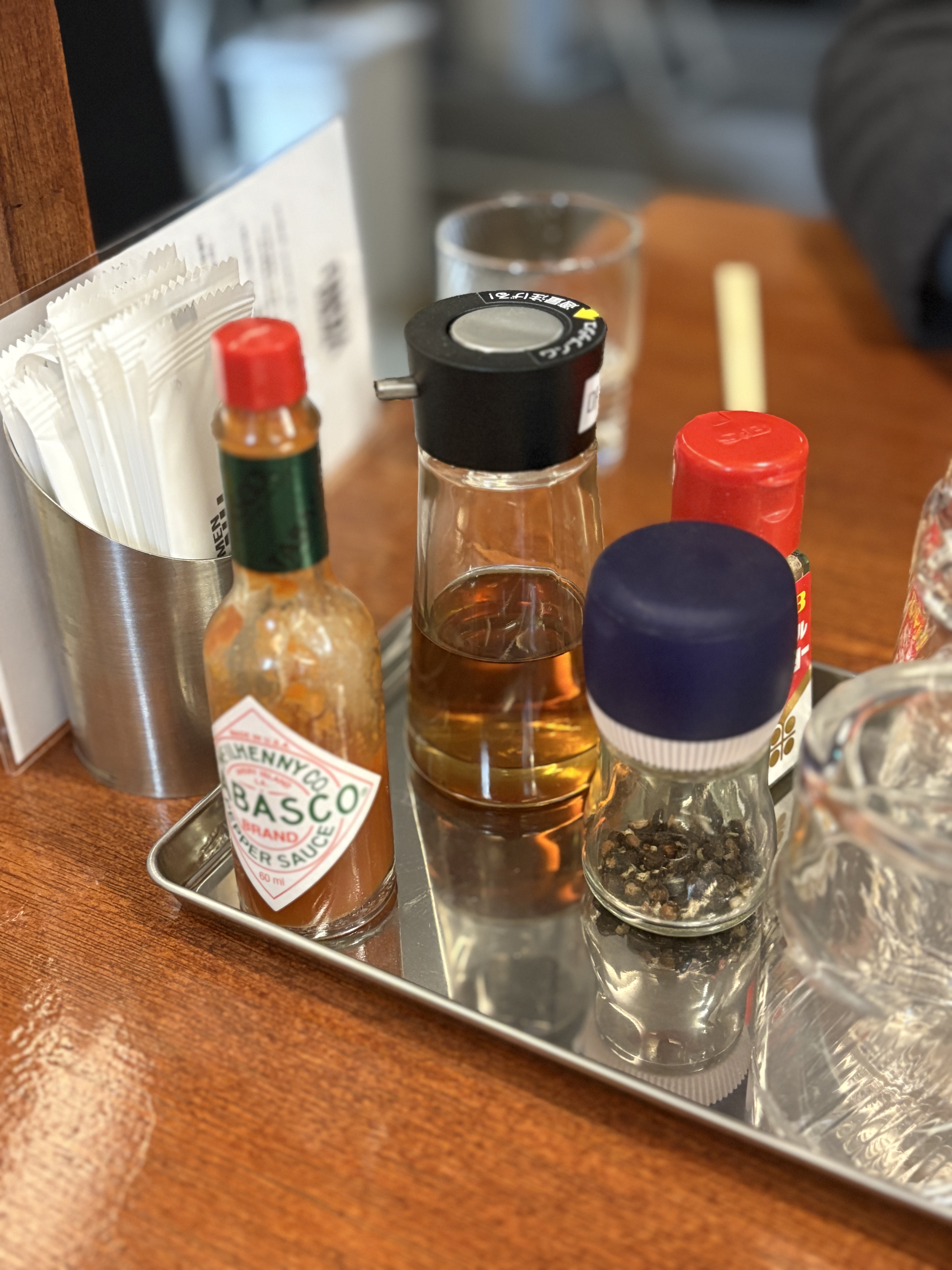 주로 마제소바를 위한 소스들이 비치되어있었습니다. 다시마식초와 타바스코 소스가 있고 가반 후추도 있네요. 전 먹다가 중간에 흑후추를 좀 더 뿌려서 먹으면서 변주를 줬습니다.