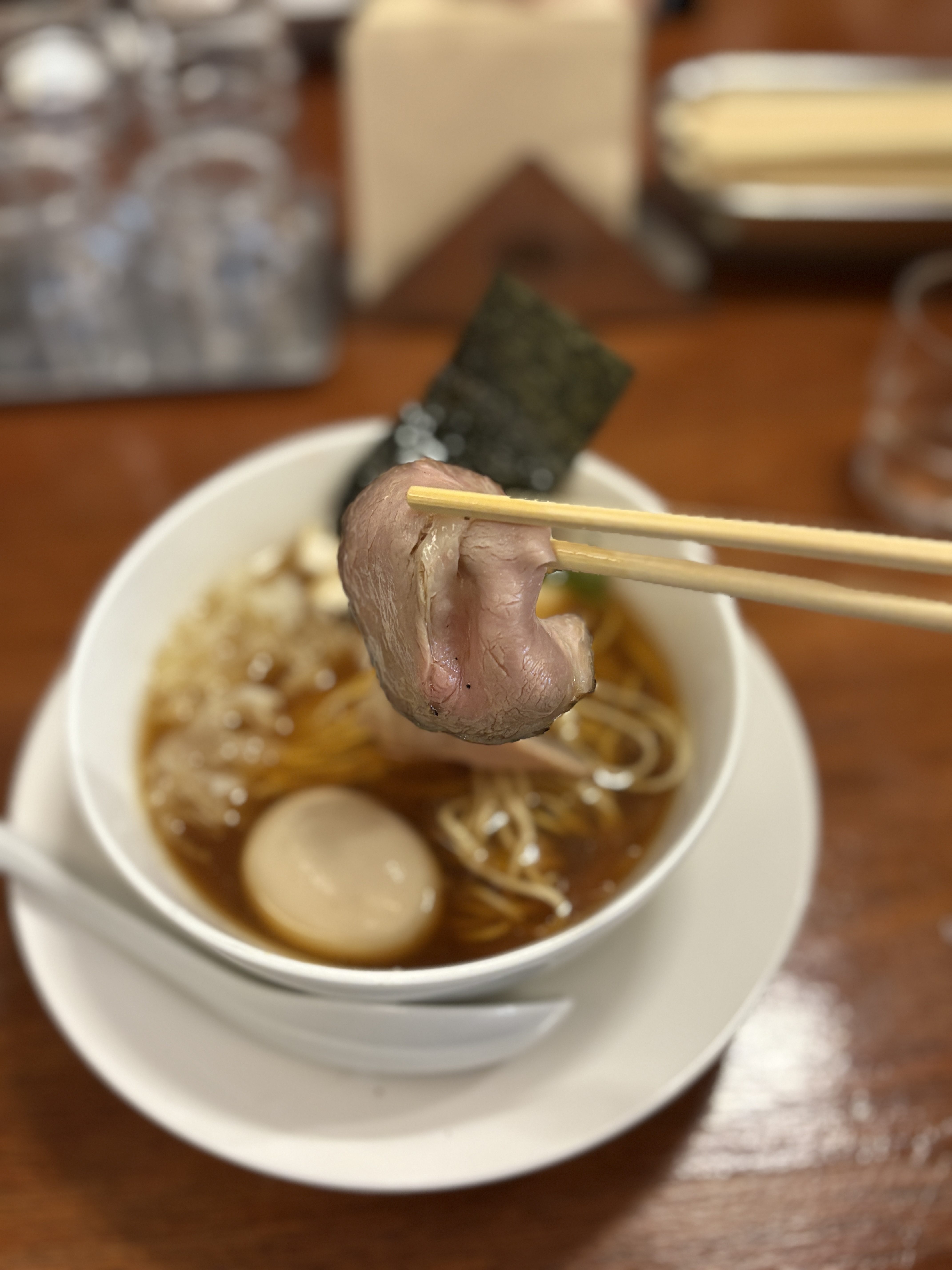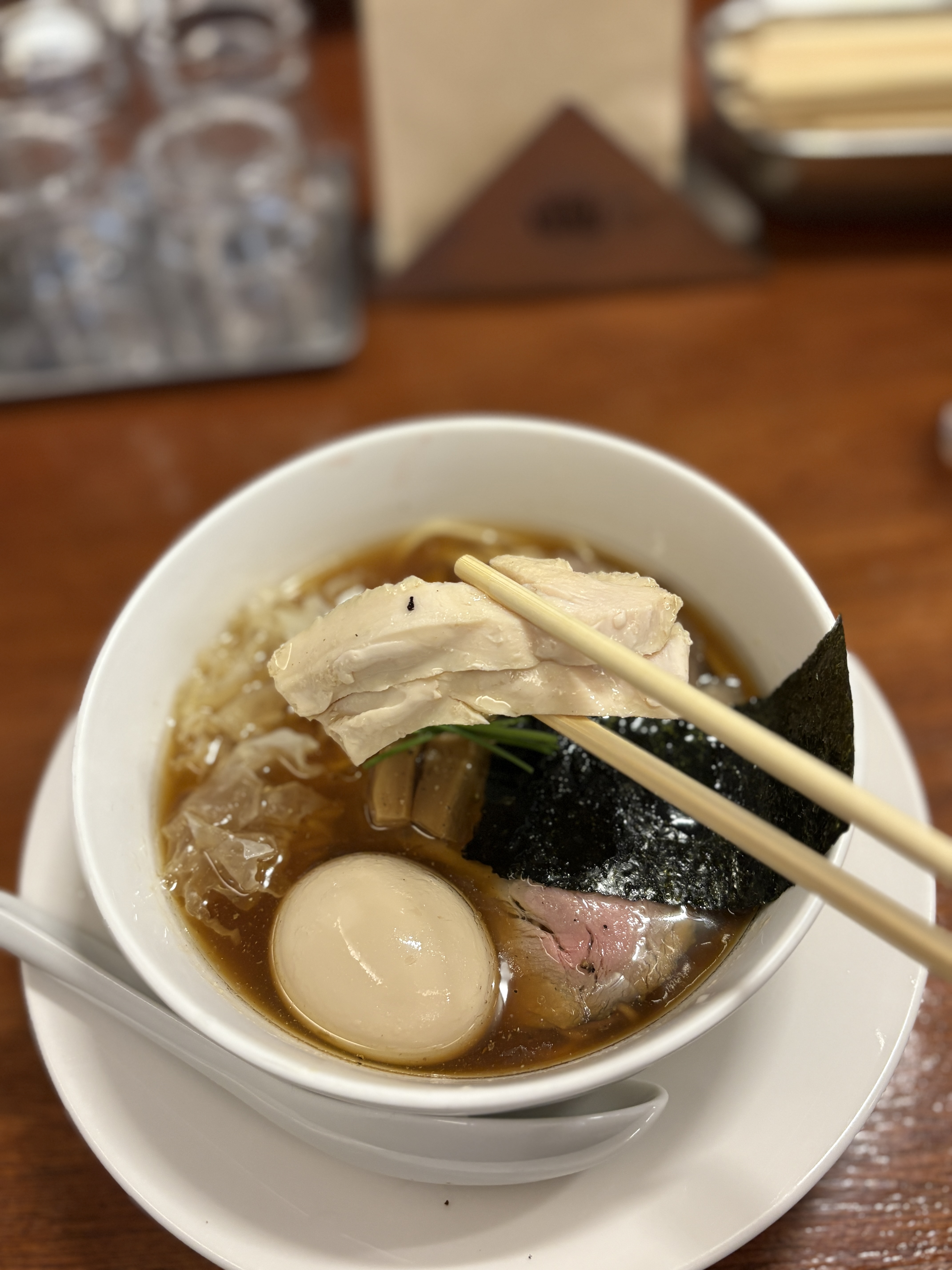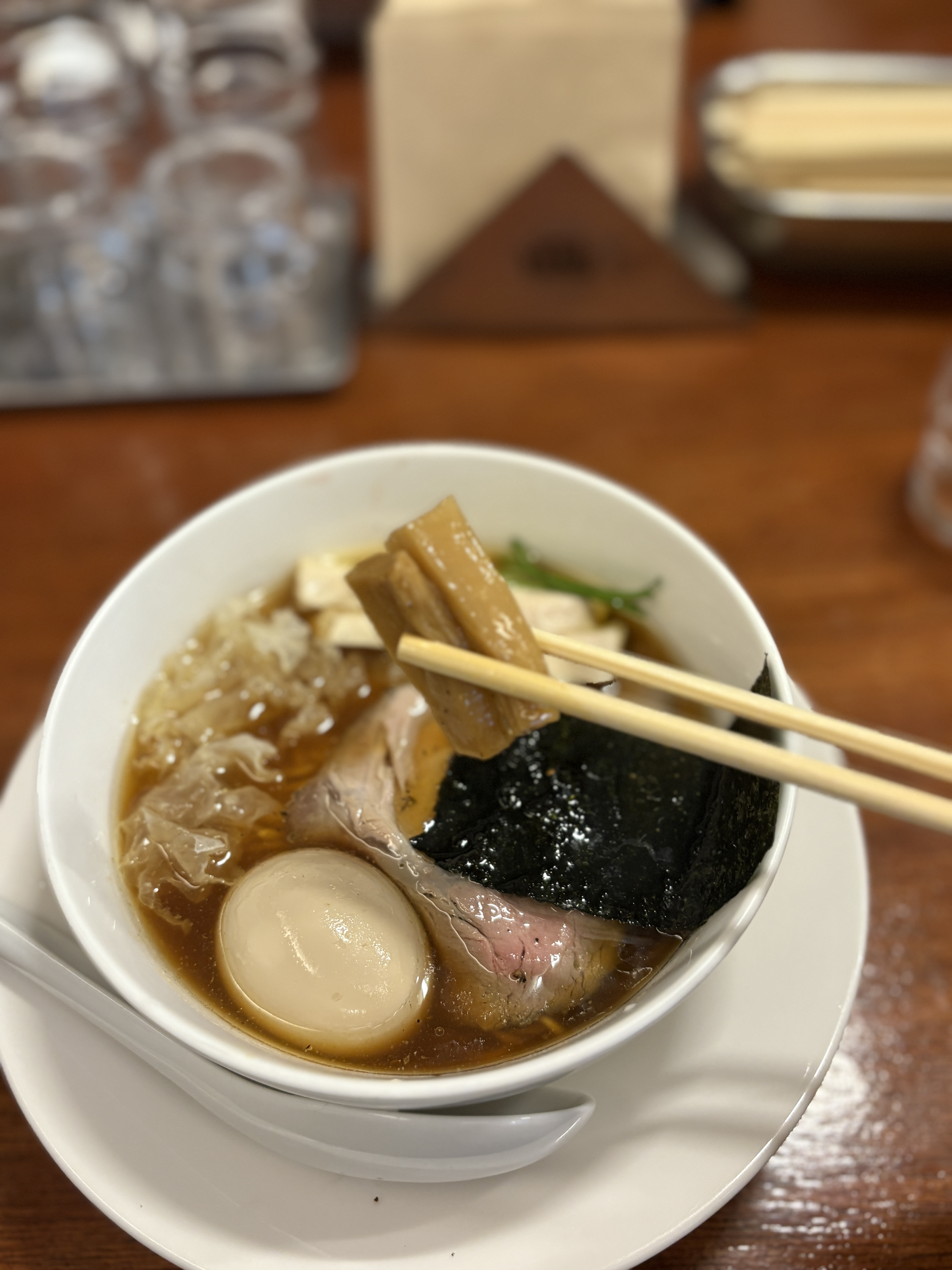 곧이어 주문한 쇼유라멘이 모습을 드러냈습니다. 독특하게 목이버섯이 보이고 영양부추가 살포시 올려져있습니다. 멘마는 짧지만 각진 깍둑 멘마였구요, 닭 차슈는 큼직하게 두덩이 있습니다.