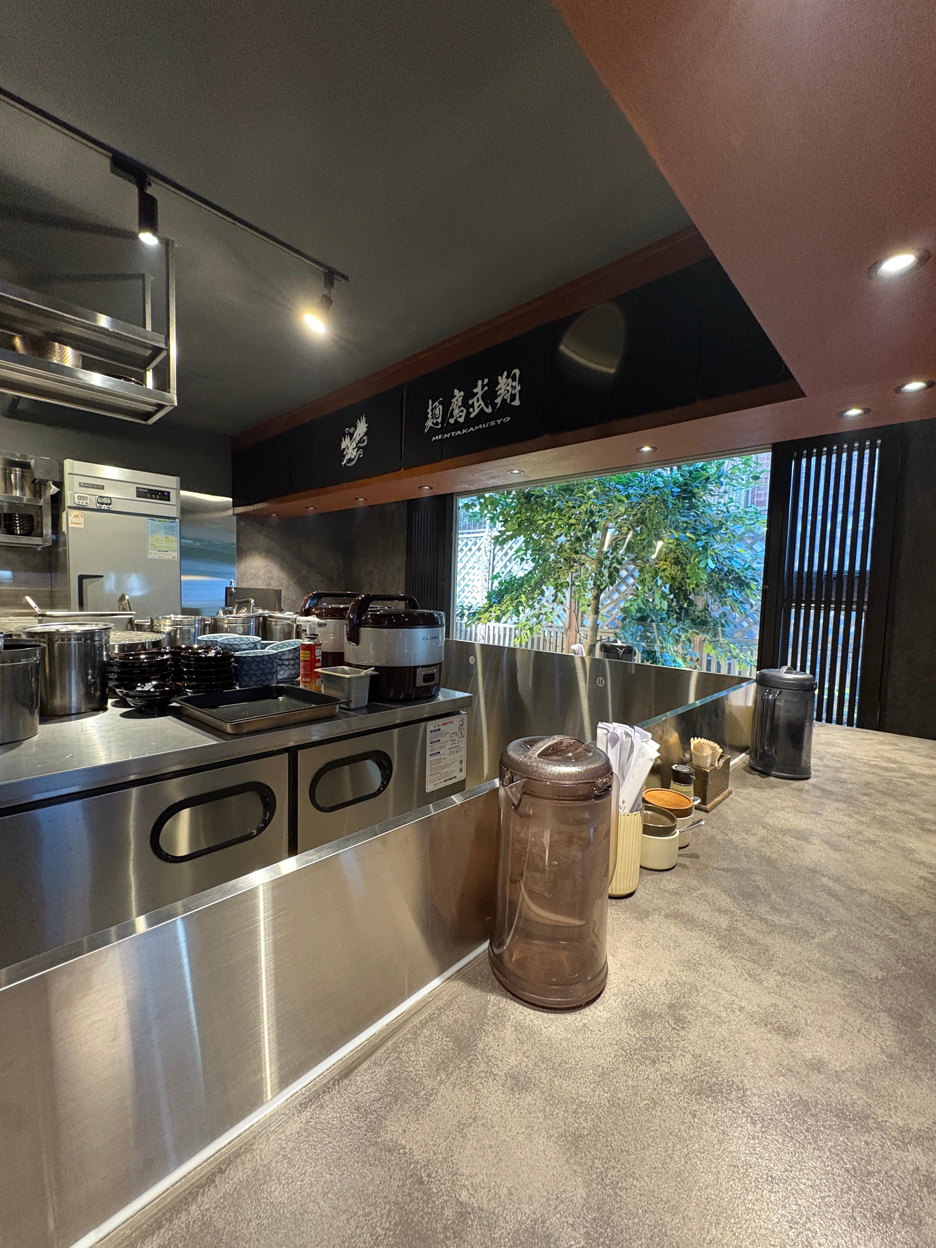 새로 오픈한 멘타카무쇼 본점의 주방은 굉장히 활기찬 분위기의 넓고 쾌적한 주방이었습니다. 스피커를 통해서 꽤나 빠른 bpm의 음악이 나오고 있었구요, 직원분들 수도 많았습니다. 각각 본인의 분담 역할이 명확하게 있었기 때문에 다수의 주문이 들어와도 막힘없이 해낼 수 있어 보였습니다. 면은 사장님이 직접 익히고 담아내고 계셨구요, 가쿠니 차슈도 사장님이 직접 포셔닝하고 츠케멘에 올리고 계셧습니다.