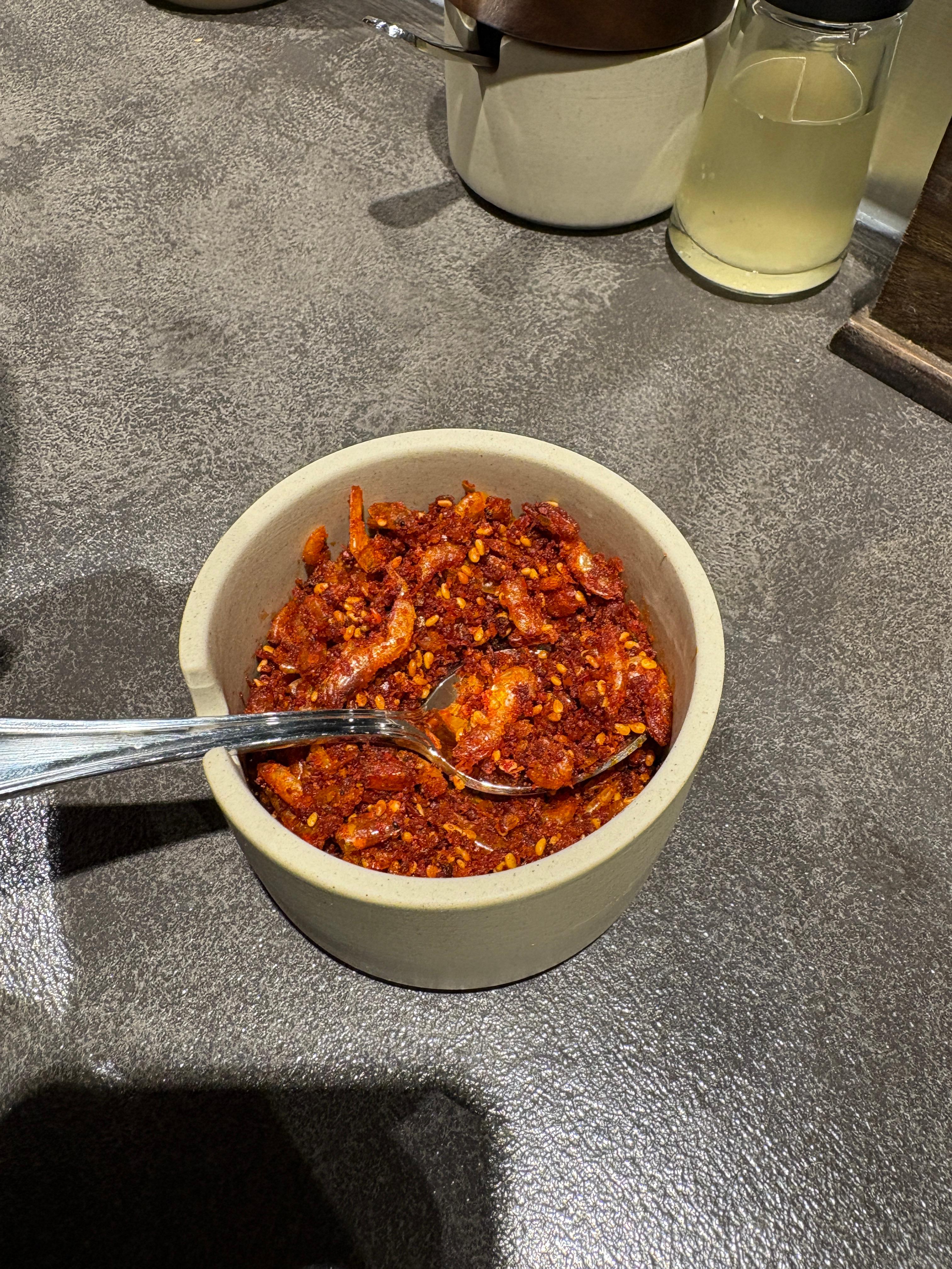 광교에서도 맛있게 먹었던 새우고추가루. 먹다가 1/3쯤 남았을 때 시루에 섞어먹으면 또다른 맛의 변화를 느낄 수 있습니다. 다시마식초를 더 좋아하긴 하지만 멘타카무쇼에선 이거 없으면 섭하죠.