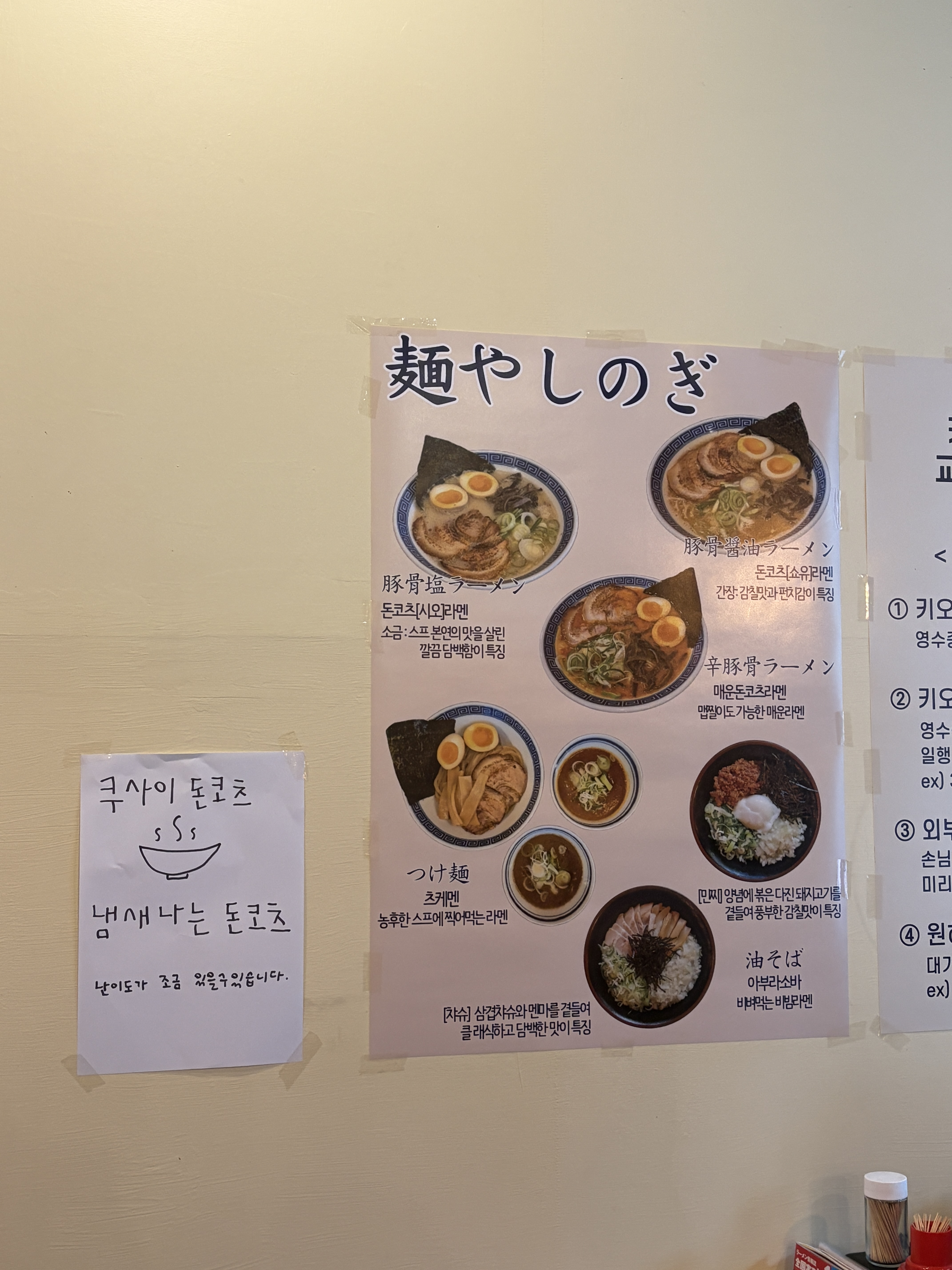 벽에는 각 라멘들을 사진과 함께 걸어두셨습니다. 사실 라멘 자주 먹는사람이면 상관없는데, 자주 안먹는사람이면 메뉴 이름만 가지고는 어떤라멘인지 파악하기가 힘드니까요. 이런 사진과 설명이 같이 있으면 주문하기가 편해집니다. 돈코츠 시오라멘, 돈코츠 쇼유라멘, 매운 돈코츠 총 3종류의 돈코츠 라멘 베이스를 판매하시구요, 하루에 15식에서 20식 정도로 쿠사이 돈코츠를 한정메뉴로 소개해두셨습니다. 난이도가 조금 있을 수 있다고 적어두셨고, 인스타에도 굉장히 무섭게(?) 표현을 해두셔서 라멘좀 먹어봤다는 저도 주문하기전에 고민이 되더라구요 ㅋㅋ 근데 처음 오시는 손님이 가끔 쿠사이 돈코츠를 주문하시면 안주인분께서 직접 가셔서 메뉴 설명을 하시고 필요한 경우엔 메뉴 변경까지 도와주시더라구요. 세심하게 한분한분 찾아가서 여쭤보시는 모습이 인상적이었습니다. 접객이 안좋은 가게들은 사실 이런거 신경 안쓰거든요. 손님이 못먹을거 같은걸 시키던 말던 그건 니 잘못이라는 태도..