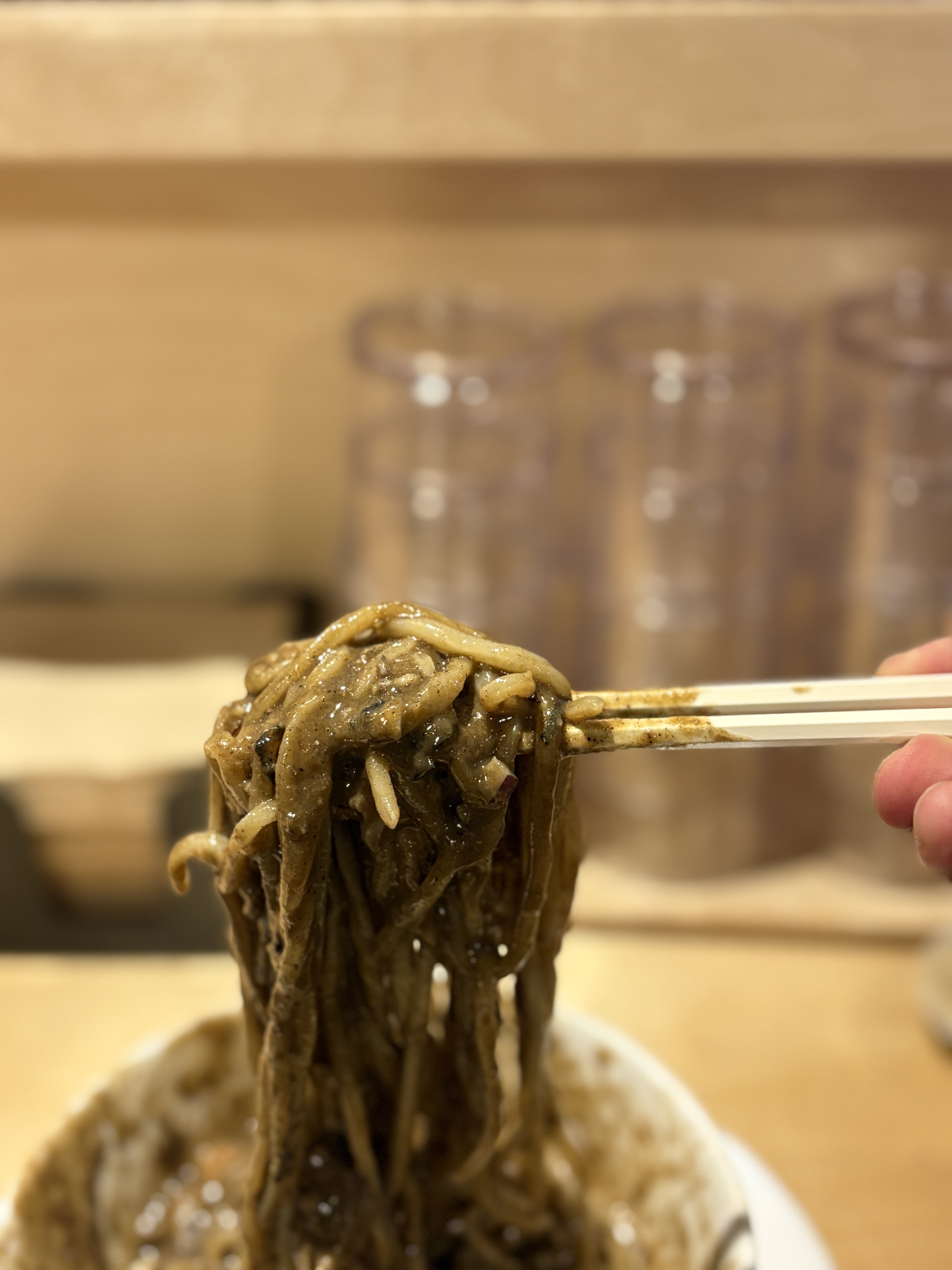 본격적으로 비비기 전에 다시한번 점도 체크. 아주 꾸덕하게 뽑은 게우소스같은 느낌도 있구요, 이걸 이용해서 파스타를 만들어 봐도 재밌겠다는 생각이.. 라멘을 먹으면 먹을수록 파스타랑 라멘이 서로 영감을 많이 줄 수 있겠다는 생각이 듭니다.