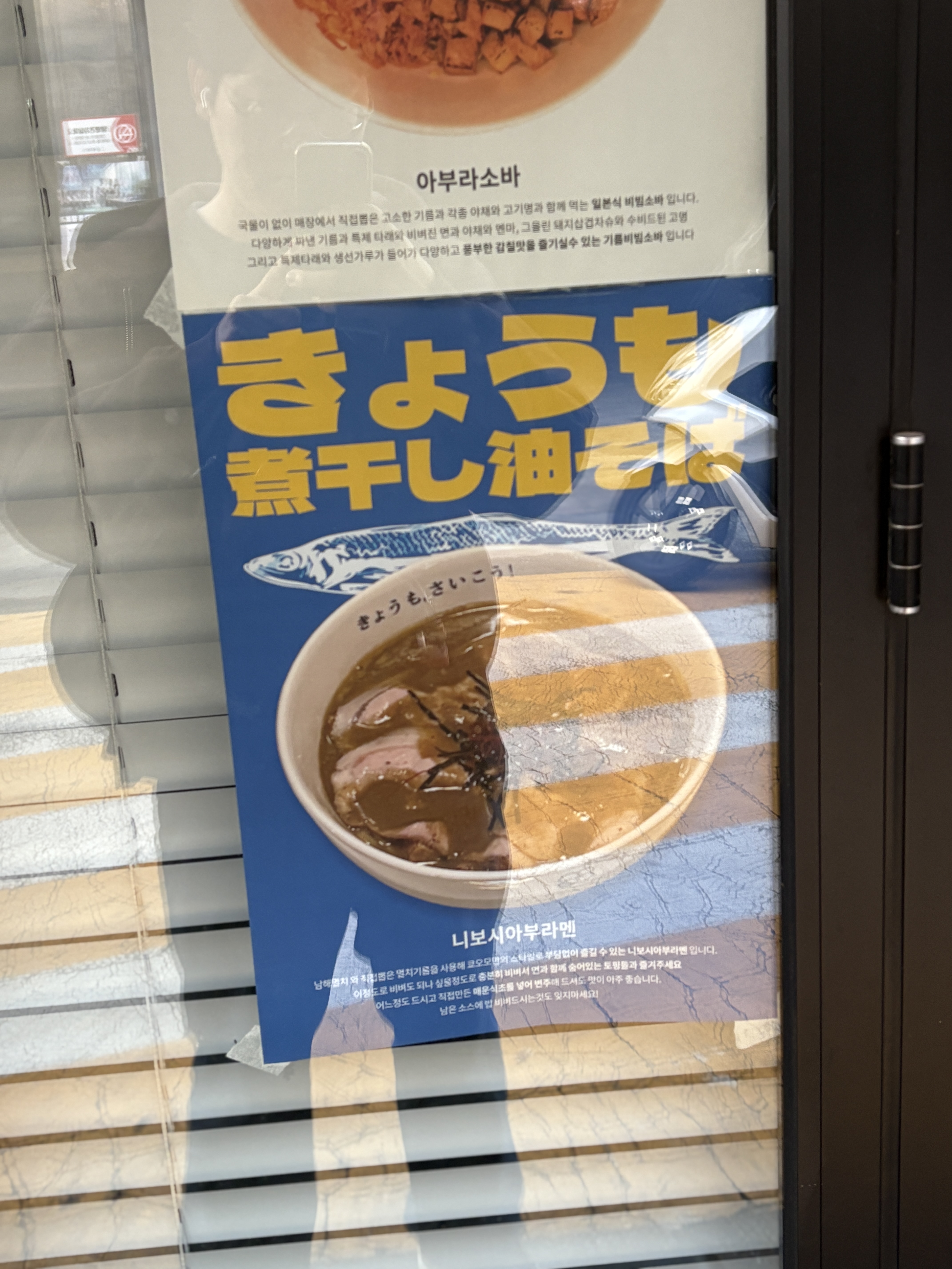 쿄오모라멘은 가까운 위치에 약수역점이 있고, 이곳 신당역/청구역 근처에 '신당점'을 운영하고 있습니다. 오늘 소개해드릴 니보시 아부라소바는 이 신당점에서만 저녁 영업 한정 판매하고 있는 메뉴이니 다른 지점에 가서 못드시는 불상사가 없기를 빕니다. 가게 앞에 가서 기다리면서 보니 니보시아부라멘에 대한 포스터를 부착해두셨더라구요. 이벤트 라멘이지만 단기 기획이라기보단 그래도 한철 정도는 꾸준히 내놓으실 요량인 것 같습니다. 고정메뉴가 되었으면 하는 1인이네요 ㅎㅎ