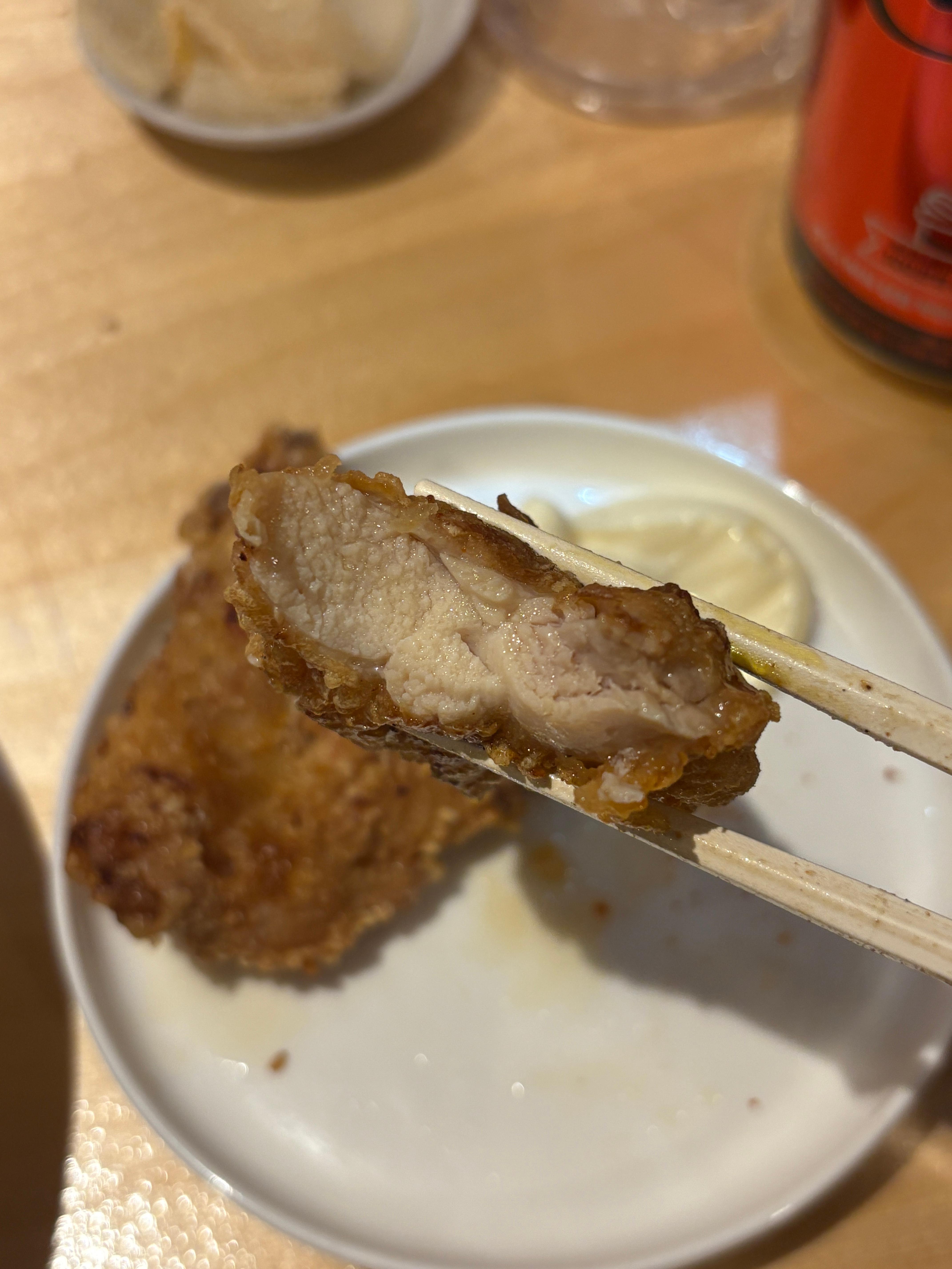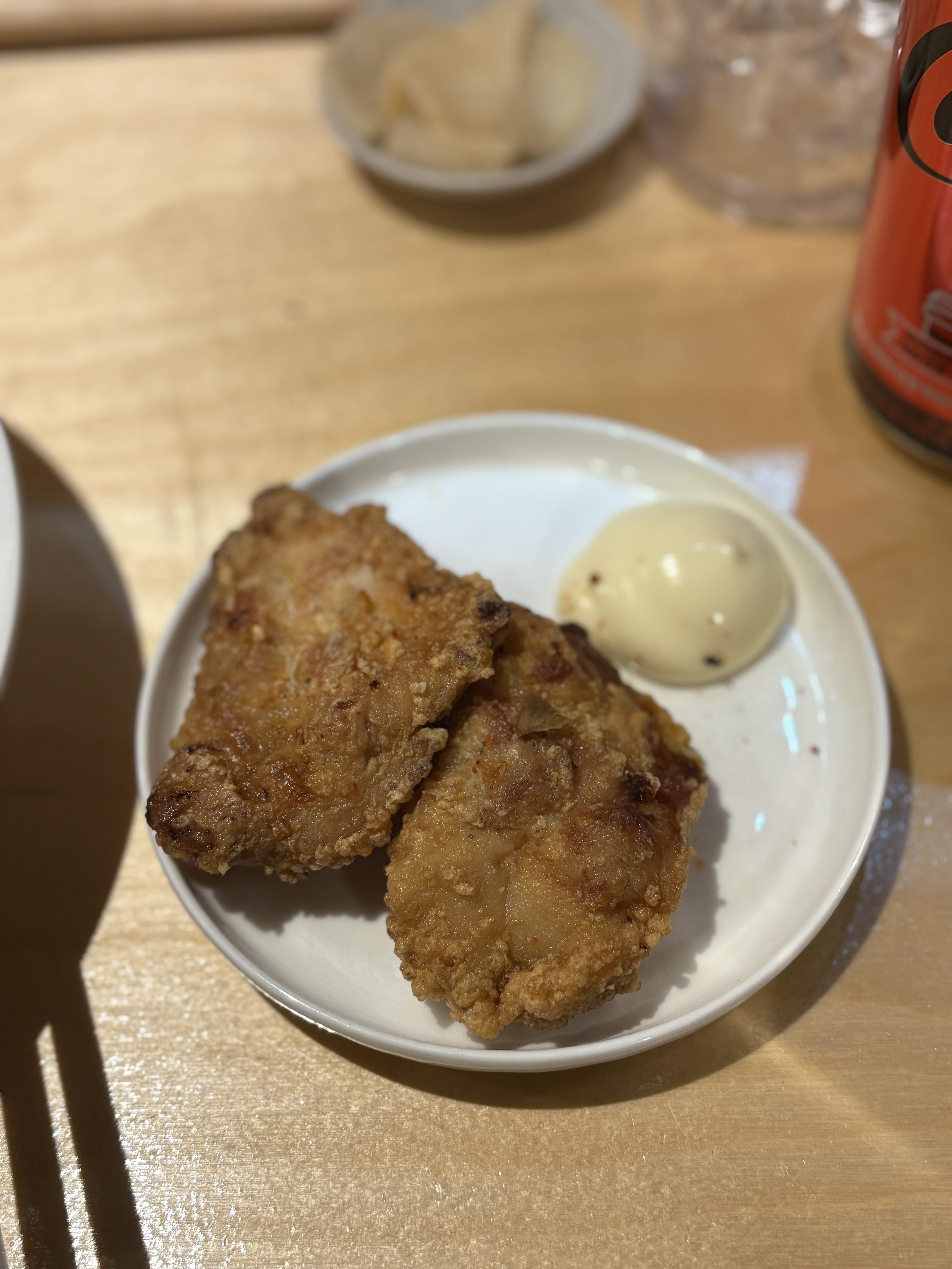음 가라아게는 생각보다 크기가 크지 않아서.. 맛스구에서 먹었던 가라아게보다는 만족감이 적었어요. 그래도 잡내도 안나고 온도감도 좋고, 육질도 부드럽게 잘 튀겨진 가라아게였습니다. 튀김옷도 얇으면서 염도도 잘잡아주셨구요. 레몬향도 스멀스멀.