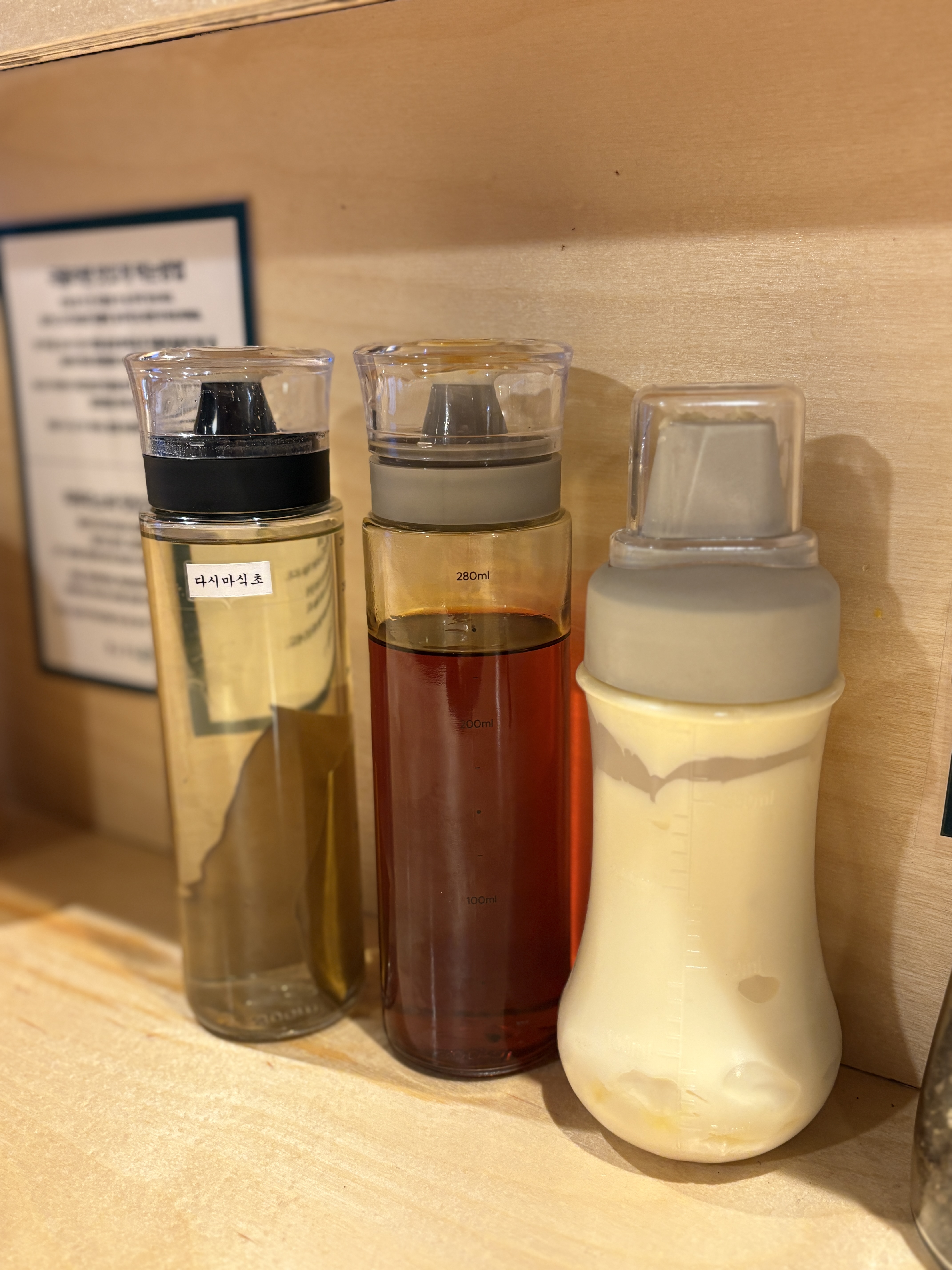 뿌려먹을 수 있는 소스들로는 좌측부터 다시마식초, 고추기름, 마요네즈가 준비되어있습니다. 제가 가장 좋아하는건 다시마식초지만 사장님은 고추기름을 중간에 넣어서 먹어보시길 추천해주시더라구요. 이번에는 못먹었지만 다음에 오면 마요네즈도 넣어서 먹어보고싶습니다. 생각보다 잘어울린다는 반응이 많네요.