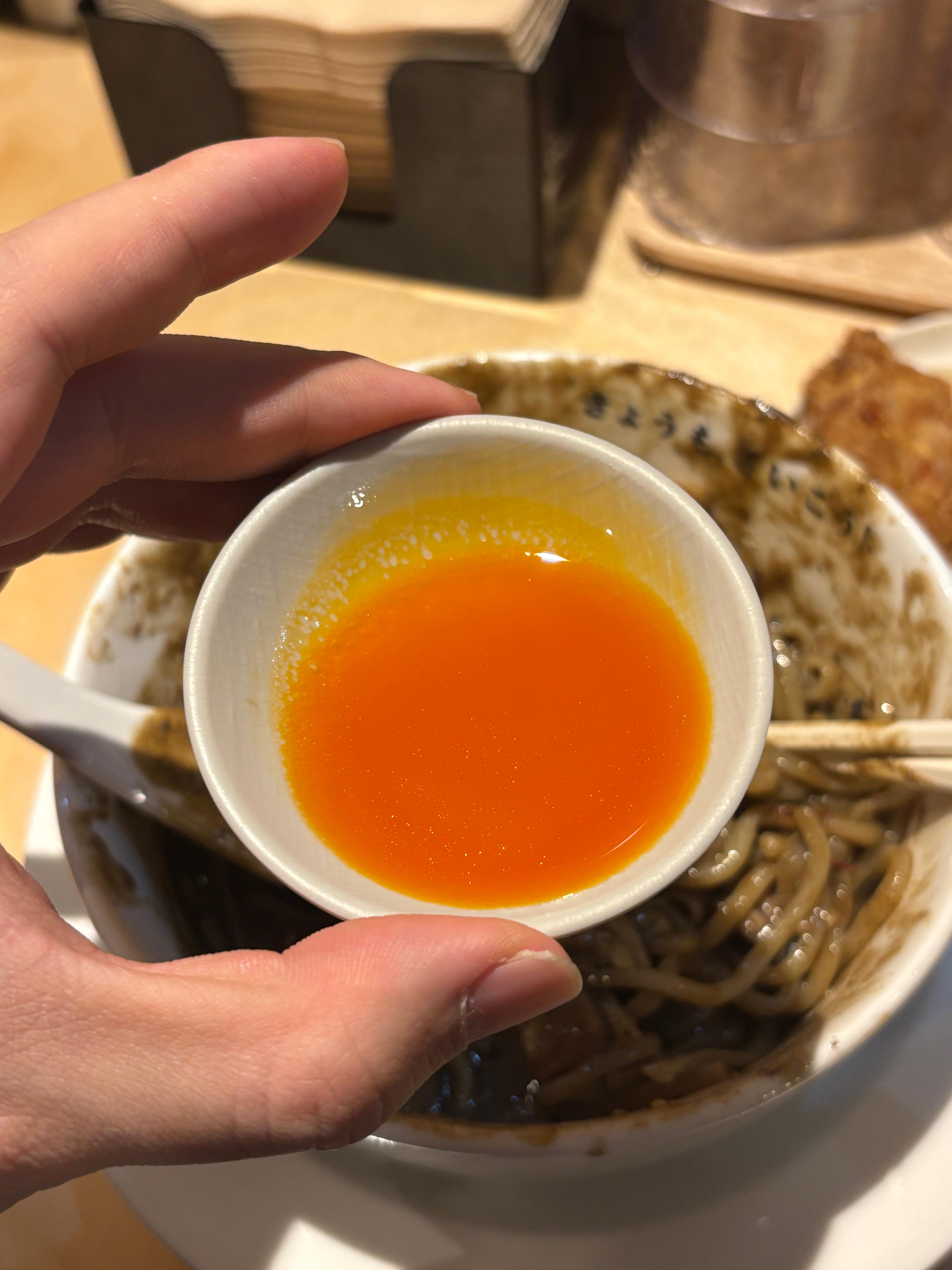 니보시아부라소바를 먹다보면 아무래도 물릴수가있는데 중간에 이 고추기름을 넣어 변주를 주면 매콤함이 살짝 올라오면서 완주에 다가갈 수 있게 됩니다. 전 근데 고추기름보다는 다시마식초를 뿌려먹었을 때가 더 좋긴 했습니다.