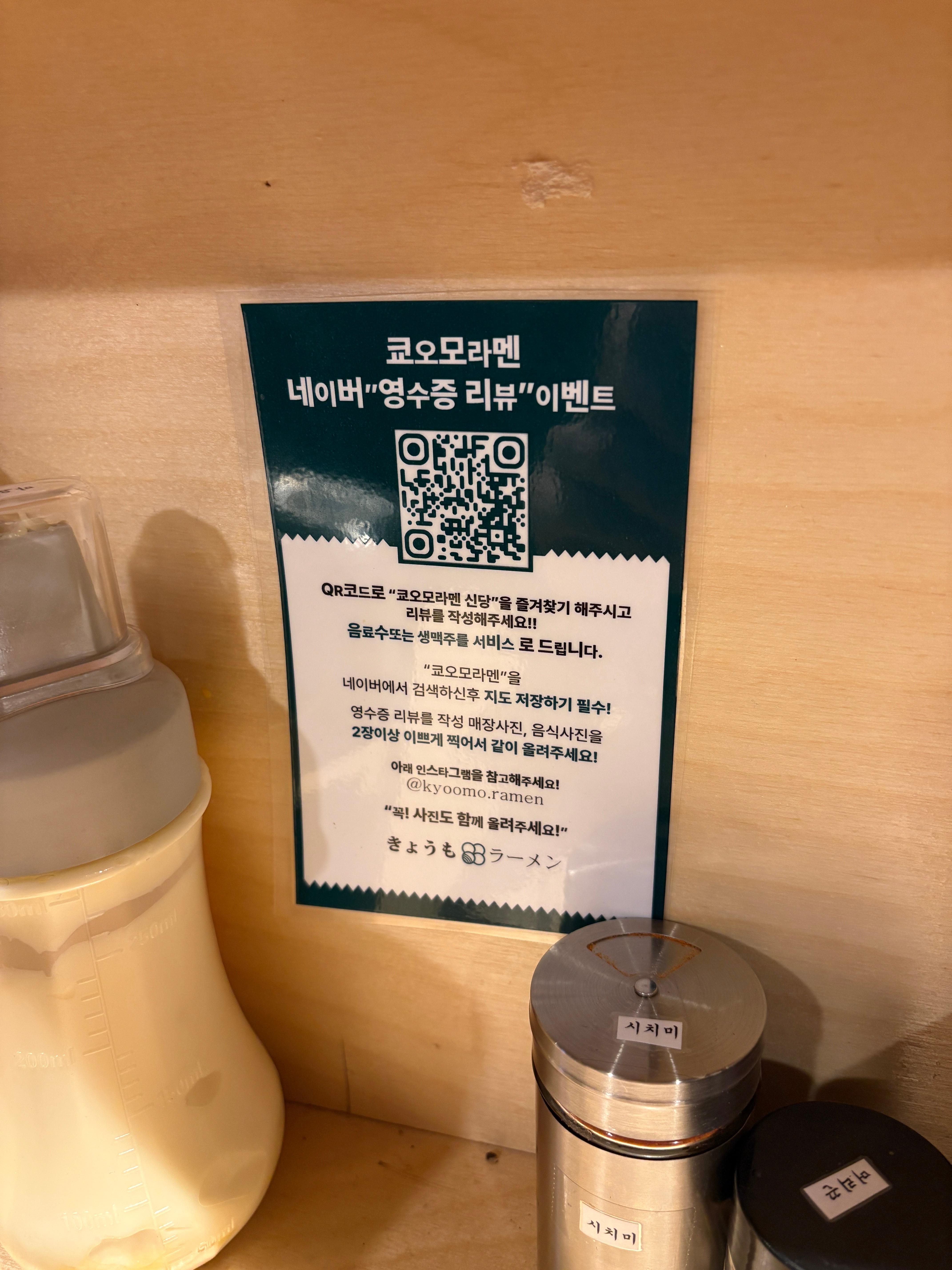 오늘 방문한 쿄오모 라멘은 이번 이벤트 라멘 전까지 솔직히 방문해본 적이 없는 곳입니다. 신당에 위치한 쿄오모 라멘은 제가 근처에서 만족했던 현재 우리나라의 대표적인 담려계 라멘중 하나인 '요아케'와 위치적으로 가깝습니다. 상대적으로 덜 언급되다보니 존재감에 대해서 잘 못느끼고 있었는데, 이번에 올라온 쿄오모 라멘의 이벤트 라멘인 '니보시 아부라소바'를 보고 그 비쥬얼에 충격을 받아 꼭 가보고싶어졌습니다.