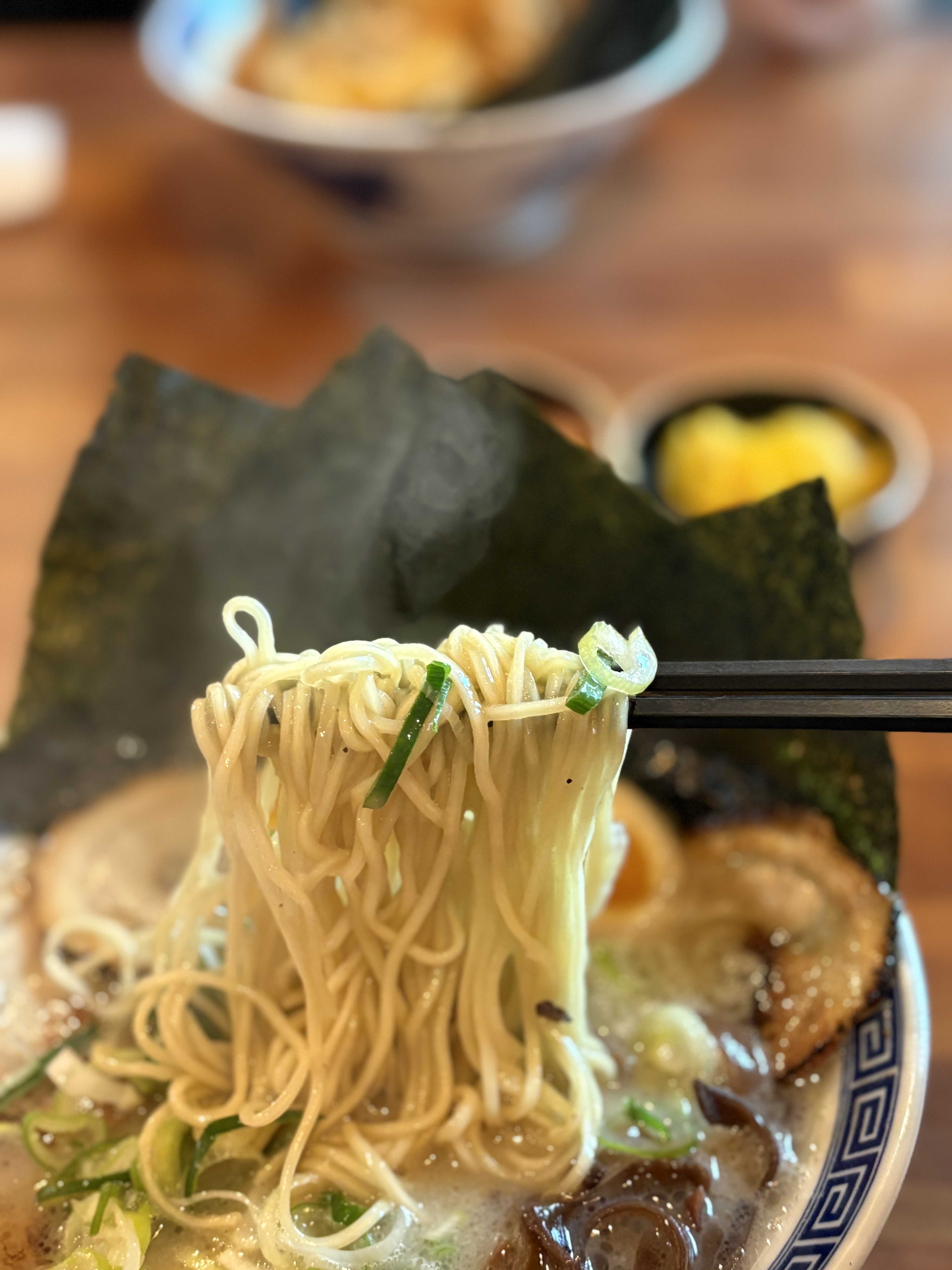 면은 전형적인 호소멘. 하카타 라멘의 호소멘은 기본적으로 삶는 시간이 1분이 채 걸리지 않습니다. 그래서 사실 라멘이 빨리 나올 수 있는 것이기도 하고요. 저는 바리카타를 좋아하지만 따로 말씀드리는 걸 깜박해서.. 그래도 후쯔 정도까진 아닌 코시가 살아있는 면. 역시 하카타 돈코츠에는 이 면이 어울립니다!