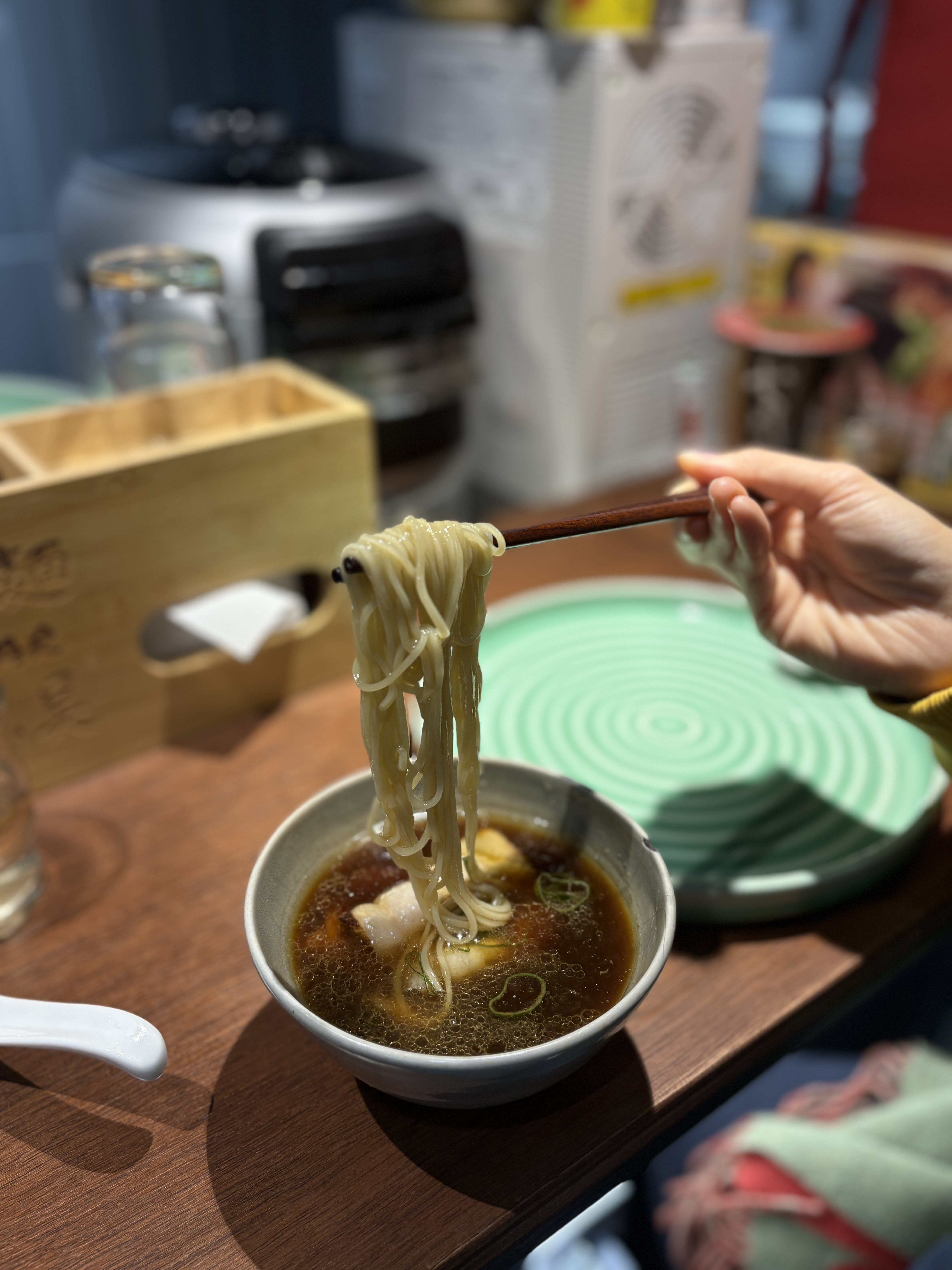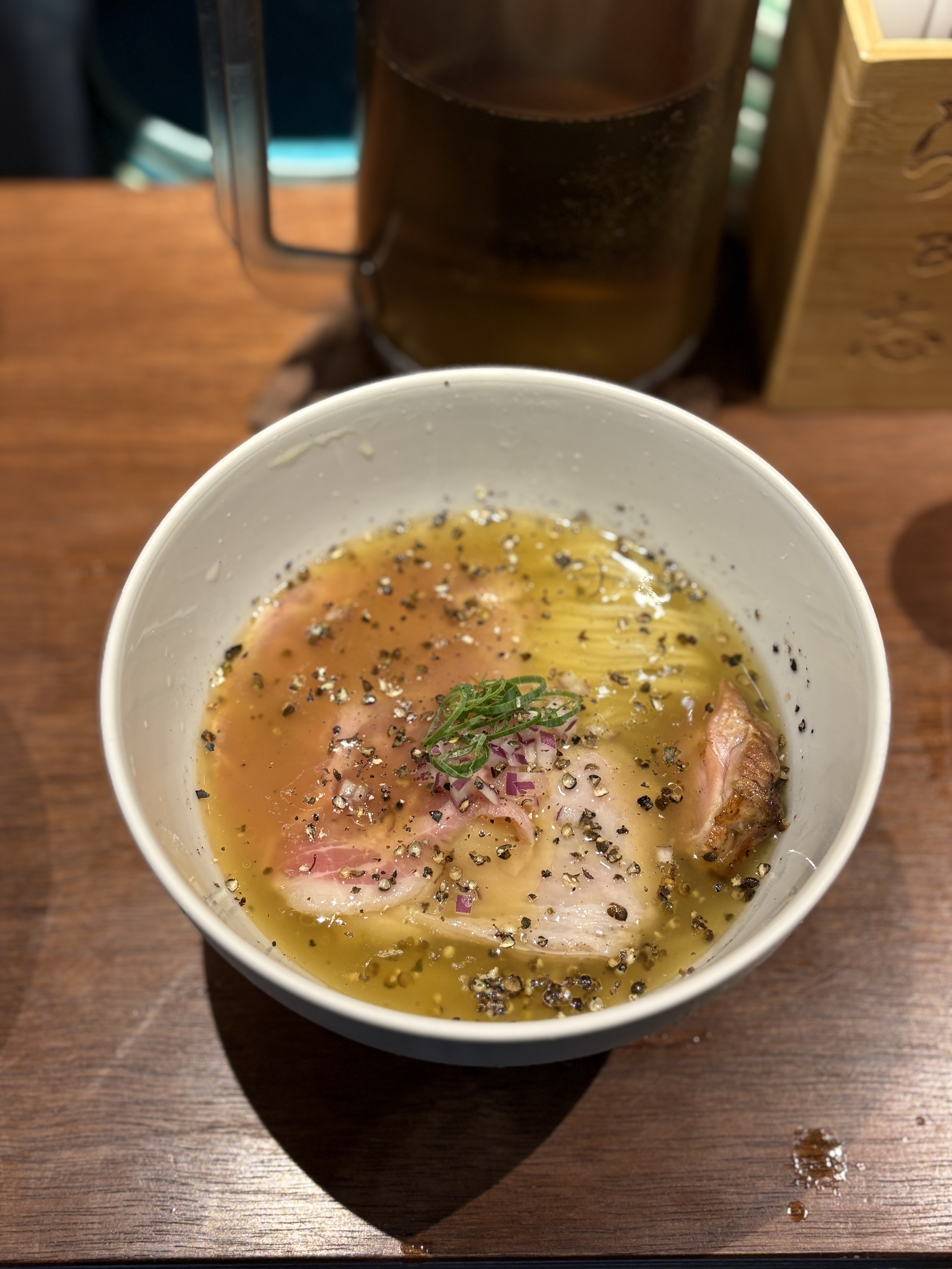드디어 나온 면. 곤부스이에서 향이 강하게 나진 않았고, 말씀하신대로 점도가 거의 없는 곤부스이였습니다. 사장님께 도쿄의 어느 라멘야에서 영감을 받으신건지 정중하게 여쭤보았더니 제가 가보지 못한 '우초쿠'라고 하시더라구요. 사진상 우초쿠는 전립분면을 사용한거 같은데 나중에 도쿄가서 직접 먹어보고 맛을 비교해보는 것도 좋을 듯 합니다. 우초쿠는 라임 슬라이스를 내어주시는데 여긴 레몬이군요. 식후에 입가심 용도로도 쓰이고, 은은하게 레몬향이 곤부스이에 스며들어서 좋은 것 같아요. 시코우 사장님이 이런 과일향 디테일을 좋아하시는 것 같더라구요.