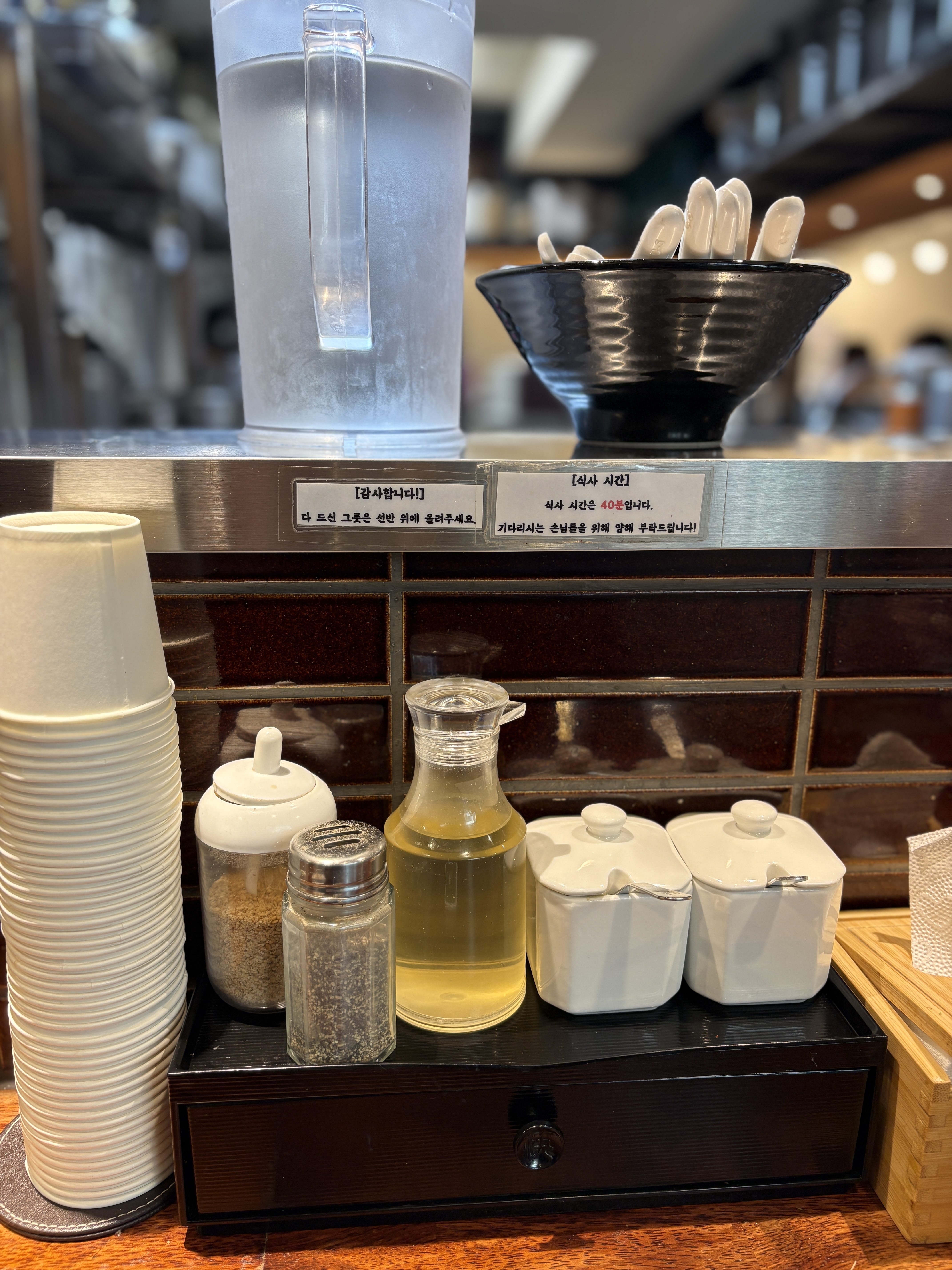 하쿠텐은 국내에서 이에케를 가장 먼저 유행시킨 곳이자, 가장 인기가 많은 곳인만큼 일하고 계신 직원분의 수도 많습니다. 정신없이 돌아가는 주방에 일사분란하게 맡은 일을 하며 움직이는 직원분들의 열정이 느껴지는 곳입니다. 테이블석 1개를 제외한 나머지 모든 좌석은 다찌석으로 이루어져 있고, 큰 ㄷ 자 형태의 좌석에 다찌 높이가 높아서 부끄러움 많은 분들도 여유롭게 혼자서 라멘을 즐길 수 있는 구조입니다.