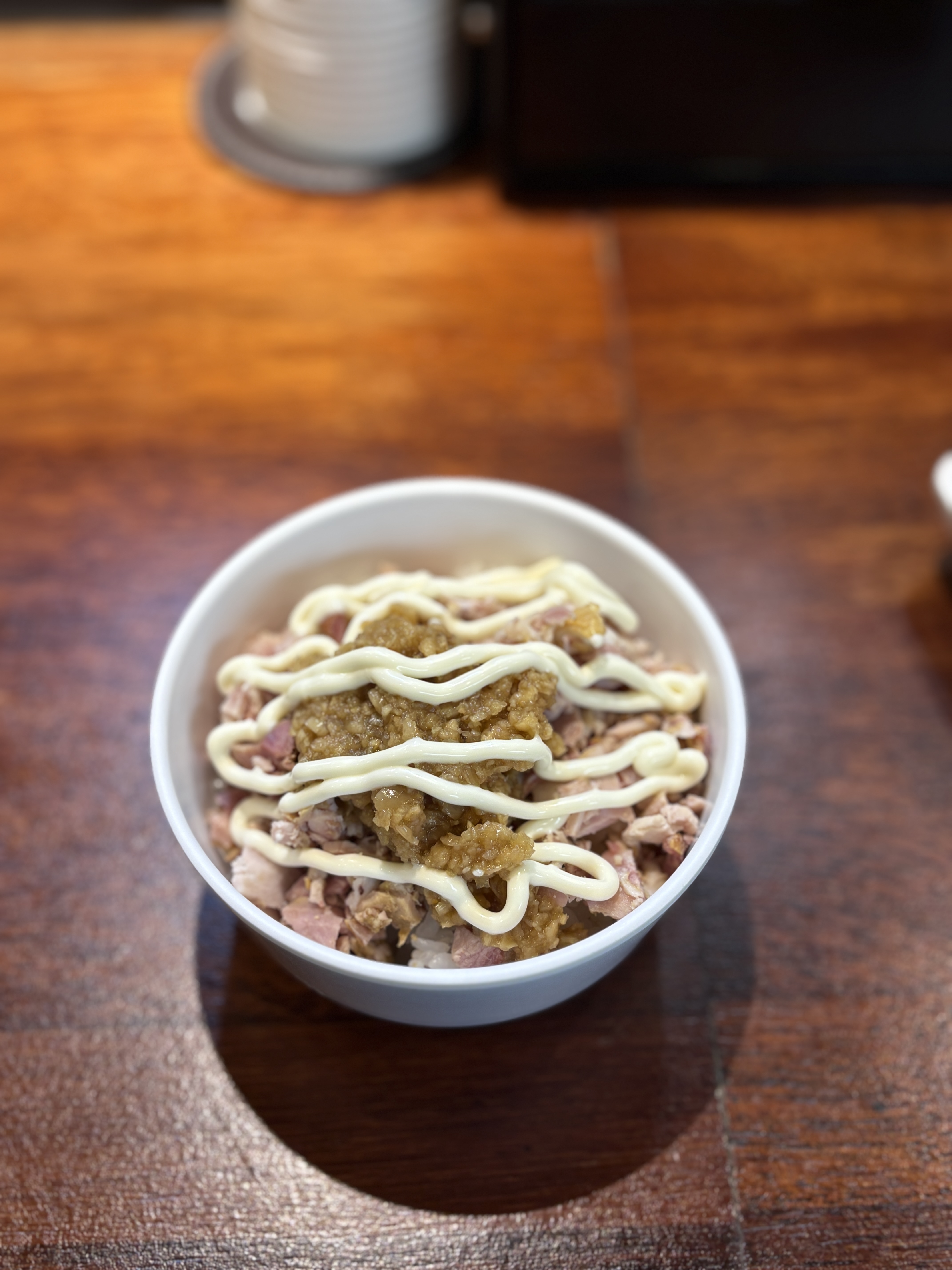 마늘양념과 차슈, 밥, 그리고 마요네즈를 이용해서 셀프 차슈동을 만들어 먹습니다. 이대로 먹는것도 좋지만 이에케라멘을 먹는 방법은 라멘이 나올 때까지 기다렸다가 스프를 두스푼 정도 넣고, 김에 싸서 먹는게 제맛입니다 ㅎㅎ