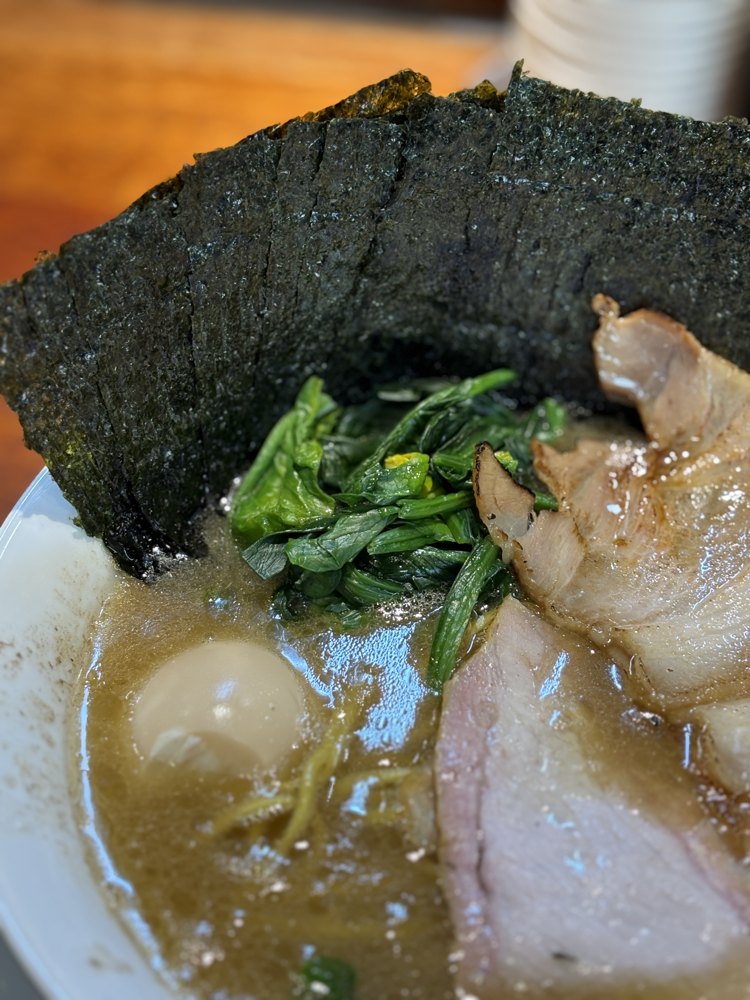 드디어 자태를 드러낸 영롱한 하쿠텐의 이에케라멘.. 김추가도 했습니다. 삼겹차슈는 원래 저렇게 플레이팅 되어있진 않고 제가 임의로 올려보았습니다. 제가 선택한 옵션은 염도 보통 / 면은 꼬들하게 / 기름은 많이. 흔히 말하는 '보꼬진'