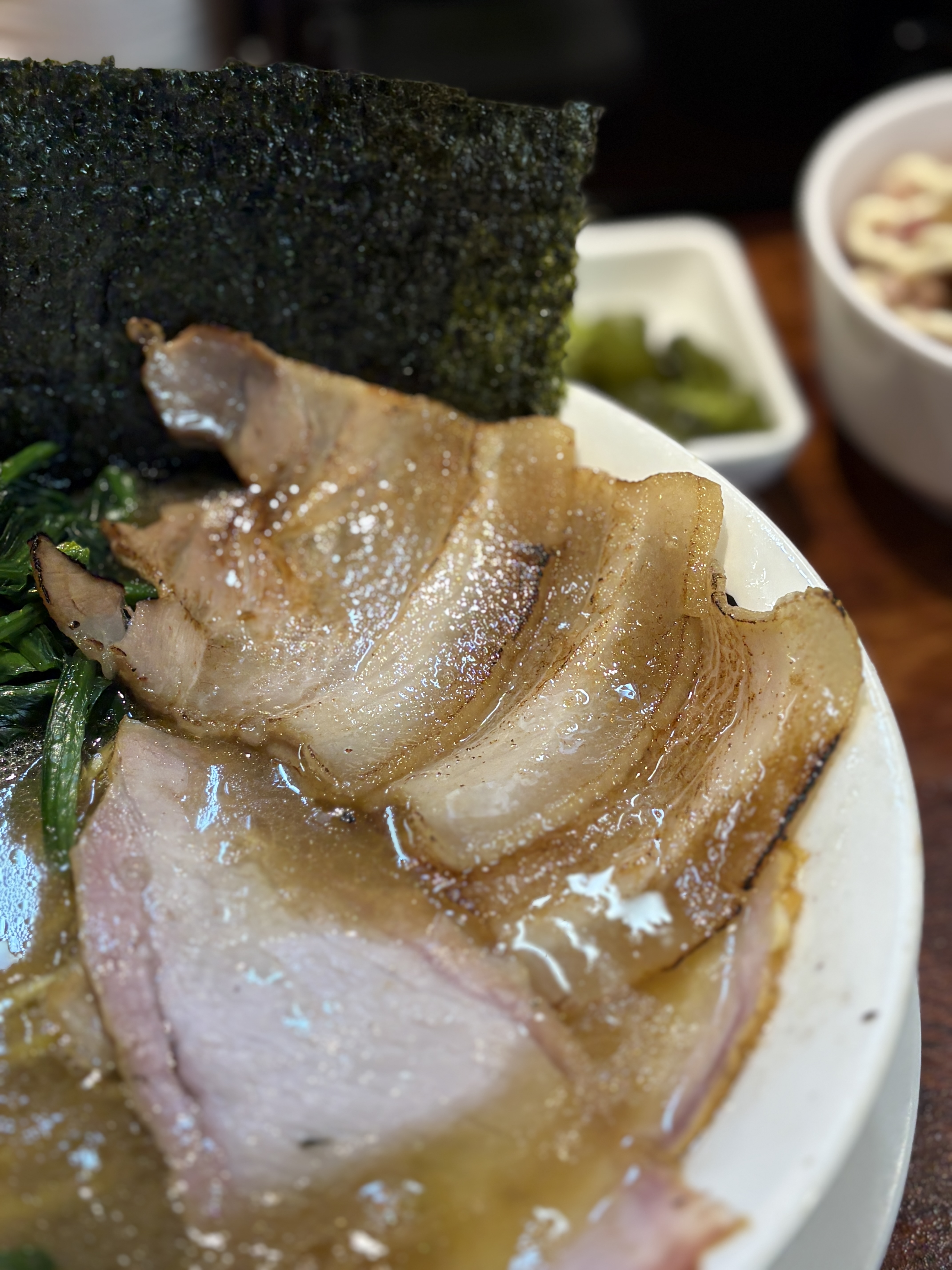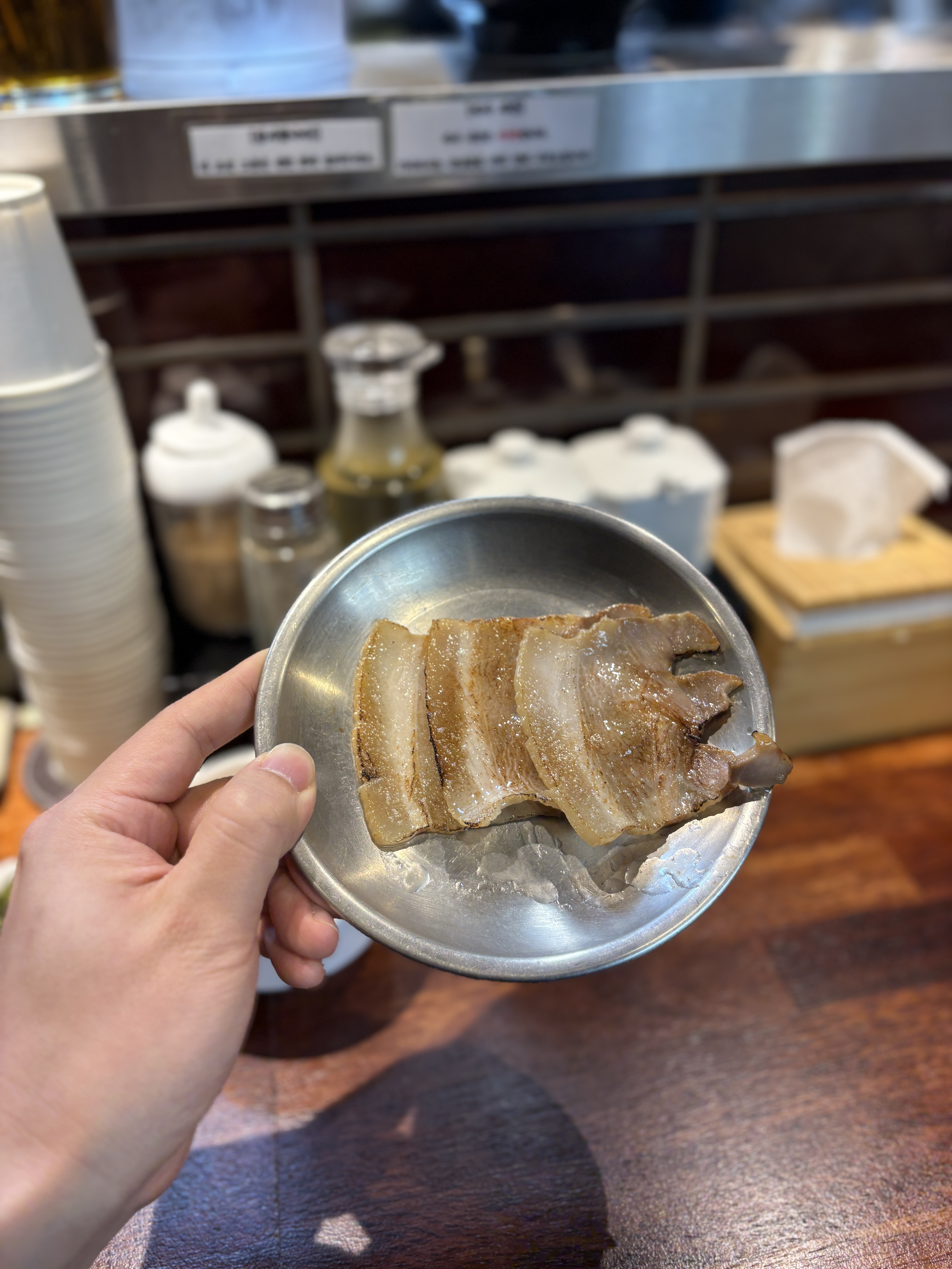 추가한 삼겹차슈. 머스트 픽은 아니지만 이날은 첫끼니인만큼 단백질을 챙기기로 했습니다 ㅎㅎ 원래 두장주시는데 크기가 작다고 세장 챙겨주신 센스!