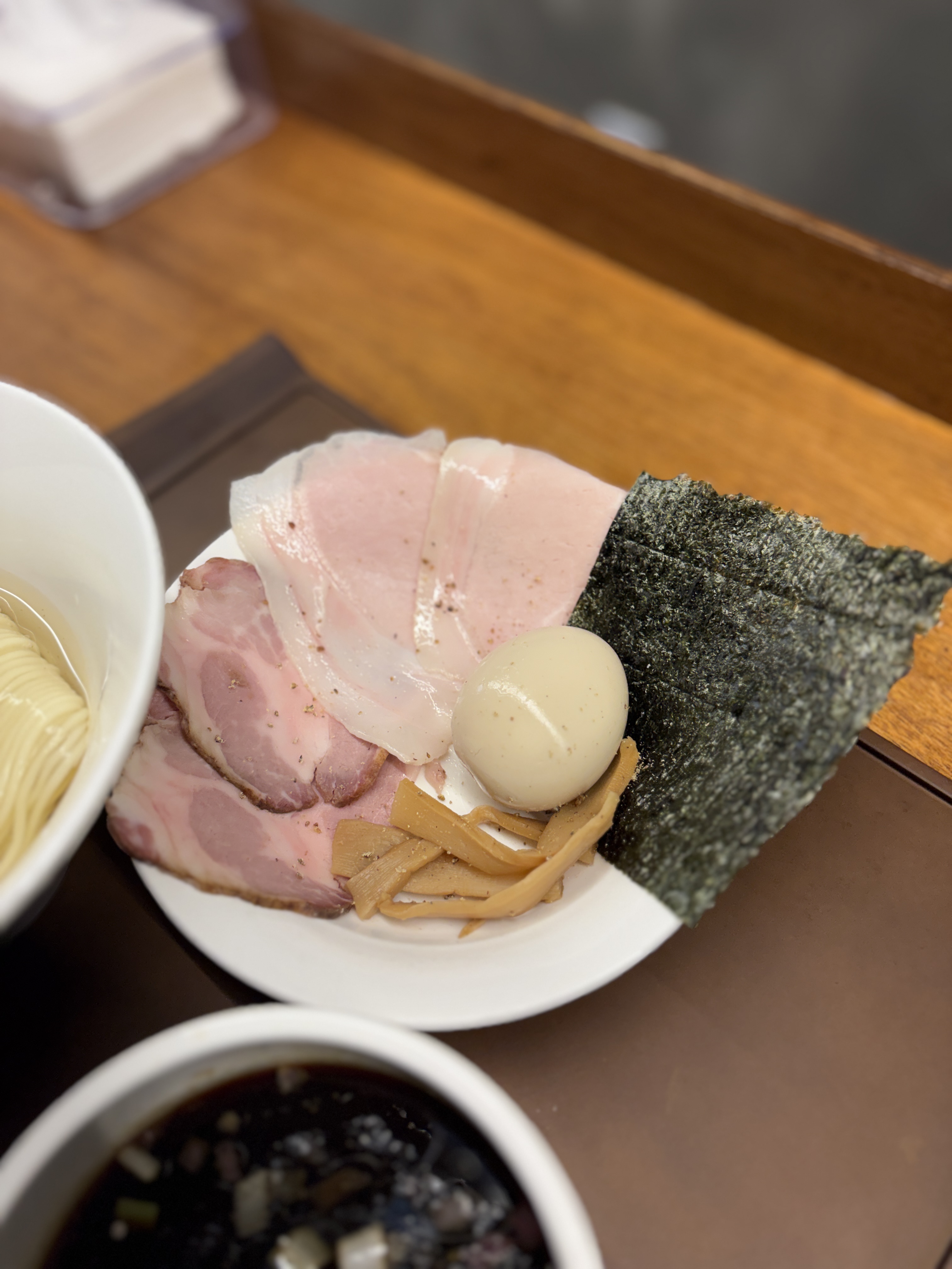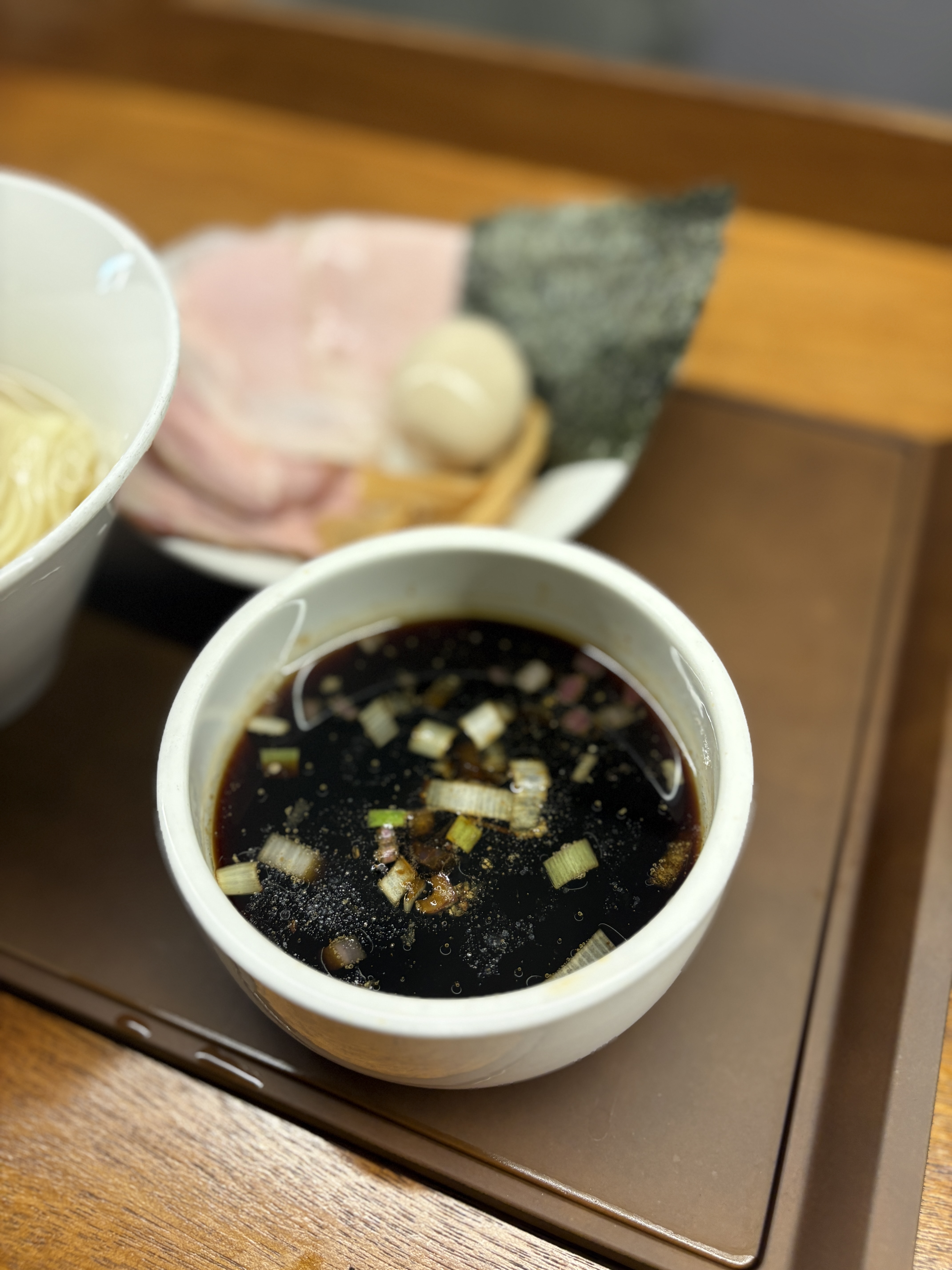 이건 다른 날 방문하여 맛 본 멘큐단의 시그니쳐 '곤부스이 츠케멘', 쇼유로 주문했습니다. 담음새도 너무 아릅답습니다. 곤부스이 츠케멘들이 그러하듯이 차슈, 멘마, 아지타마고등의 토핑은 따로 접시에 서브됩니다.