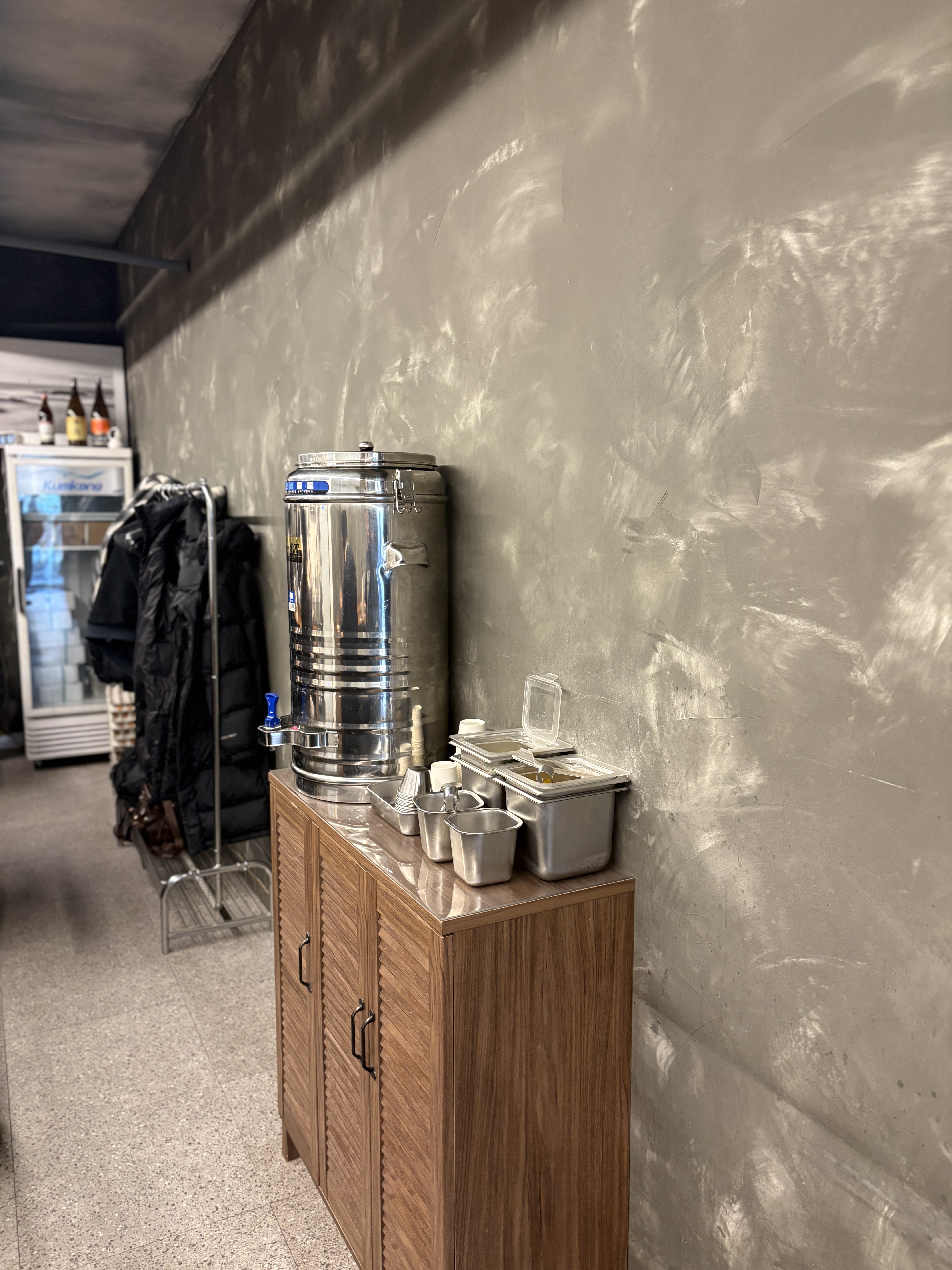 우측 벽면에는 물을 따라먹을 수 있는 통과 셀프 반찬 바가 있습니다. 요즘들어 점점 라멘집을 찾으면 반찬은 잘 안먹게되는 것 같아요. 본연의 맛에 집중하고 싶다...랄까..