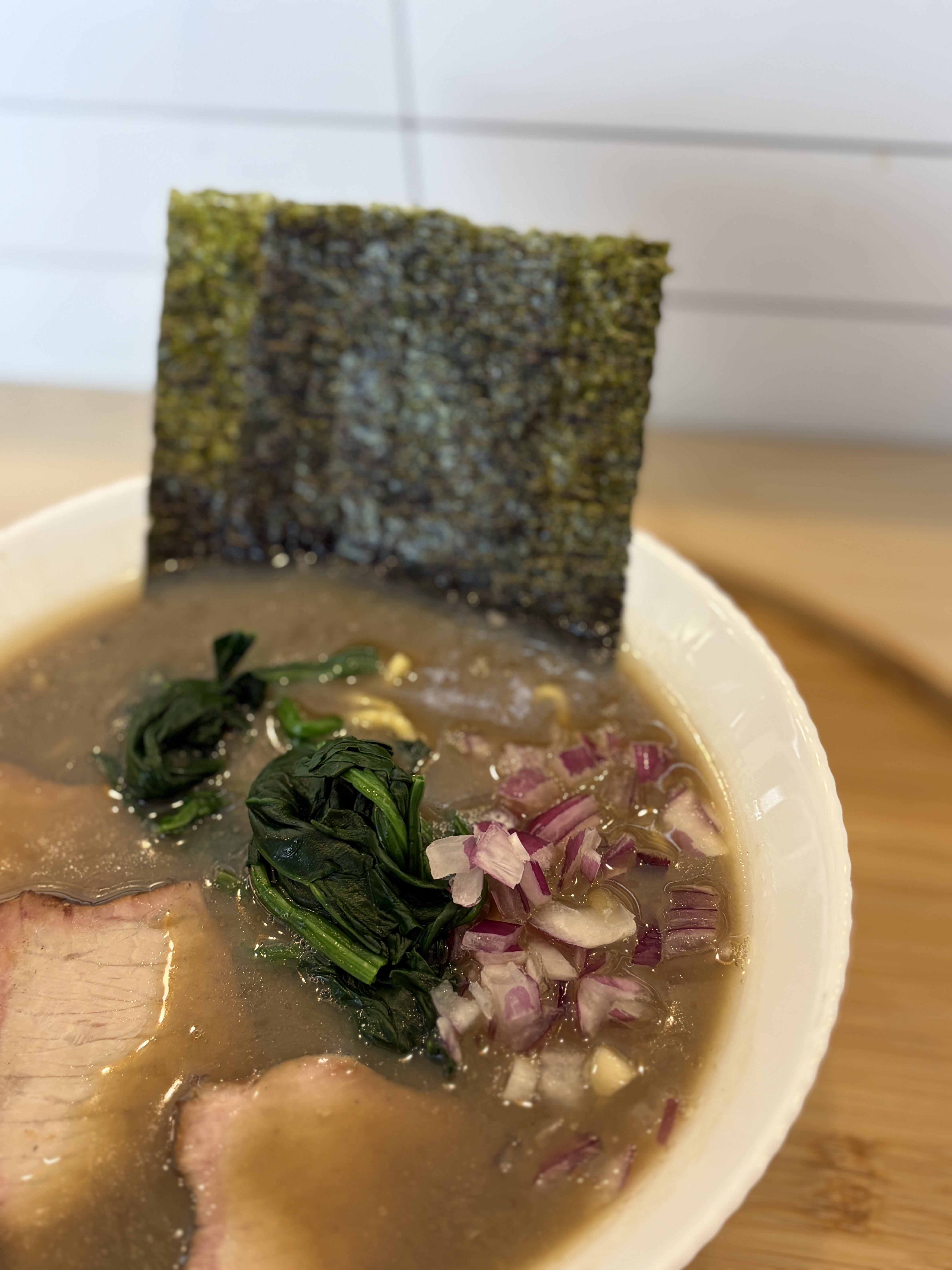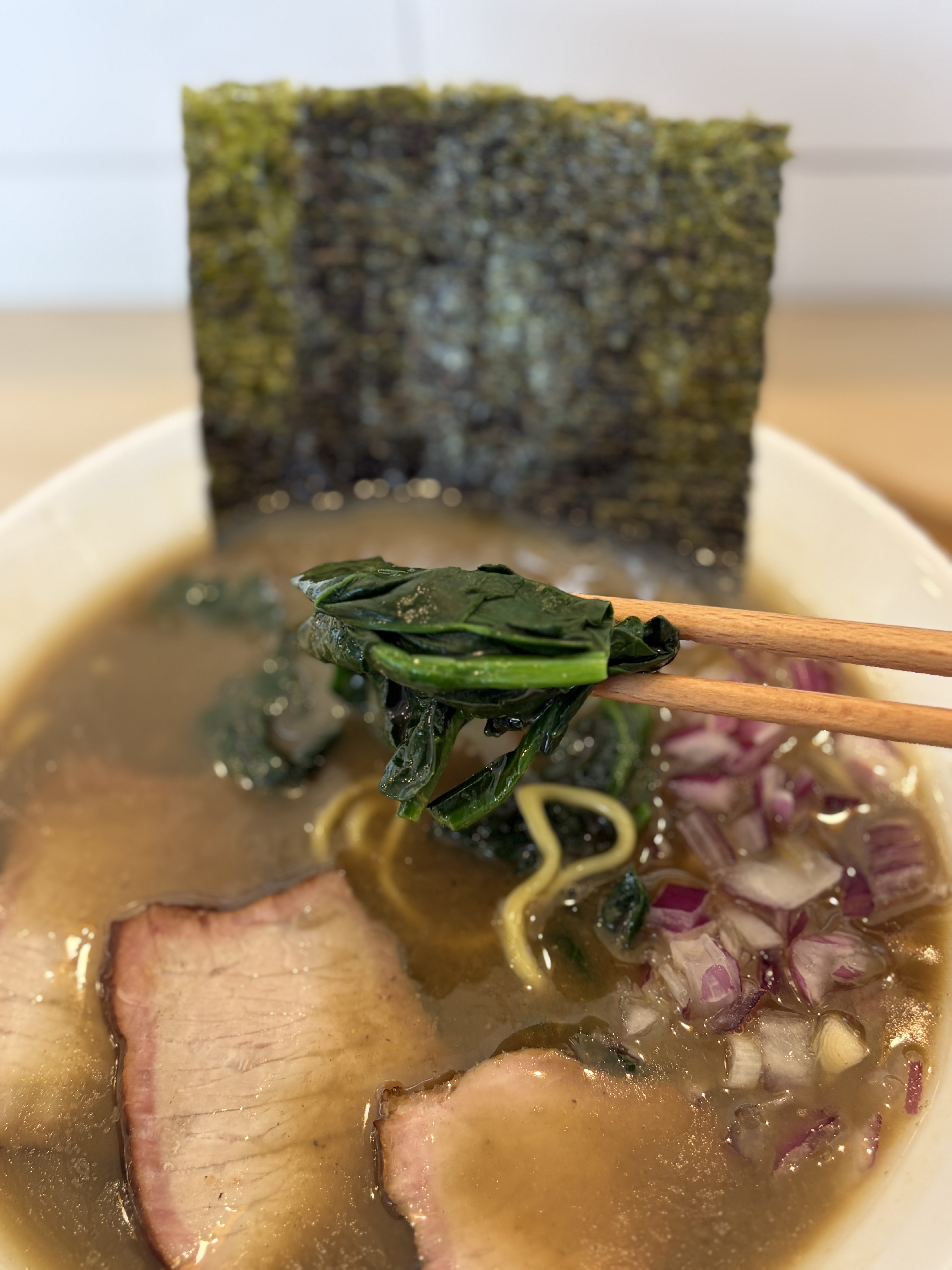 무엇보다 특이했던 것은 차슈 모양인데요, 대부분의 이에케 집에서는 훈연 차슈를 얇게 슬라이스해서 내주시는 편인데 이곳은 중식에서나 볼 법한 호방한 두께의 차슈를 볼 수 있습니다. 단면도 제가 경험했던 다른 이에케 라멘 차슈들의 단면과는 다릅니다. 강하게 겉면을 훈연하고 낮은 온도에서 한번 더 오랜시간 익혀내서 그런지 명확한 경계가 관찰되네요.