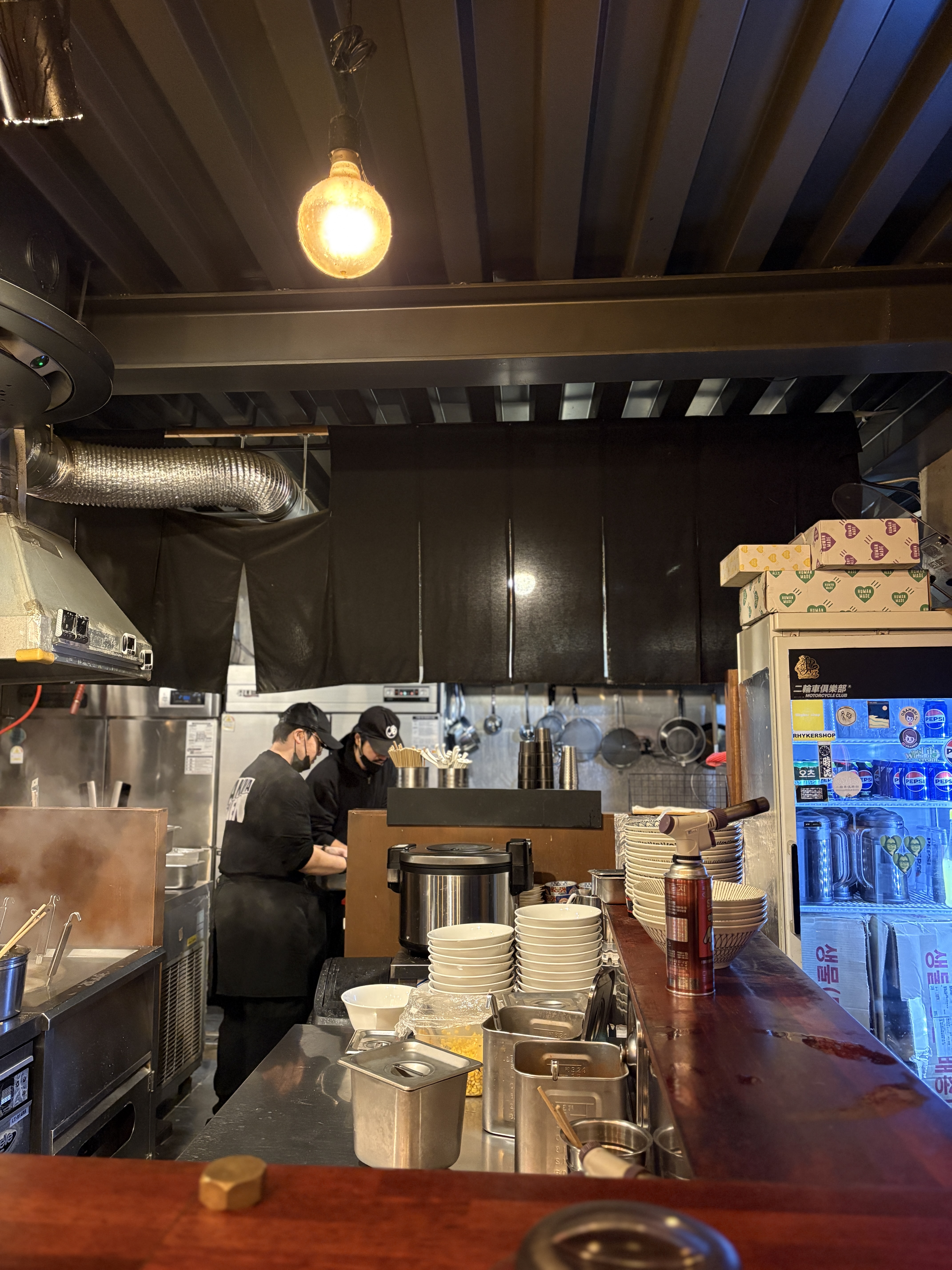 삿포로식 미소라멘은 웍에서 강한불이 빠르게 볶아낸 숙주의 맛이 굉장히 중요한 터라 후드가 높이 설치된 안쪽 주방에서 볶아주십니다. 직원분은 밑 세팅을 하시고 사장님은 숙주를 동시에 볶아내시어 가장 완벽한 온도에서 서빙됩니다.