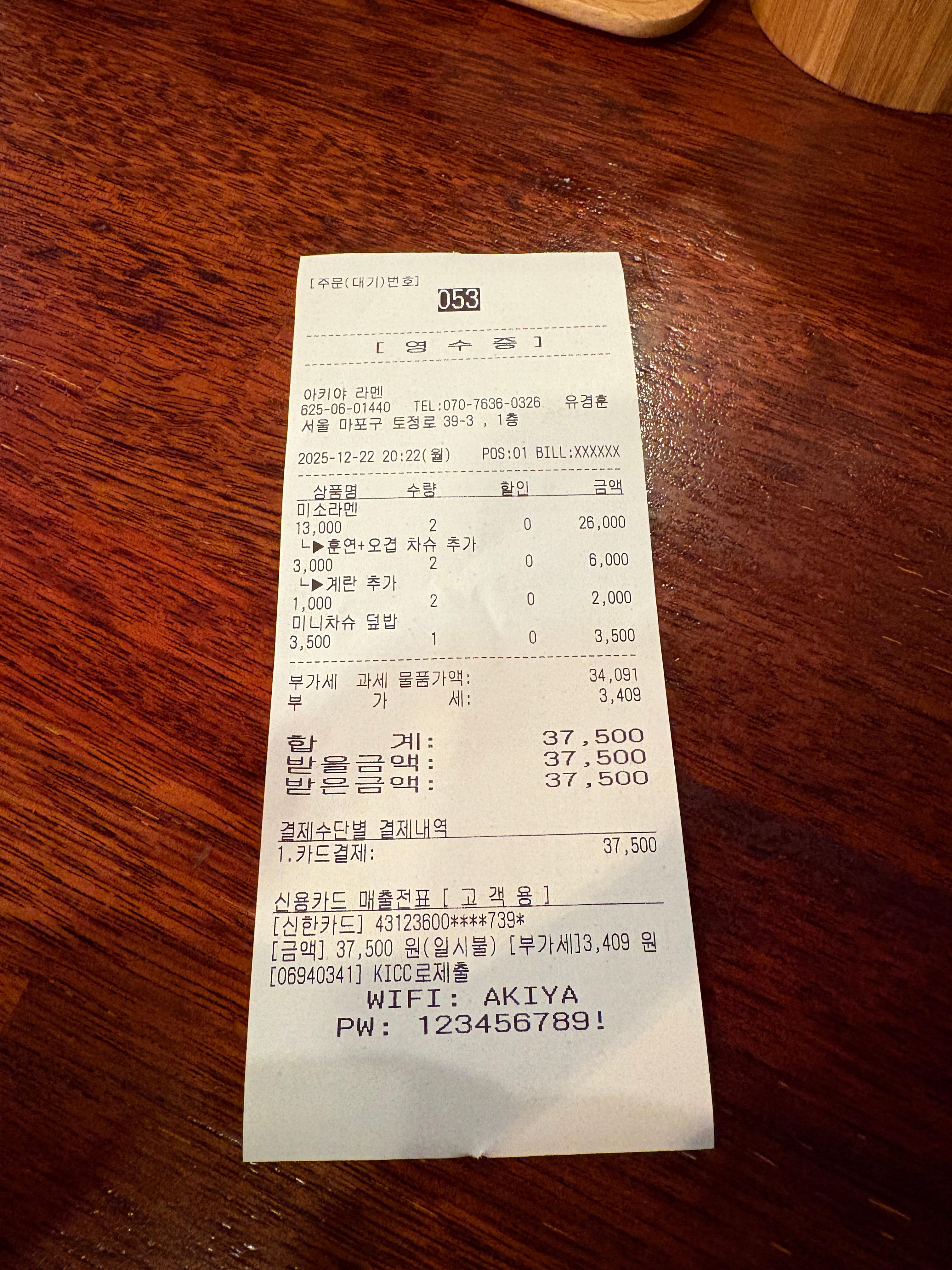 날씨가 추워져 오랜만에 간절히 맛있는 미소라멘이 먹고싶어 방문한 아키야라멘. 첫 방문때도 만족했지만 재방문에서도 매우 높은 만족도를 주었습니다. 앞으로도 삿포로식 미소라멘이 먹고싶을 때 자연스럽게 합정역으로 발길이 갈 것 같은 기분..