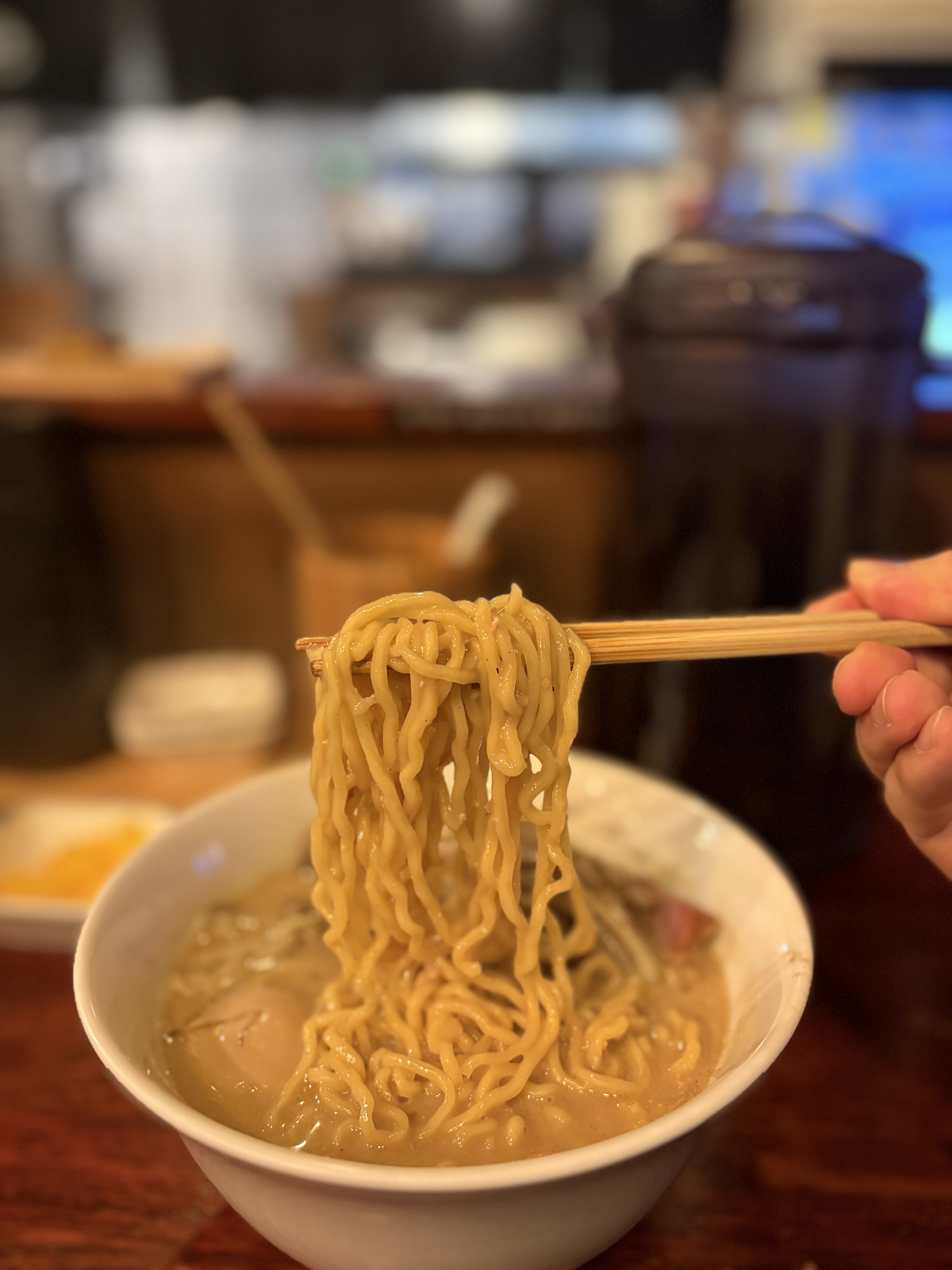역시 미소라멘에는 치지레멘이죠. 두터우면서도 구불구불한 면이 미소 스프를 잔뜩 머금고 딸려올라와 면발을 먹는데도 스프를 퍼먹는 기분을 느끼게 해줍니다. 구불구불하다보니 빨아들일때 입술을 통과하면서 입안 내부 여러곳을 휘몰아치듯 자극하면서 빨려들어와서 더욱 만족감이 높아요. 조금씩 먹어도 포만감이 충만한 느낌.