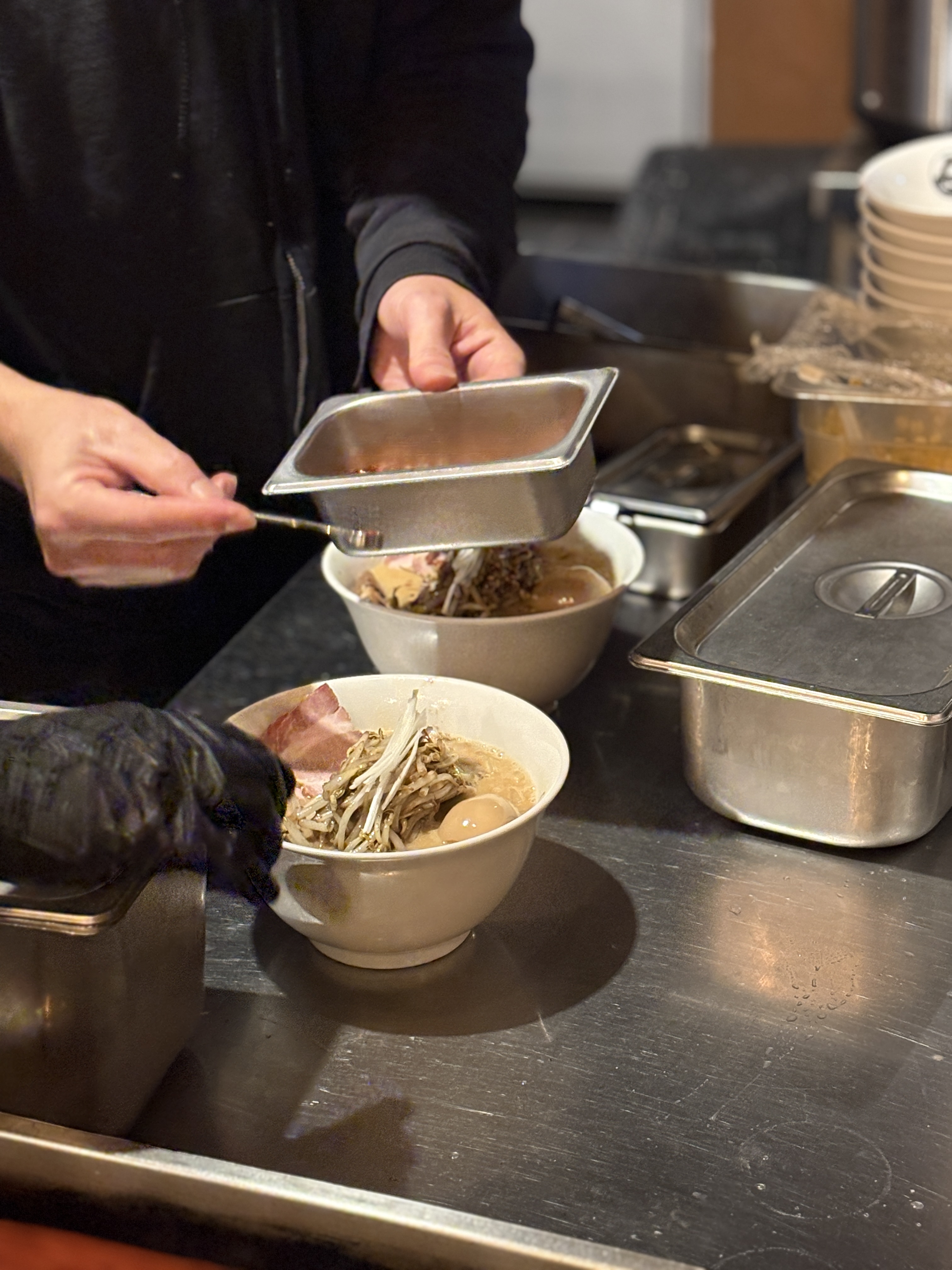 합이 잘 맞는 직원분과 사장님의 능숙한 손놀림으로 삿포로식 오리지널 미소라멘이 금새 완성됩니다. 벌써부터 코끝을 자극하는 볶음 숙주의 냄새와 미소의 달큰하면서도 진득한 향이 식욕을 자극합니다.