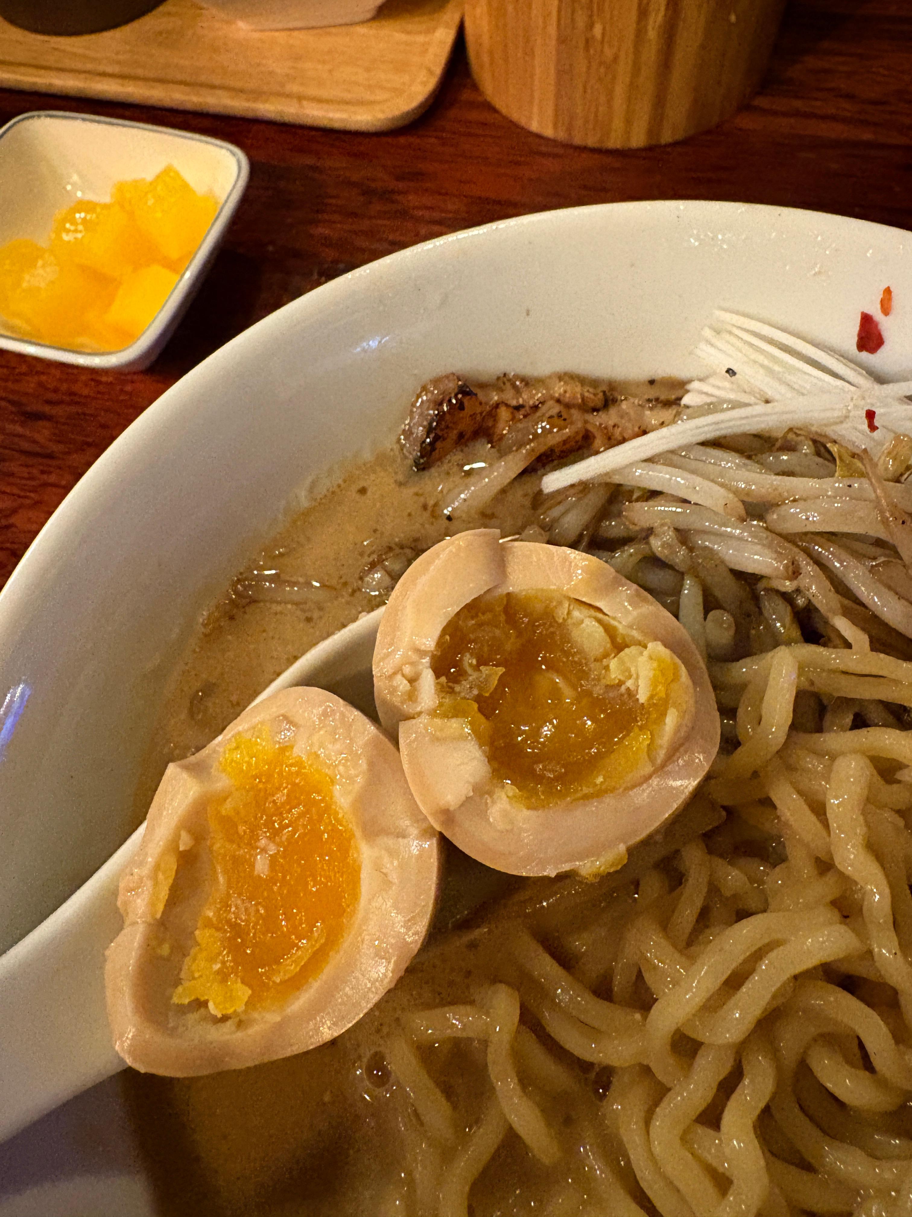 아지타마고는 젤라틴화 잘된 정석같은 맛. 추가하길 잘했습니다. 청탕을 먹을 때는 이상하게 아지타마고가 그렇게 안땡기는데 미소라멘이나 돈코츠에서는 땡긴다는 ㅎㅎ 아마도 걸쭉한 스프때문인 것 같습니다.