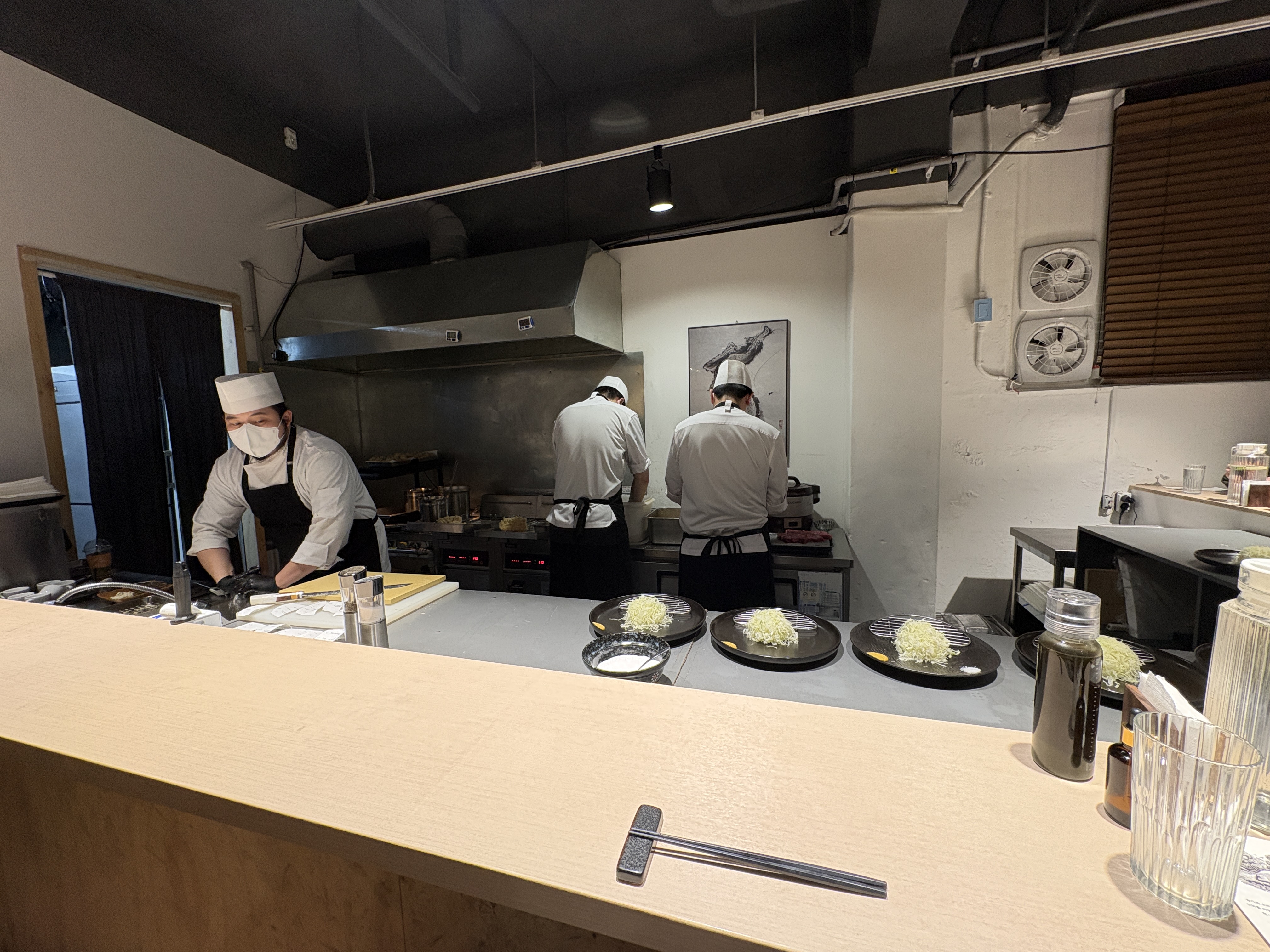 바 테이블의 장점인 오픈 키친을 바로 눈앞에서 볼 수 있는 이 뷰. 교카이젠은 저온 조리 방식으로 100도에서 한번 찌듯이 고기를 익힌 후에 저온에서 튀겨 마무리하는 방식을 가지고 있습니다.